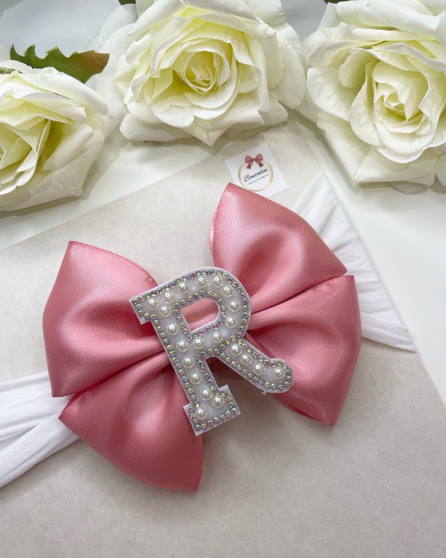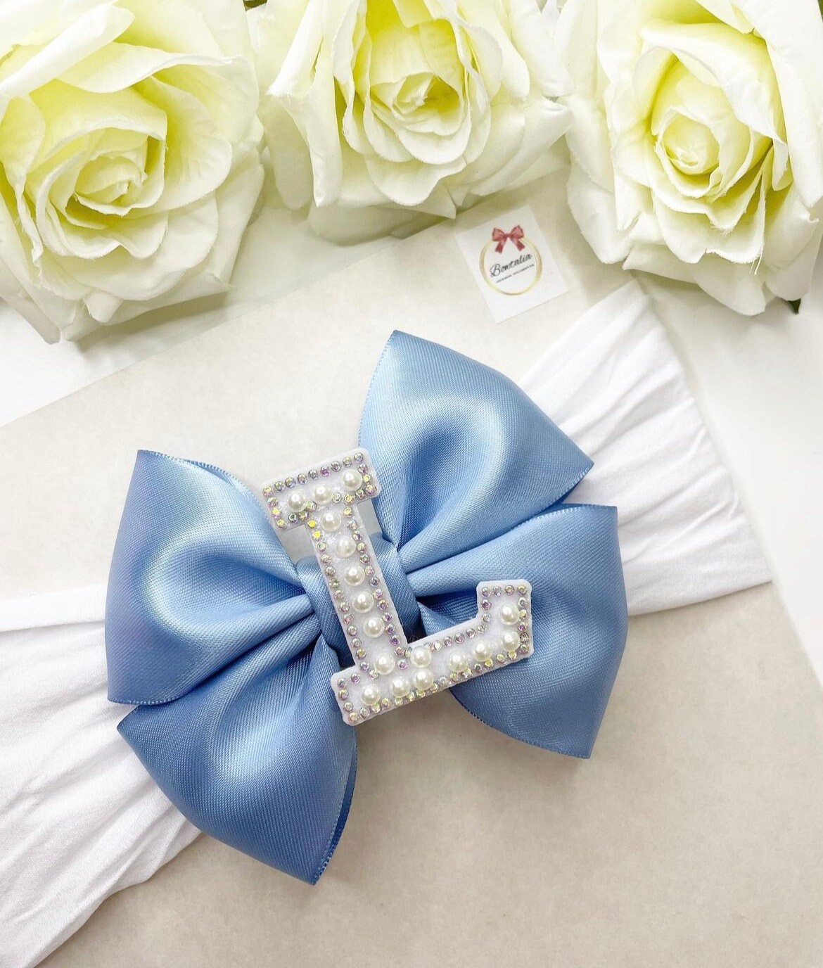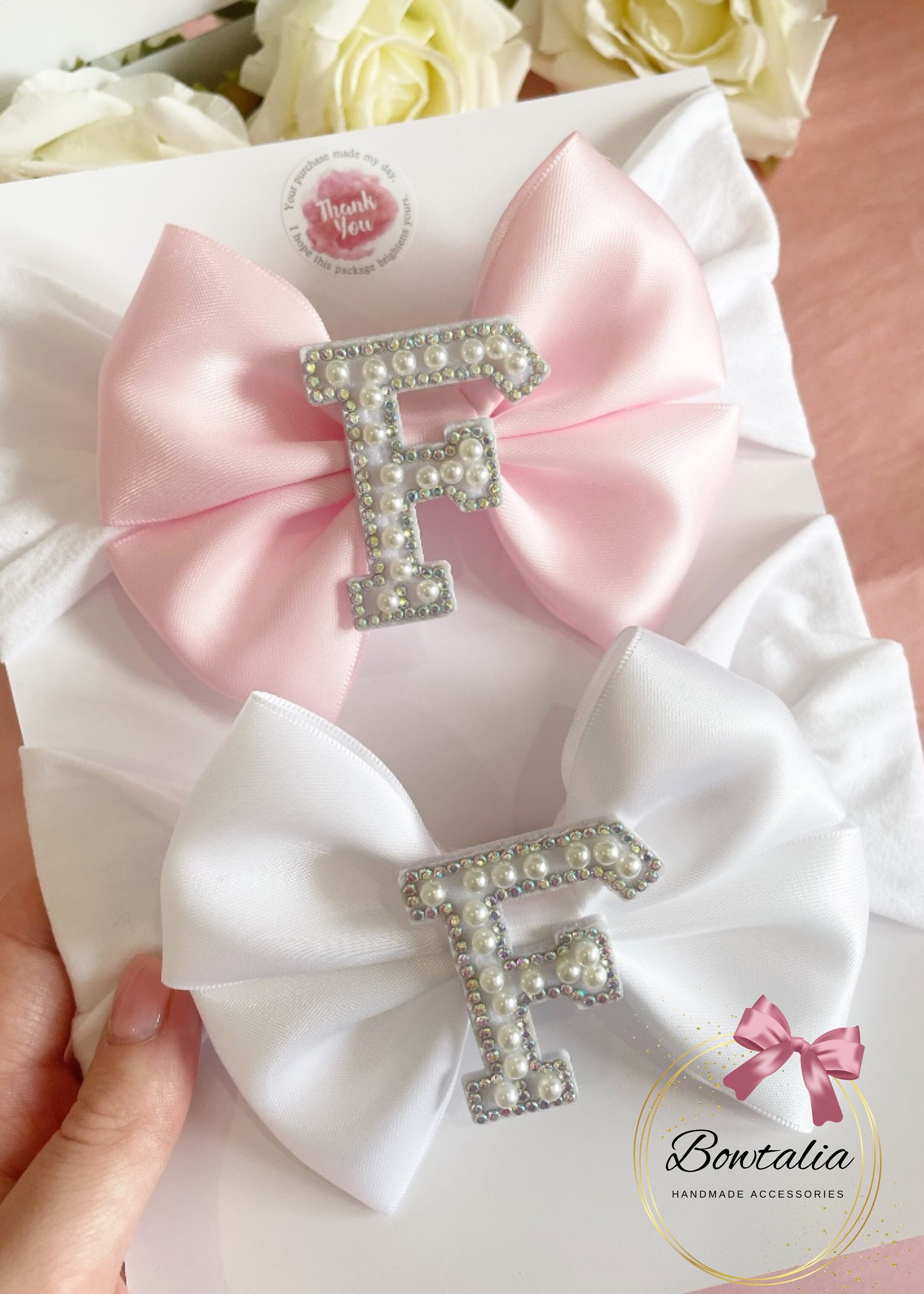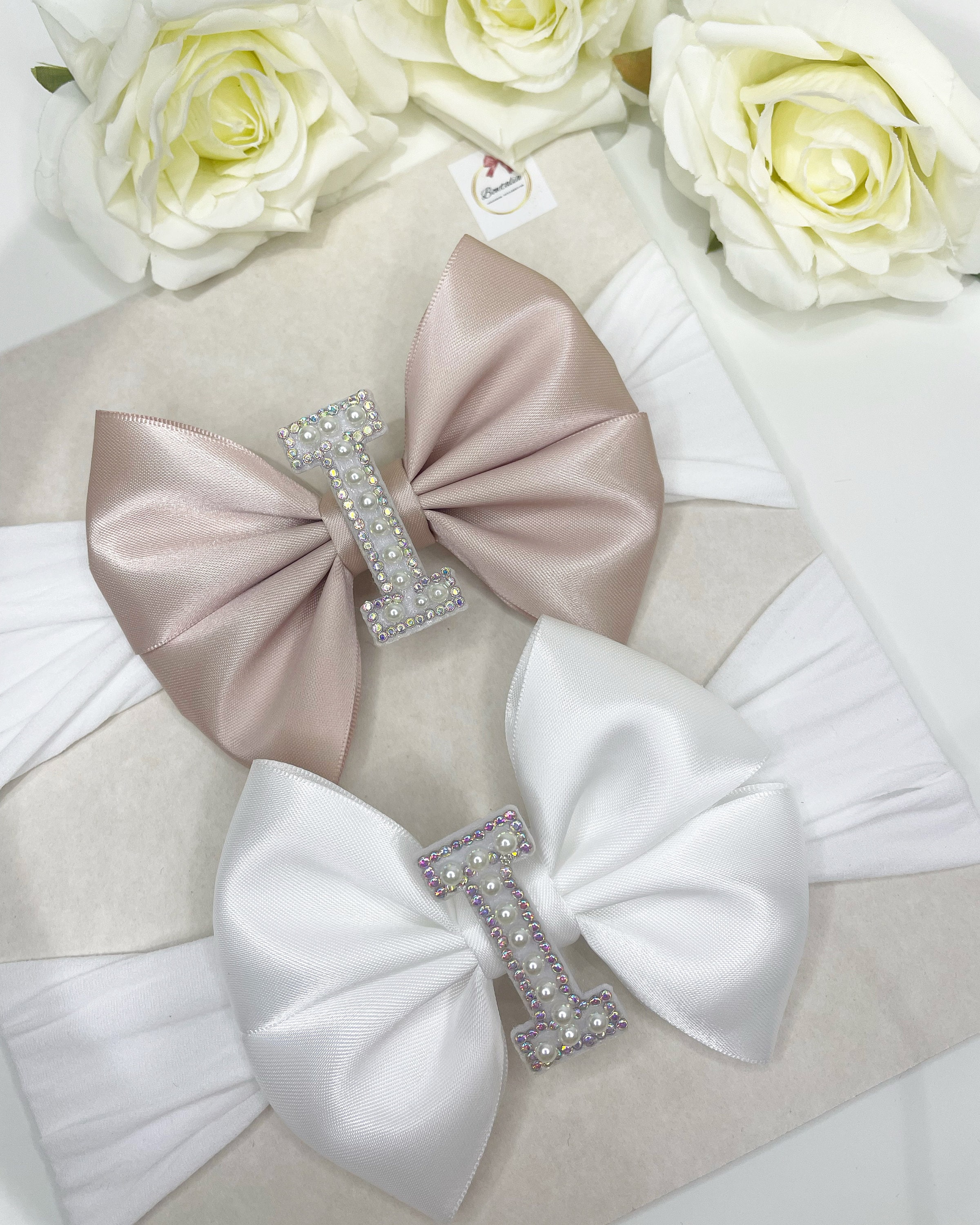 A beautiful handmade bow with a Pearl initial centre on a thick white nylon headband. So pretty to accessorise an outfit.