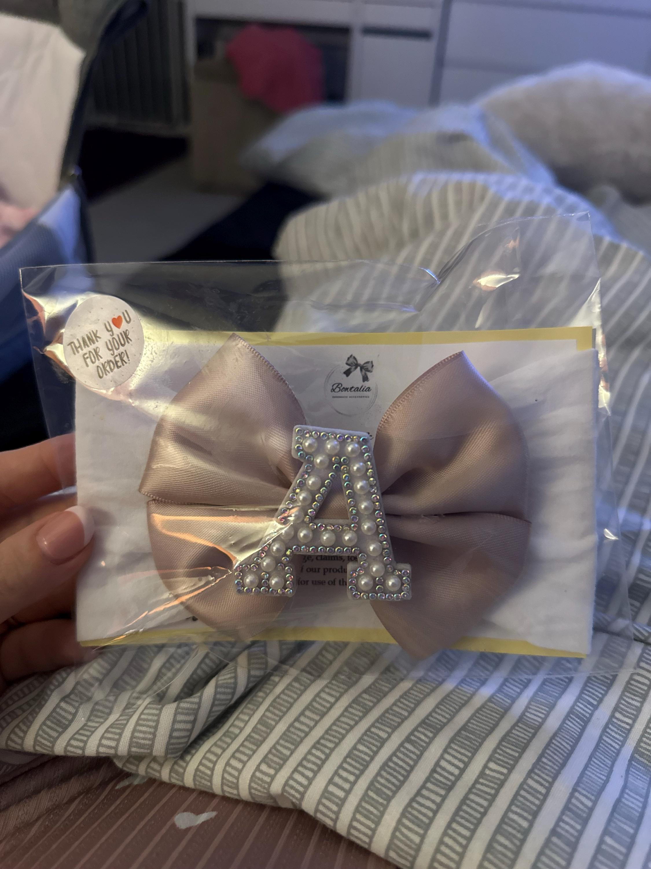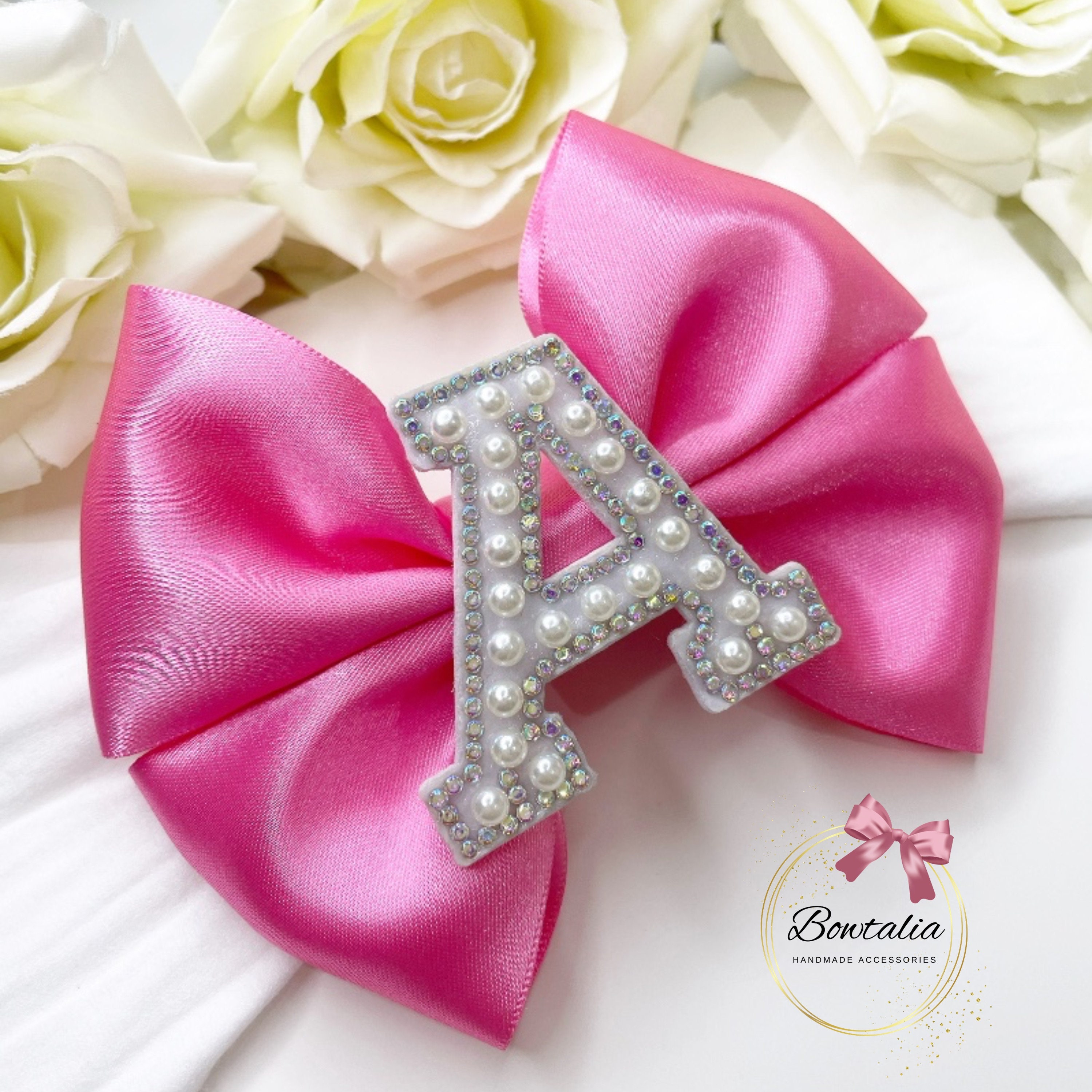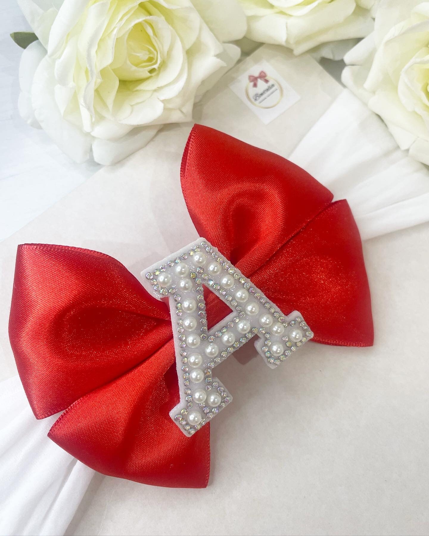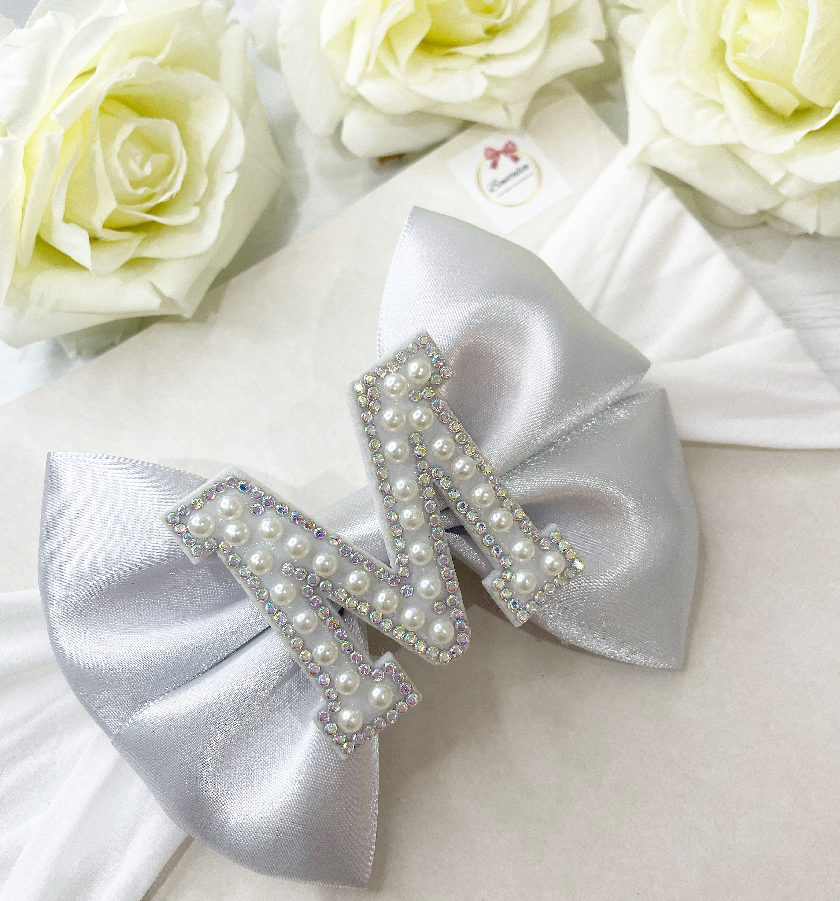A beautiful handmade bow with a Pearl initial centre on a thick white nylon headband. So pretty to accessorise an outfit.