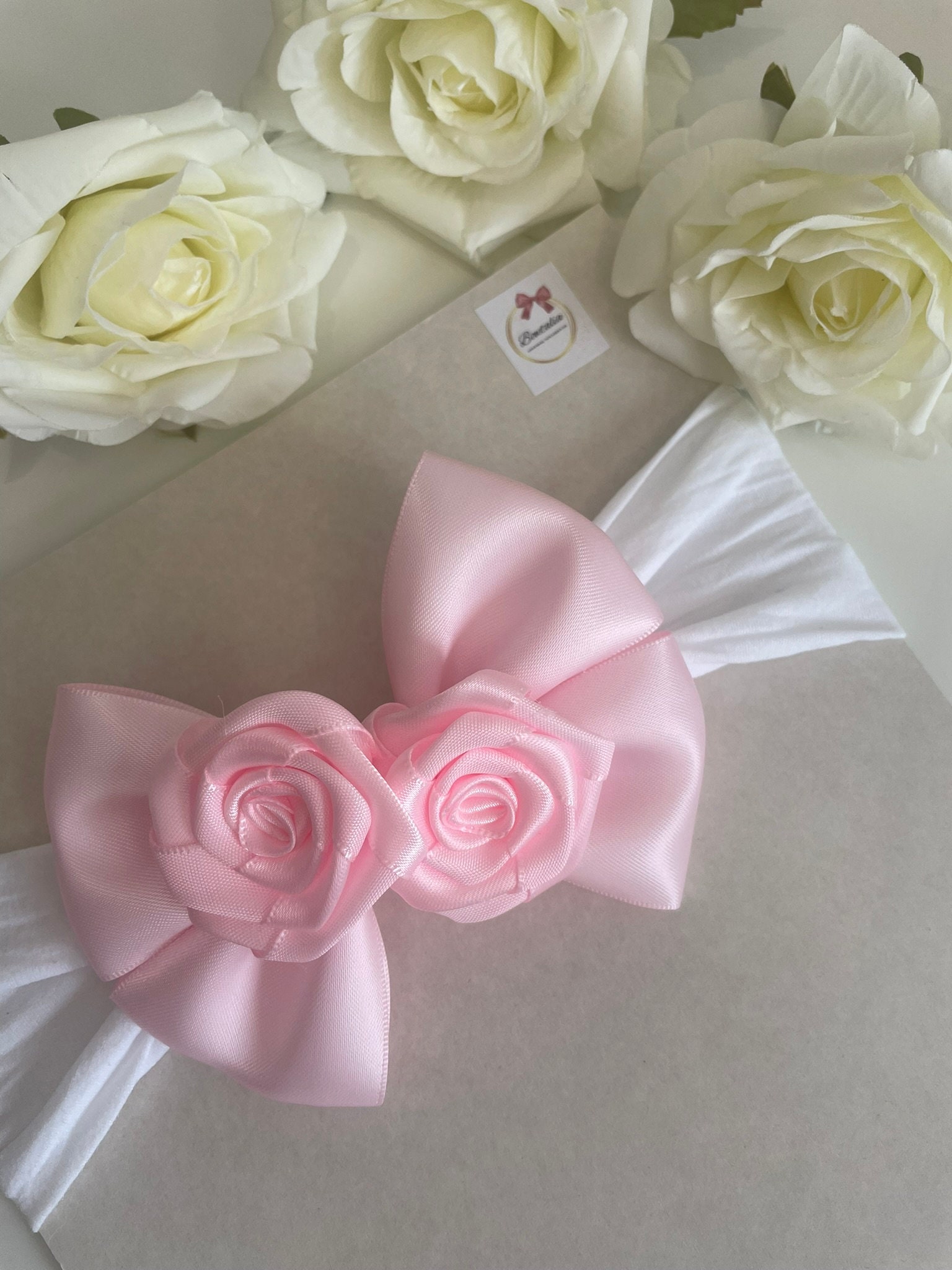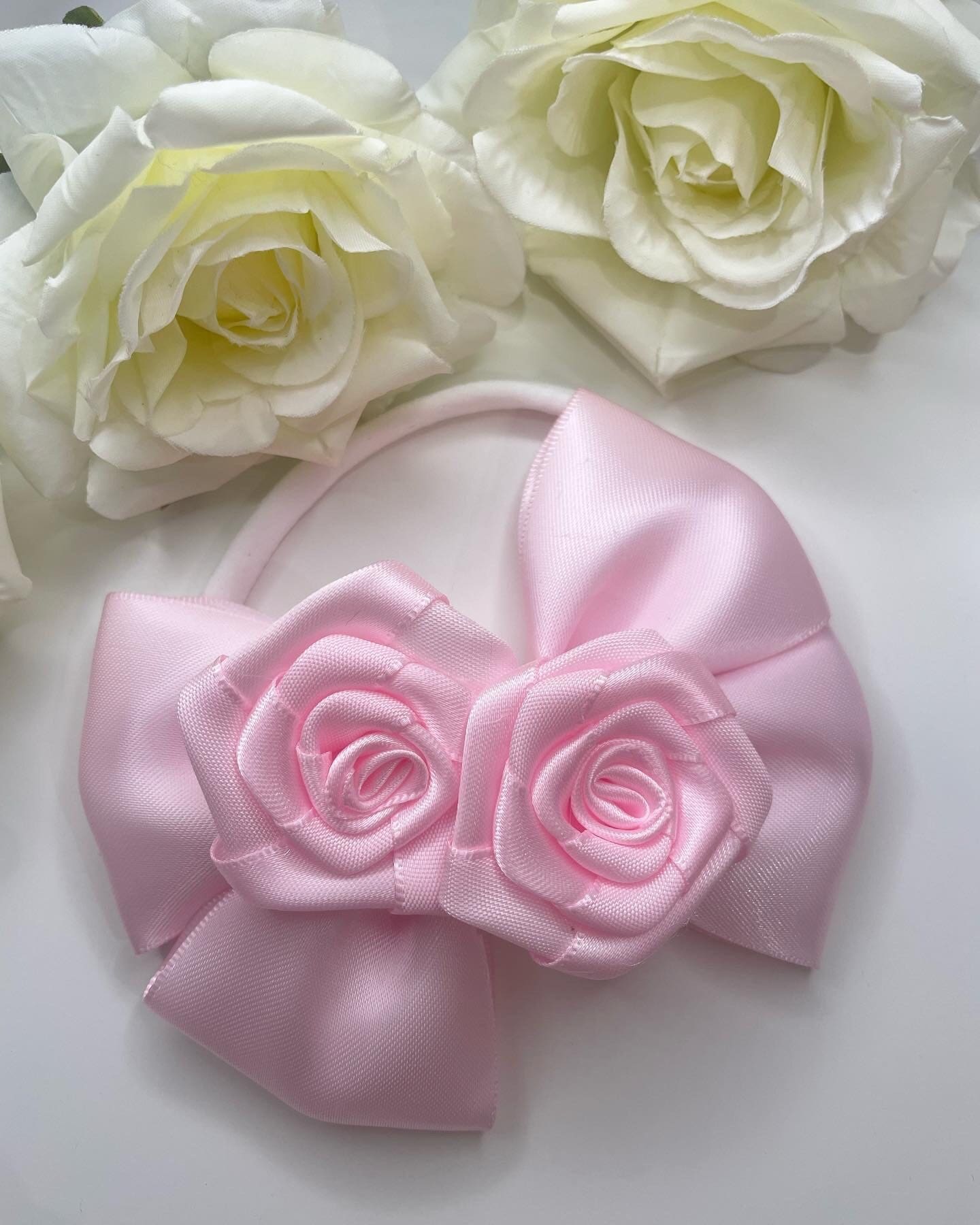 Pink bow with a rose centre. Handmade & unique! So pretty to accessorise an outfit. Perfect for a gift.