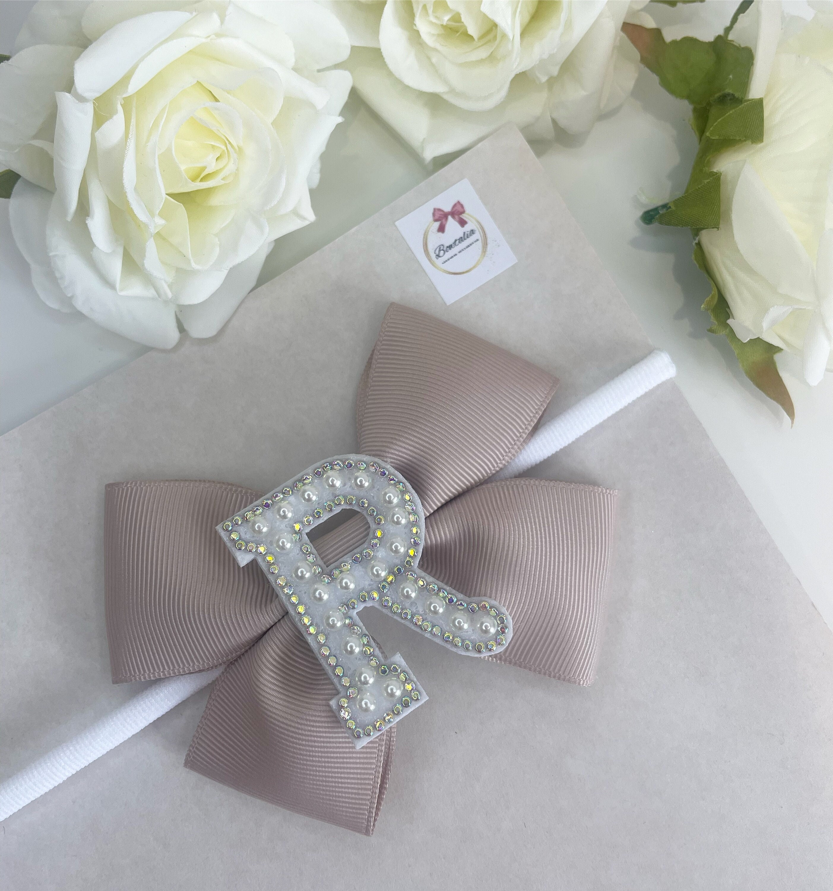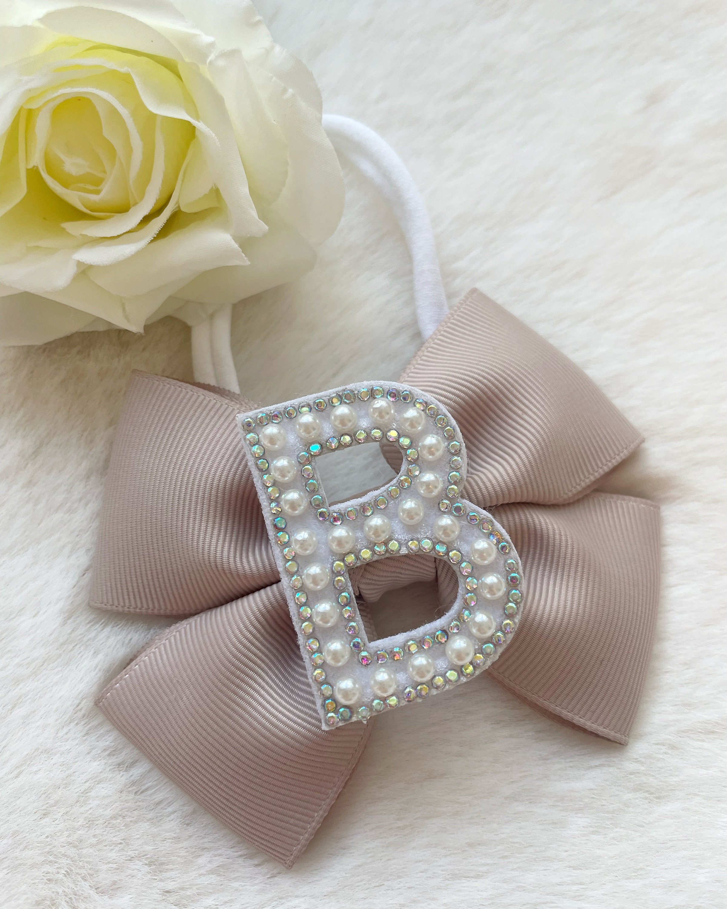Beautiful handmade bow with a Pearl initial centre on a thin nylon headband. So pretty to accessorise an outfit.