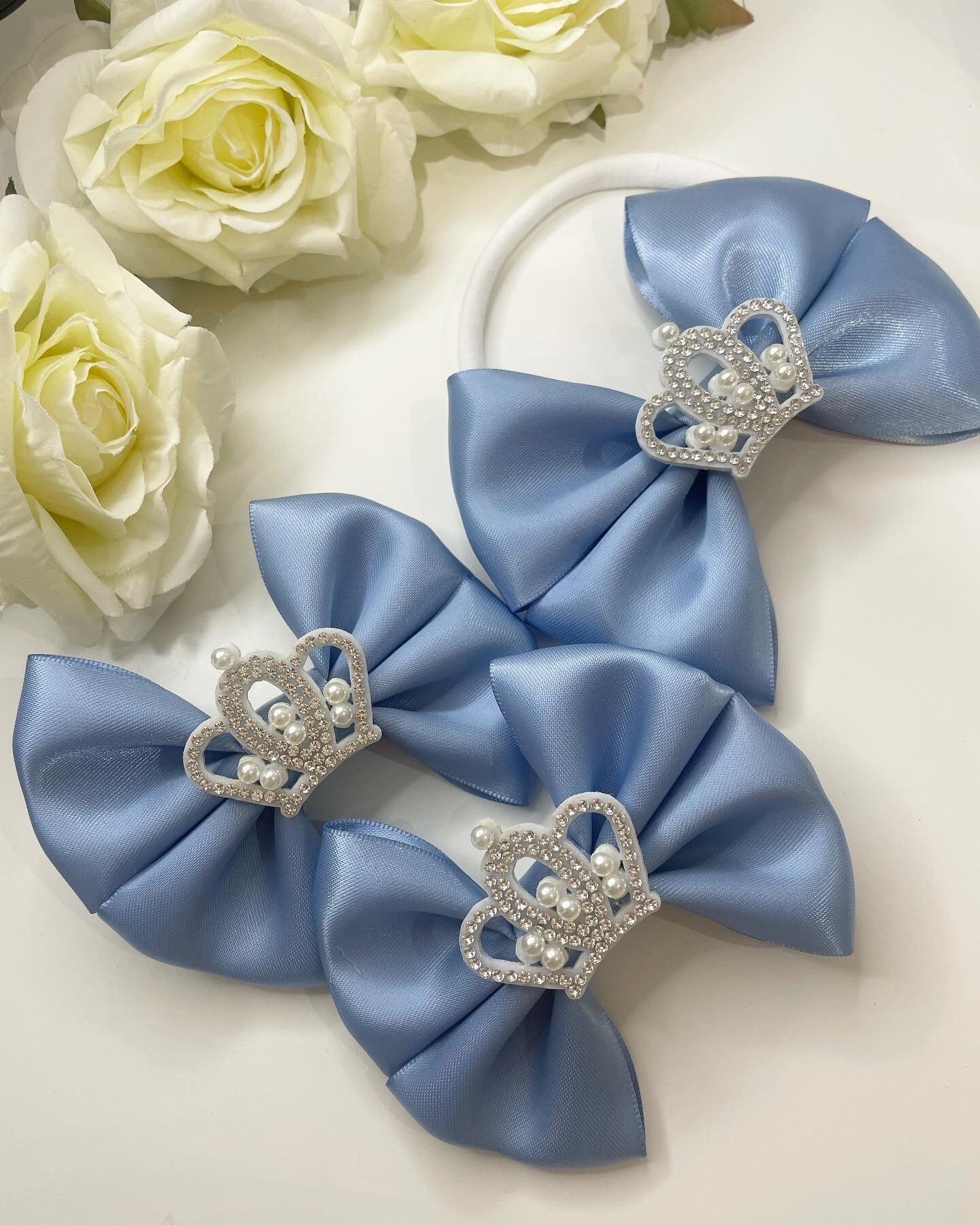 Beautiful handmade bows in the colour french blue with a pearl princess embellishment.