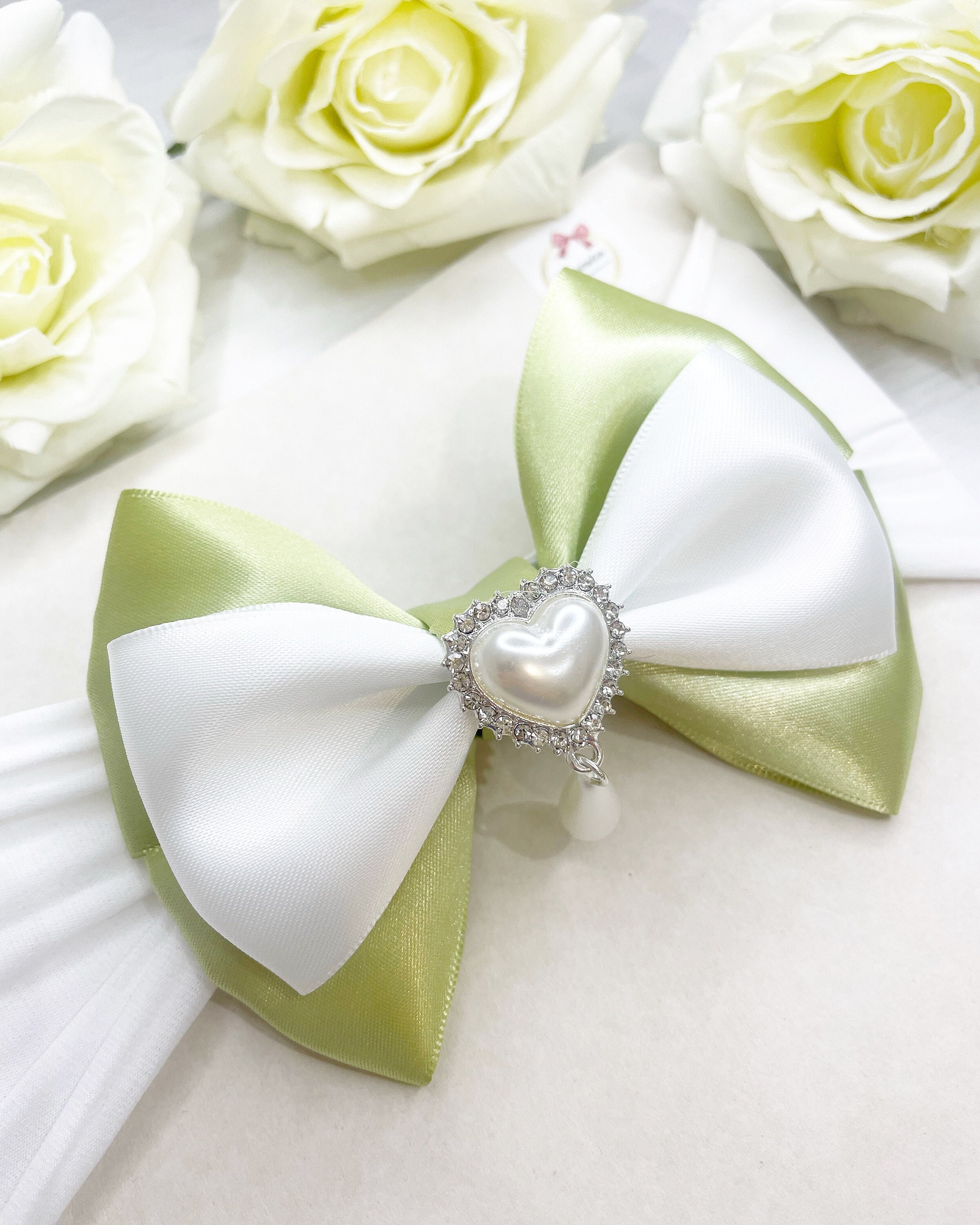 Beautiful sage green and white bow with a pearl heart tear drop centre. So pretty to accessorise a summer outfit.