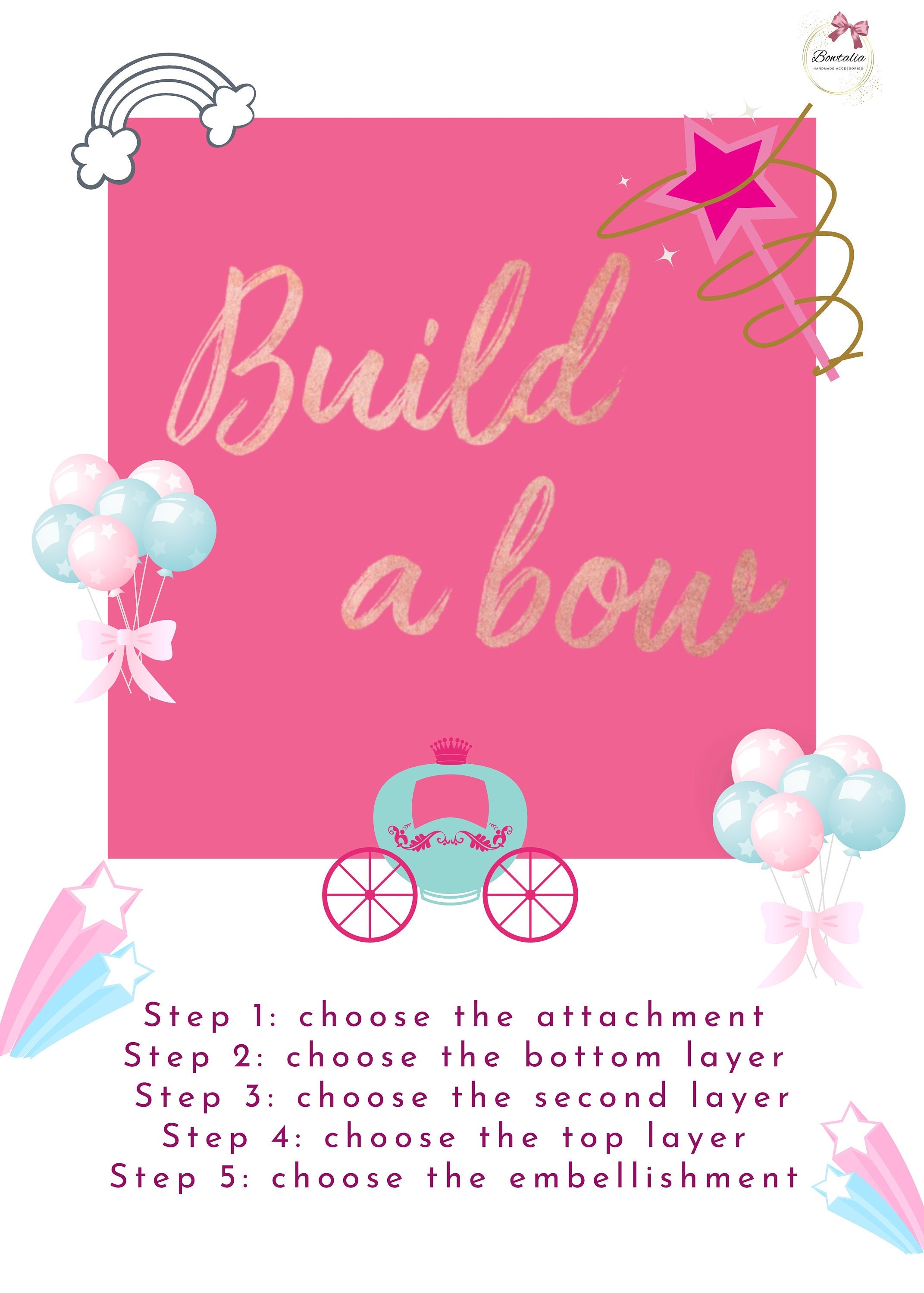 What is build a bow? Build a bow means you can design your own bow from start to finish. Using all your own ideas, colours, fabrics, personalisation etc. Use the 5 step guide to create your very own unique bow.