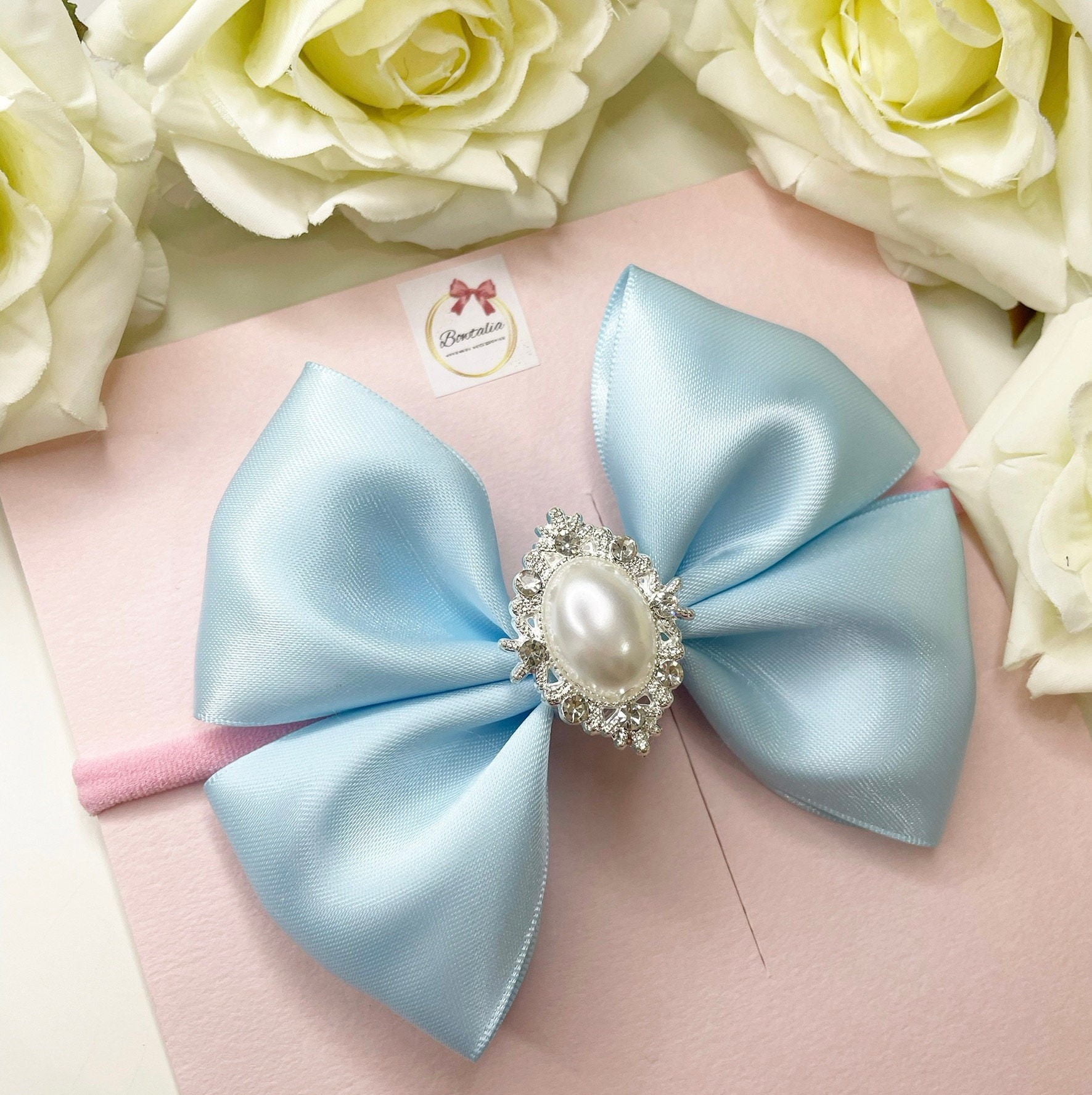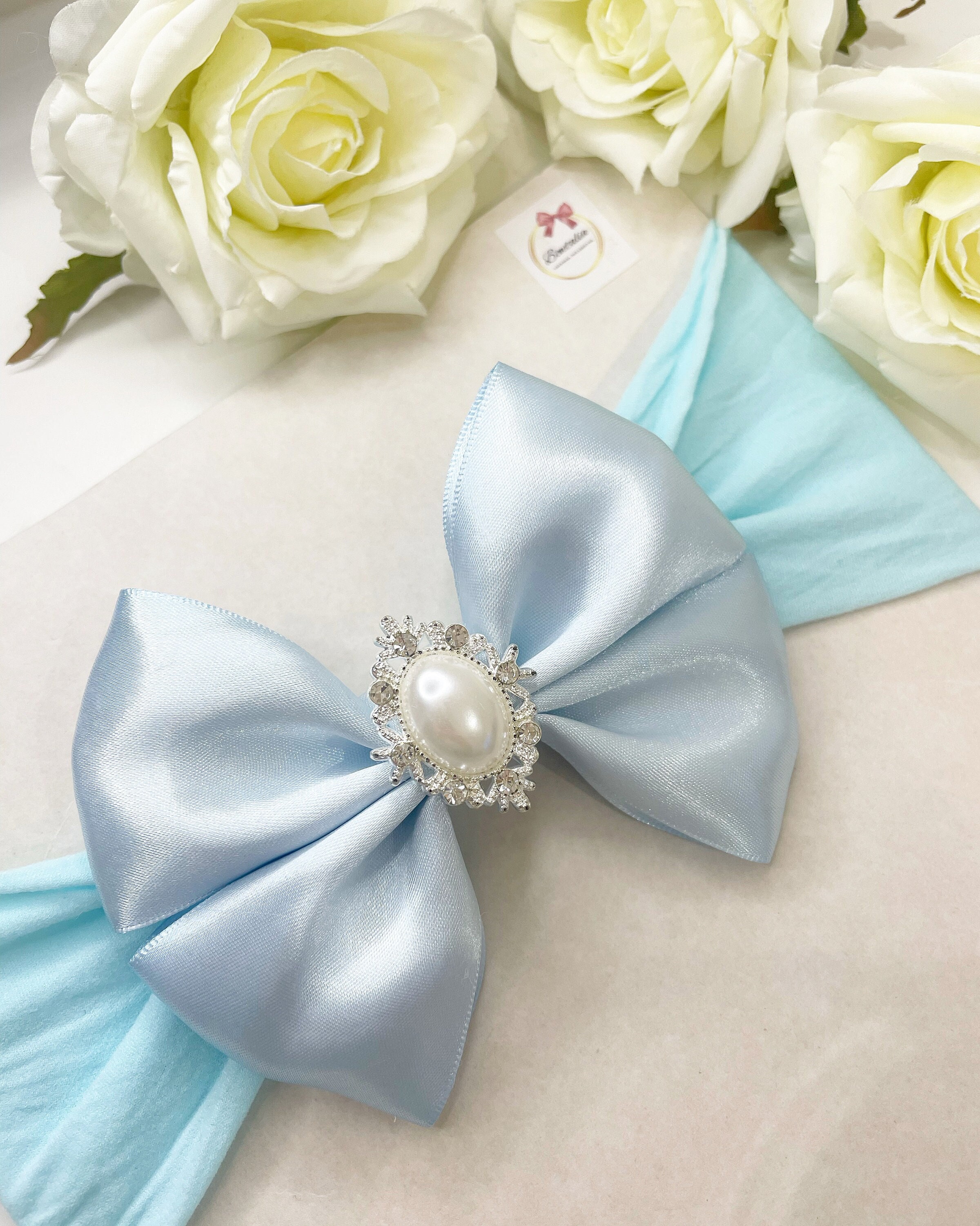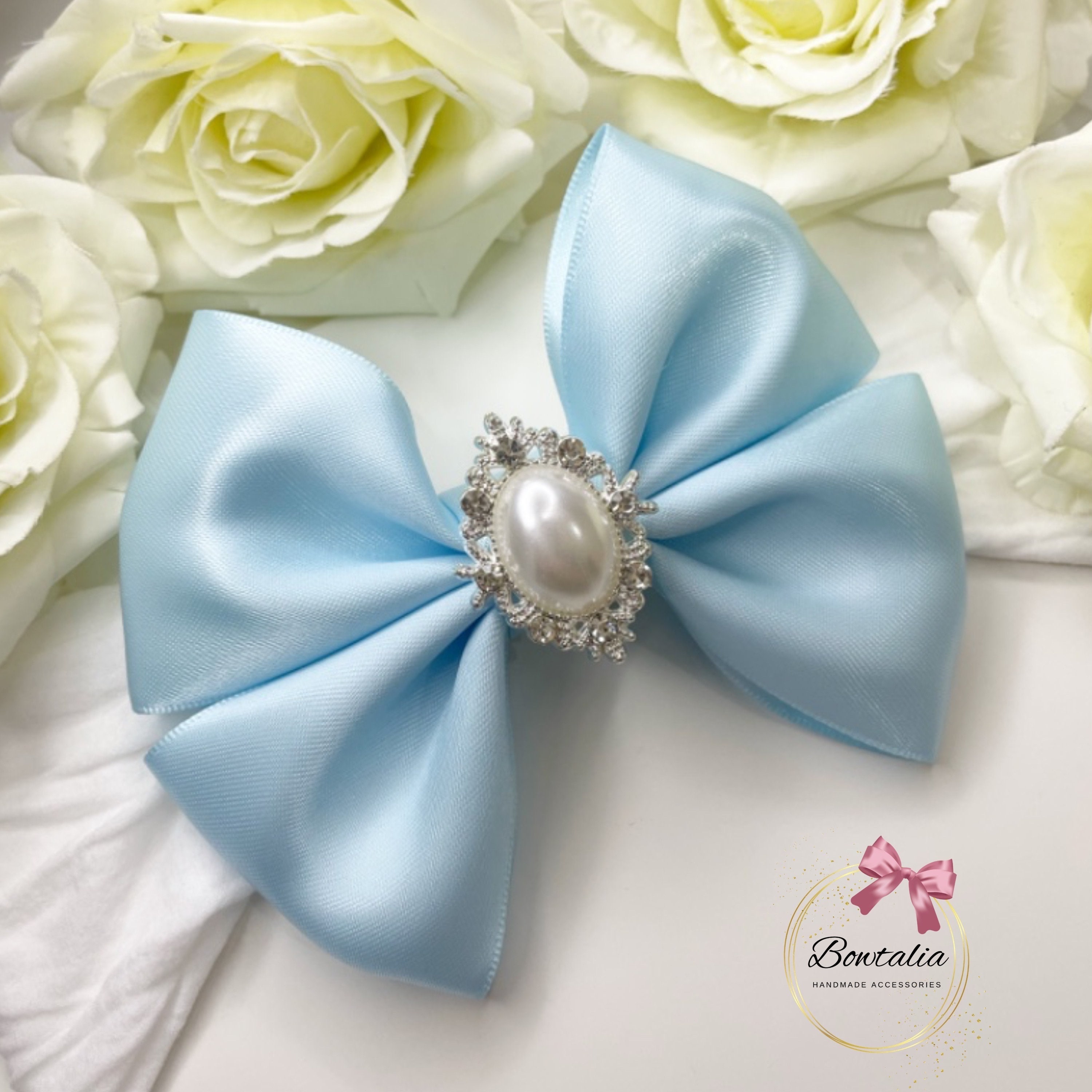 Beautiful light blue bow with a pearly embellishment. So pretty to accessorise an outfit.