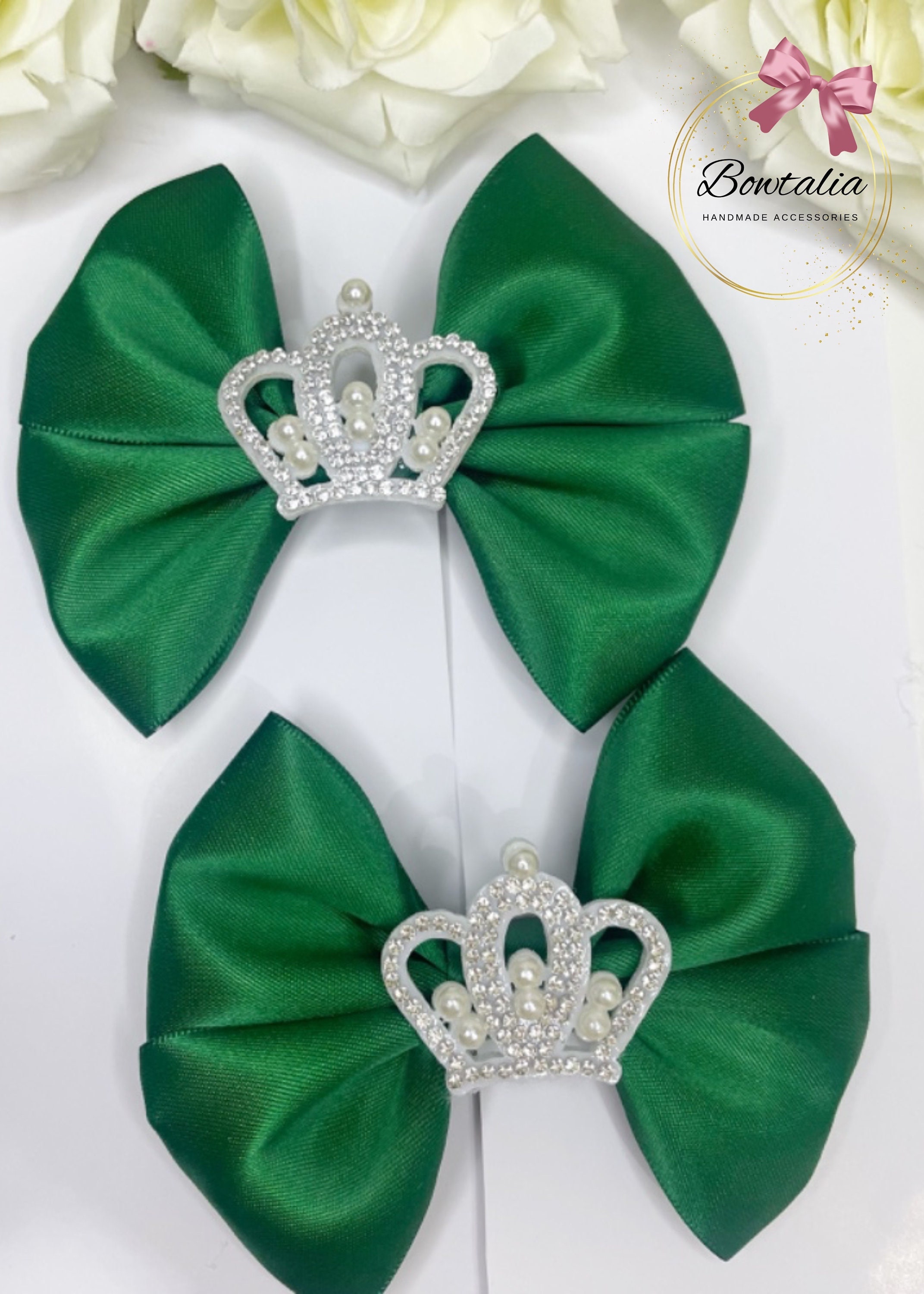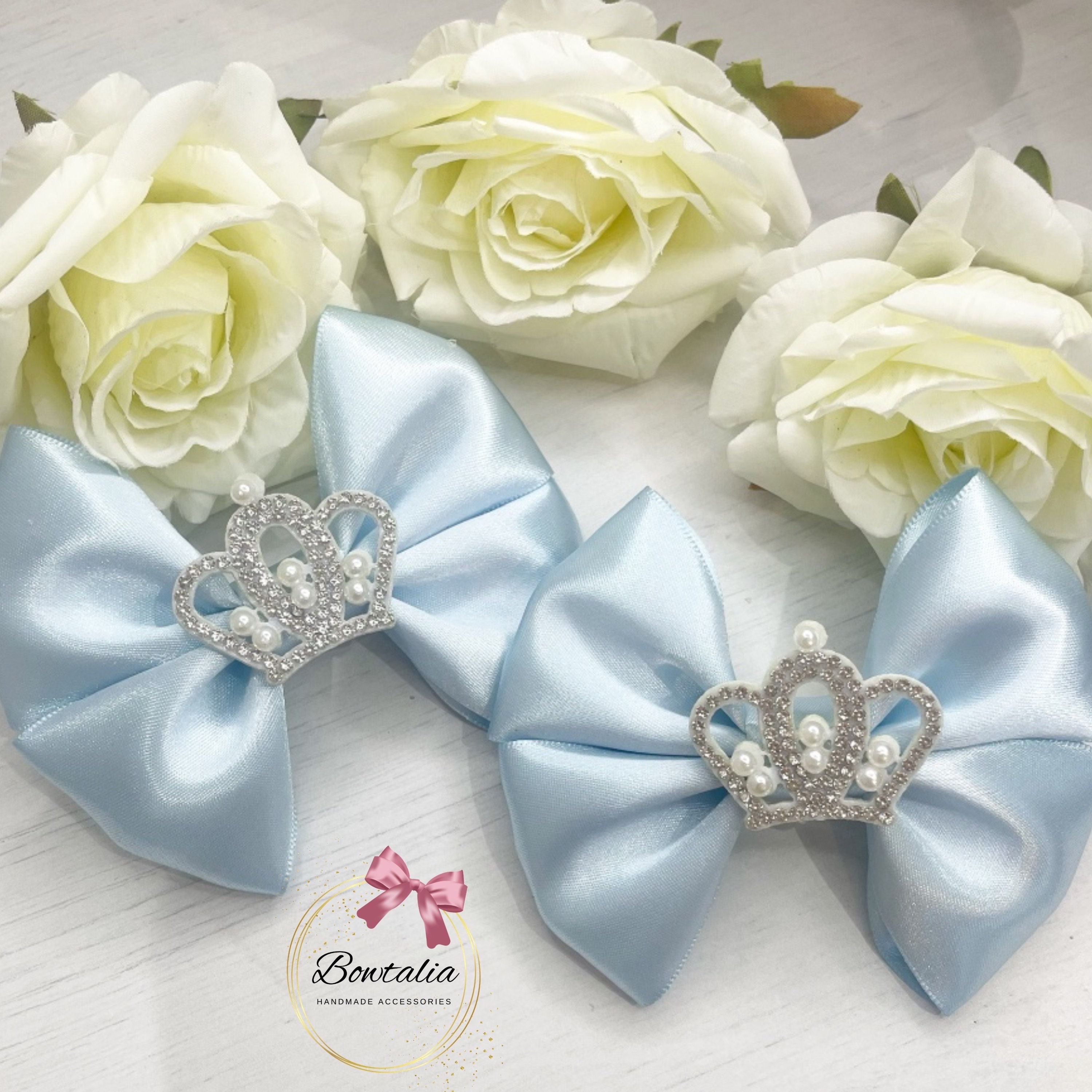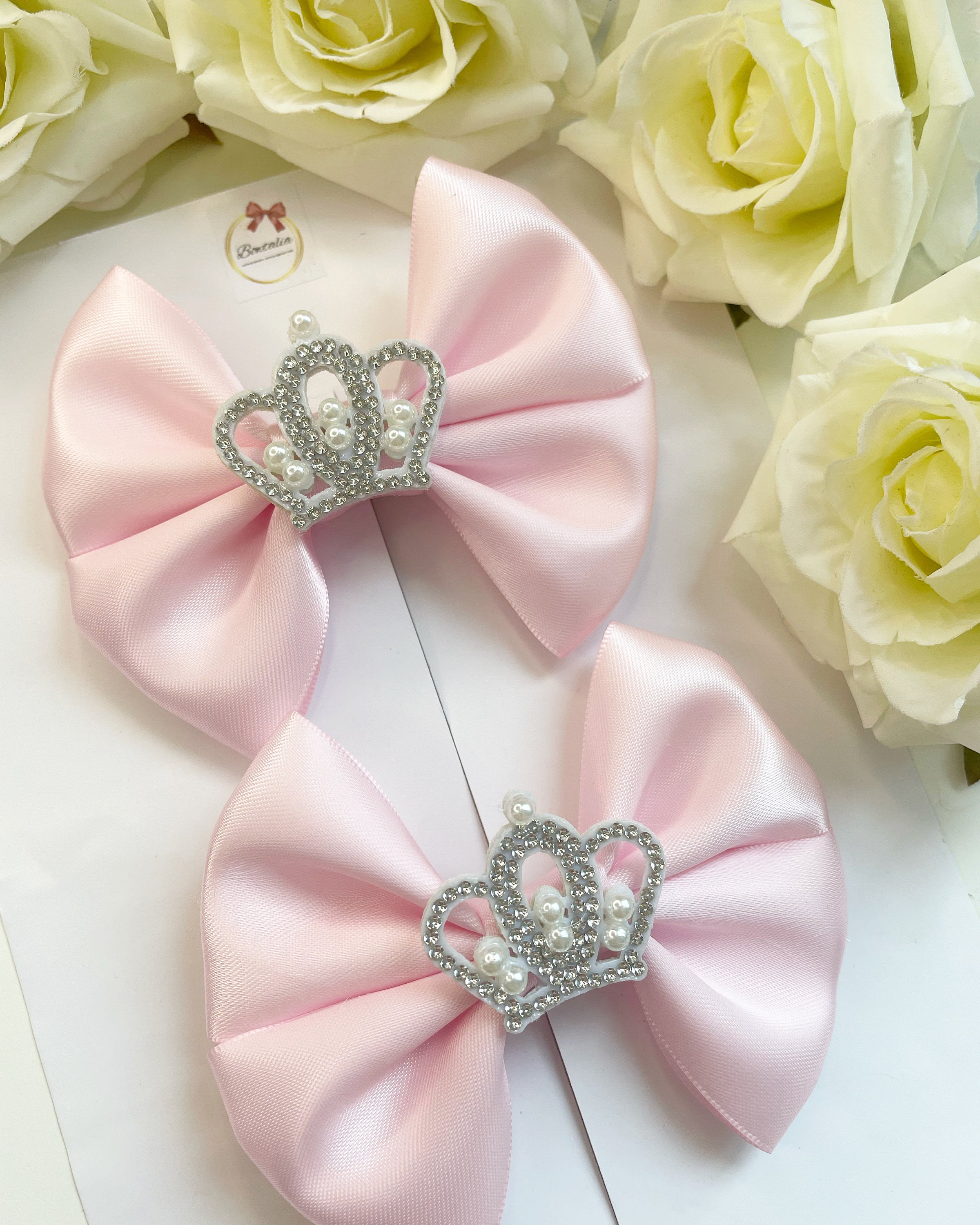 Matching pigtail bow clips with a pearl crown embellishment. This listing is for 2 matching pig tail clips - the bows are attached to a crocodile clip.