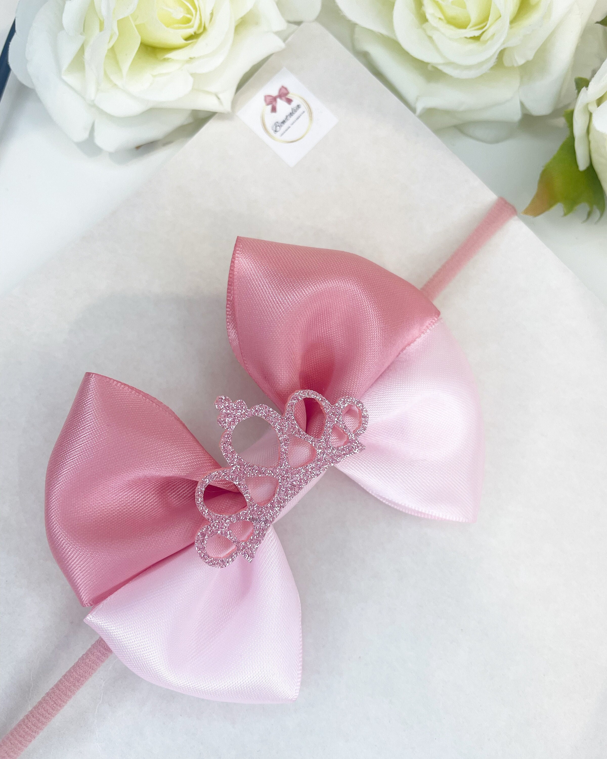 A split pink bow with a princess crown embellishment on a thin nylon headband.