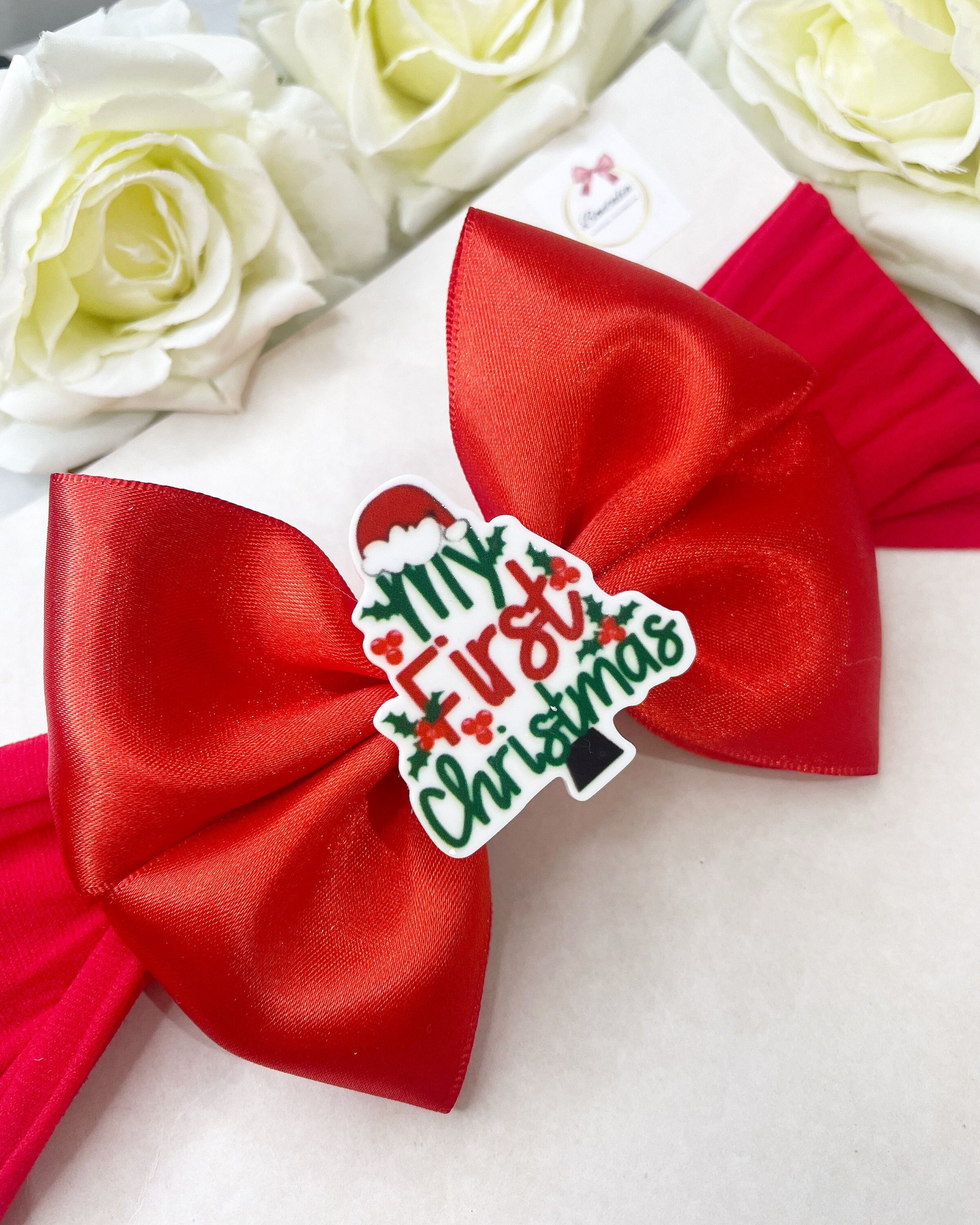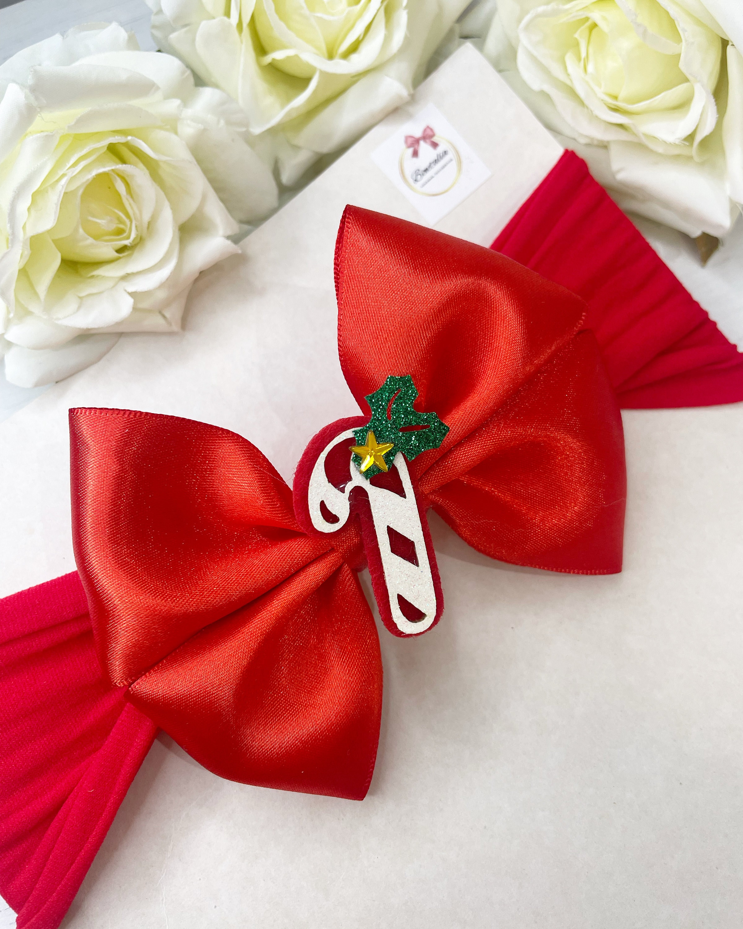 A red bow with a Christmas centre on a thick red nylon headband. Perfect to match Christmas outfits.