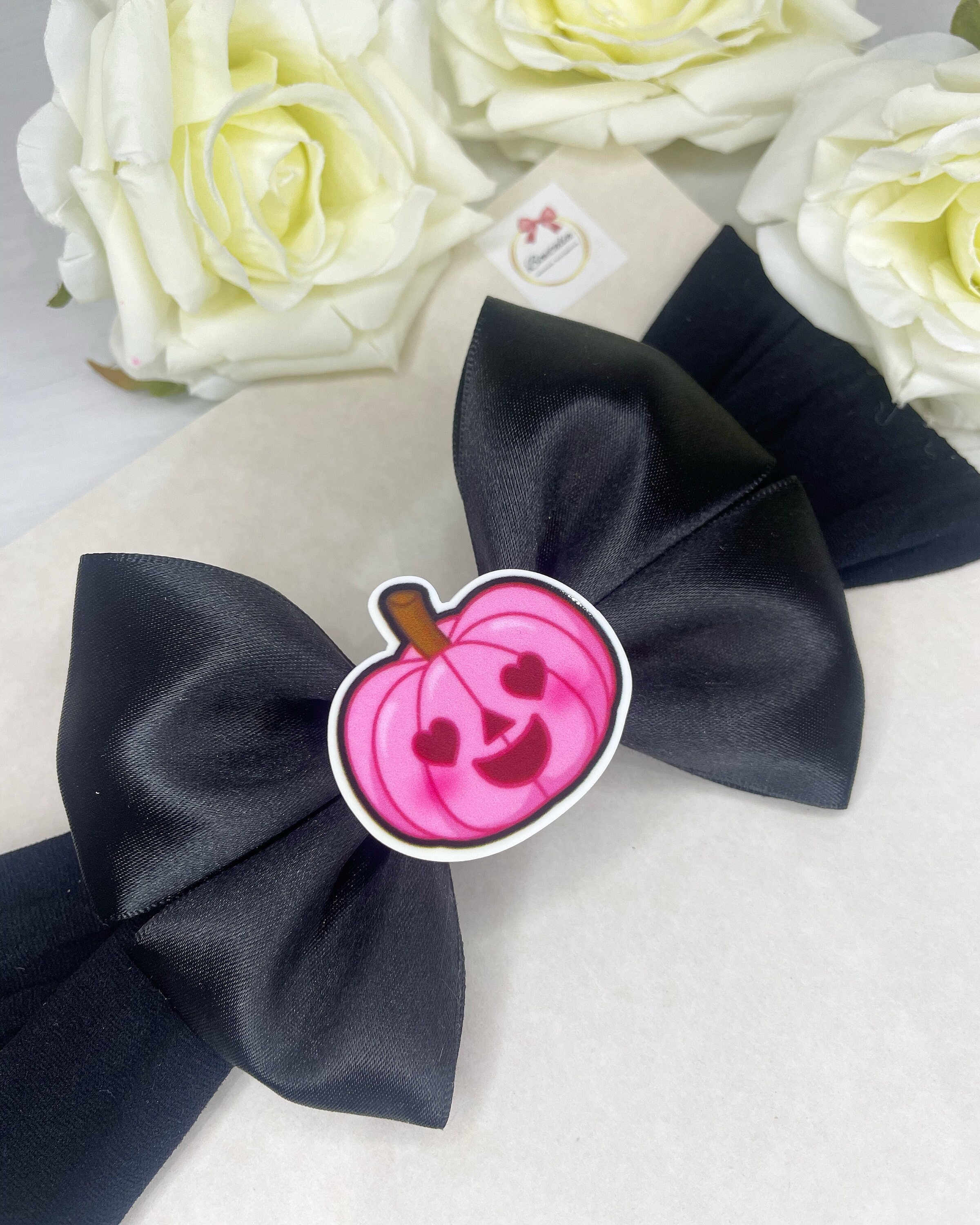 Black bow with a pink pumpkin. Perfect to match with a halloween outfit.
