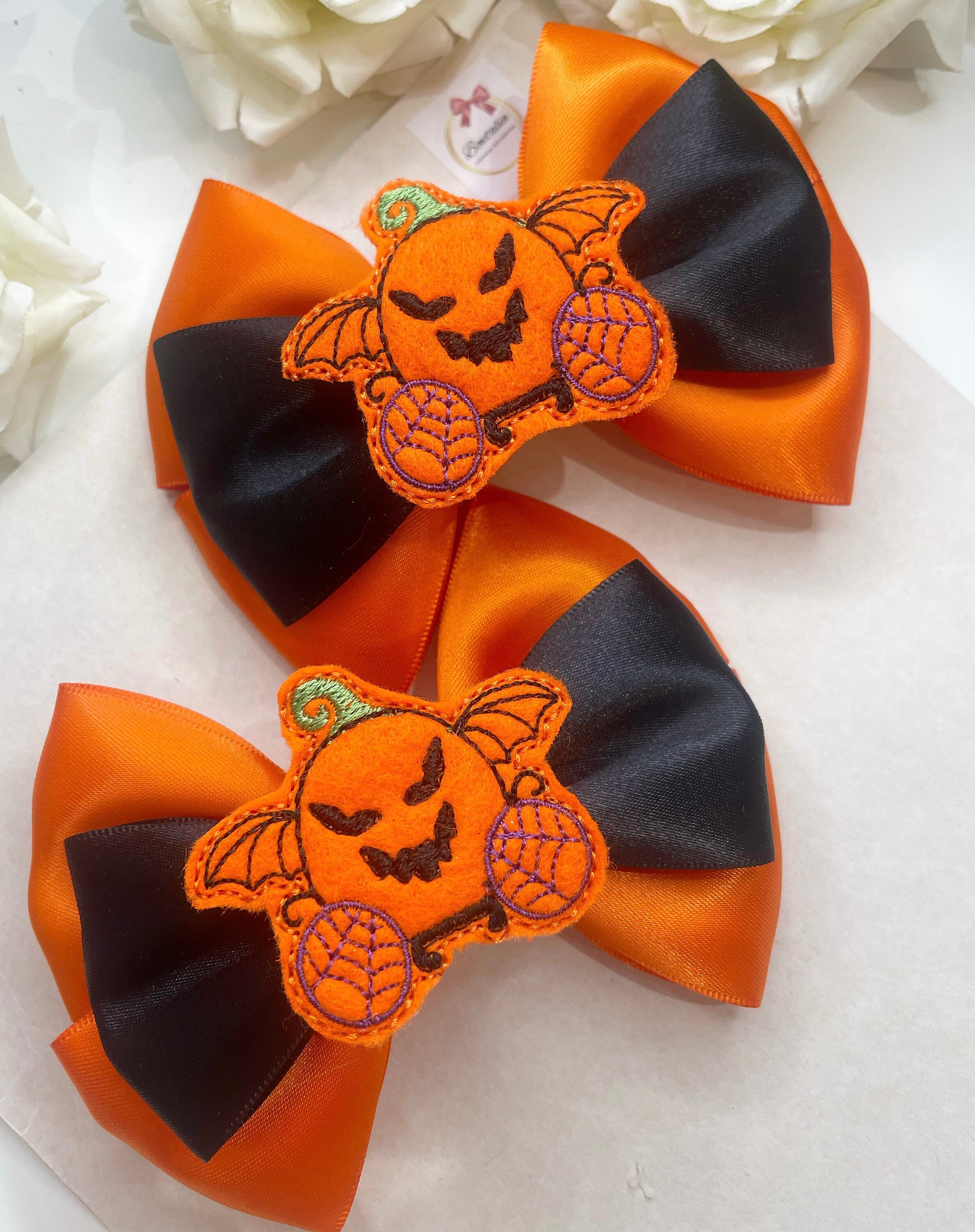 Black and orange Halloween bows on crocodile clips. This listing is for 2 matching pigtail clips - the bows are attached to a crocodile clip.