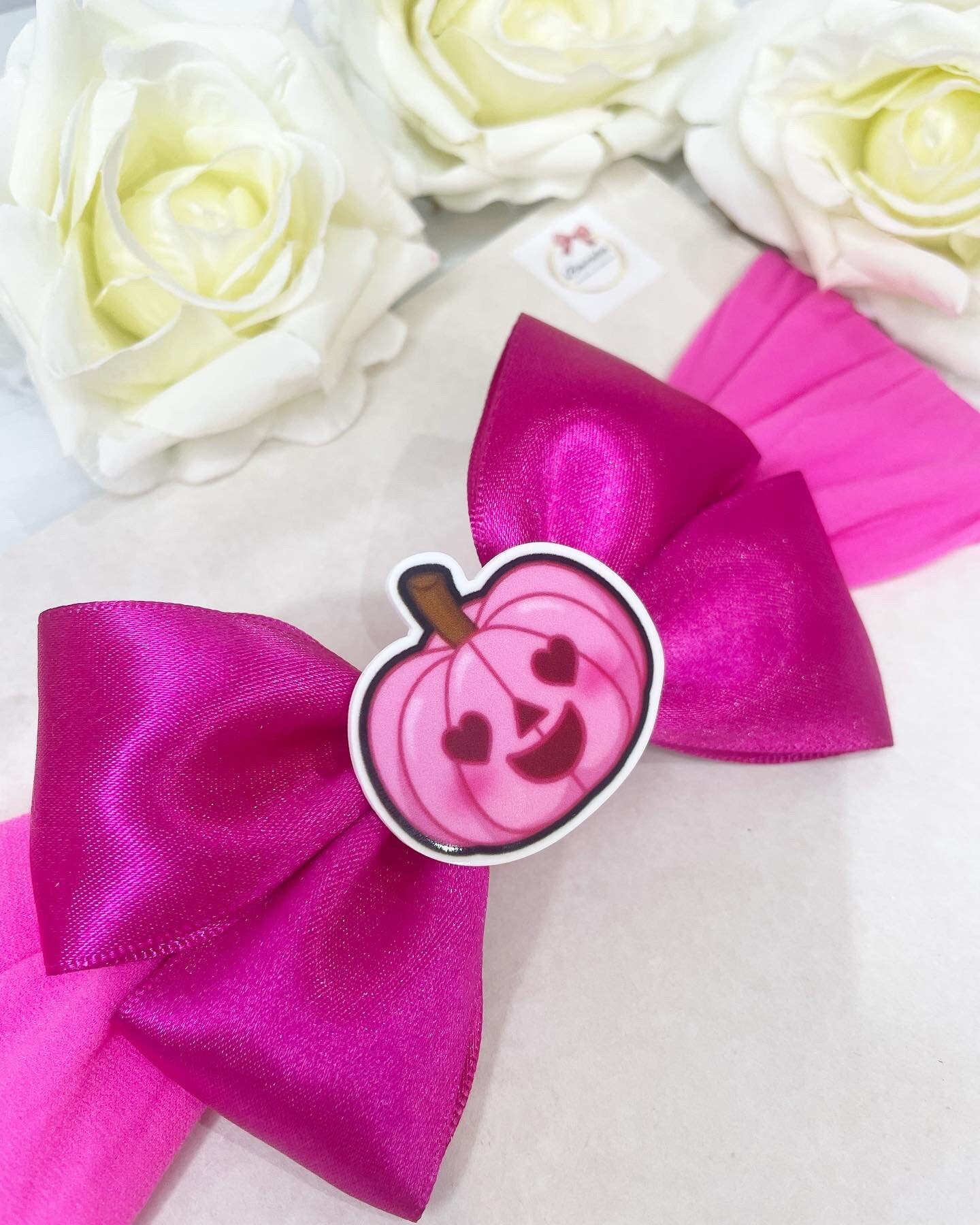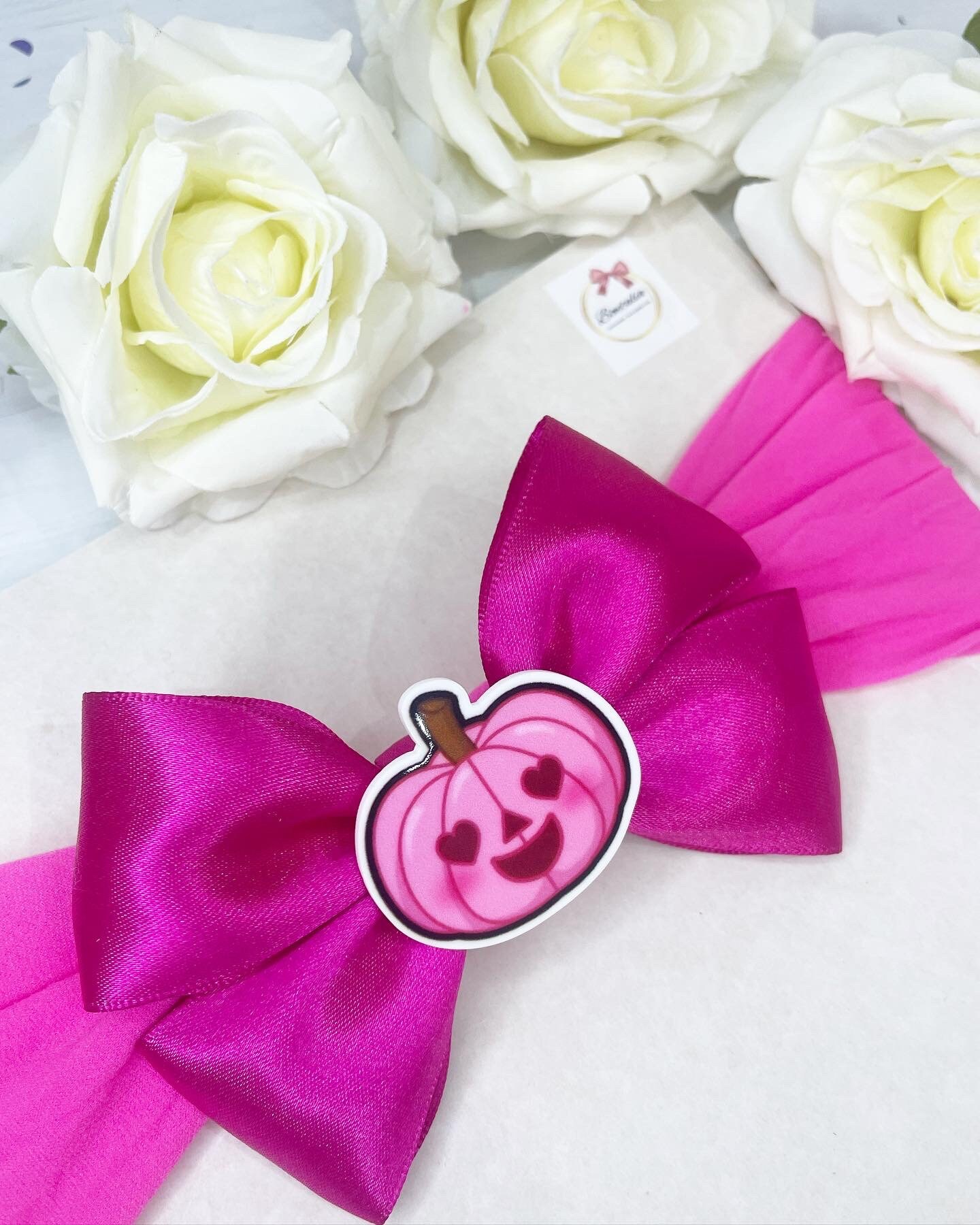 A fuchsia pink bow with a pink pumpkin centre. Perfect to match with a halloween outfit.