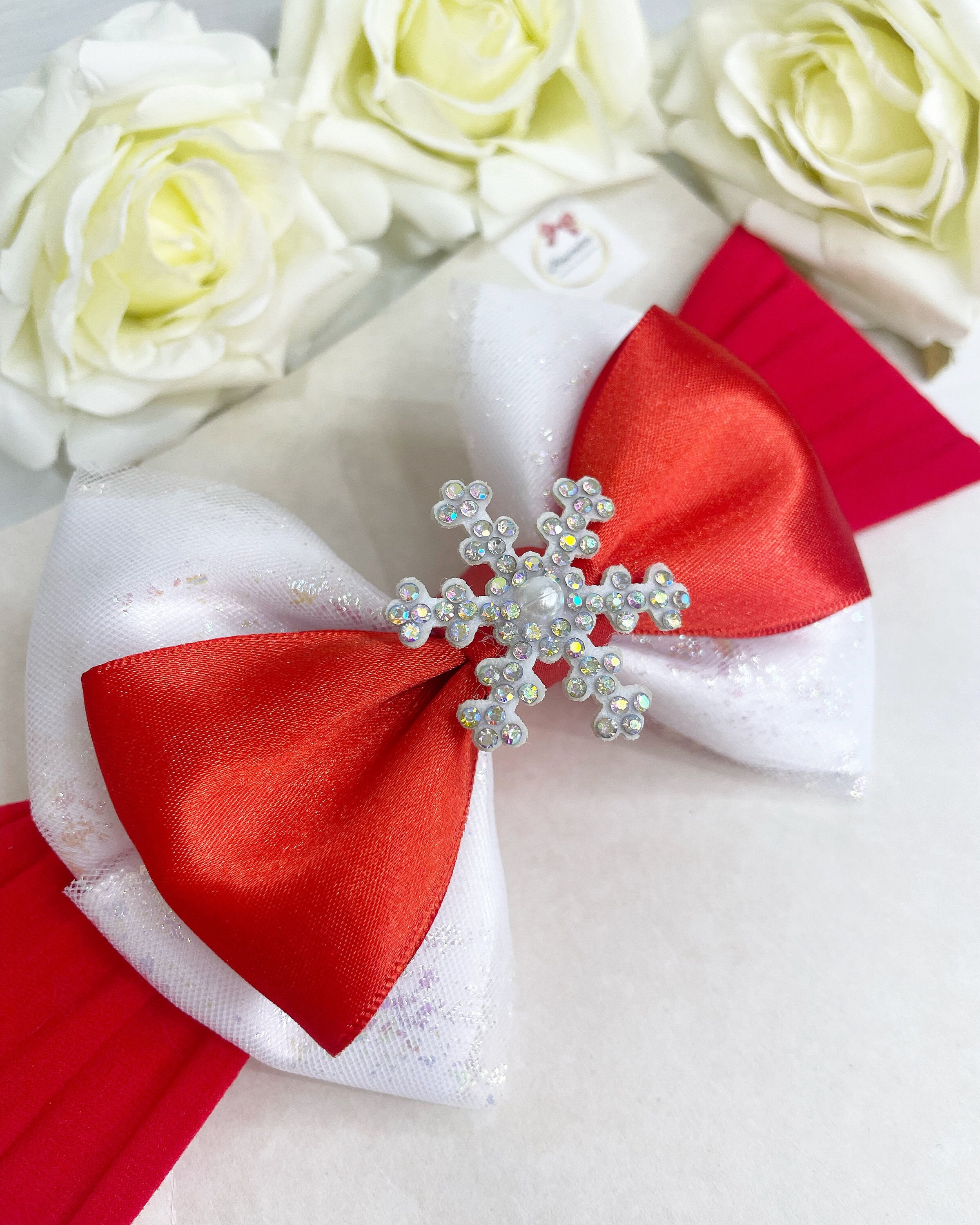 White and red sparkly bow with a snowflake centre on a thick nylon headband. Perfect to match Christmas outfits.