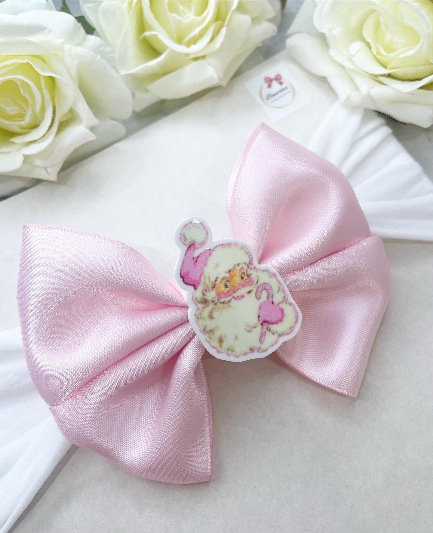 A light pink bow with a santa clause centre on a thick white nylon headband. Perfect to match Christmas outfits.