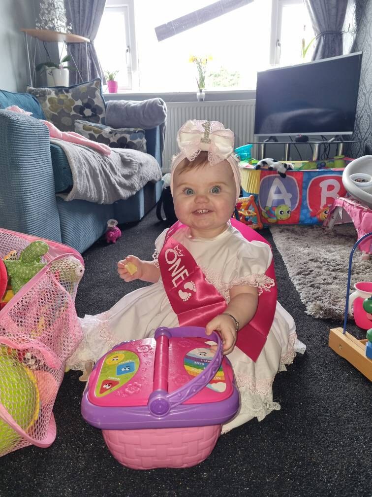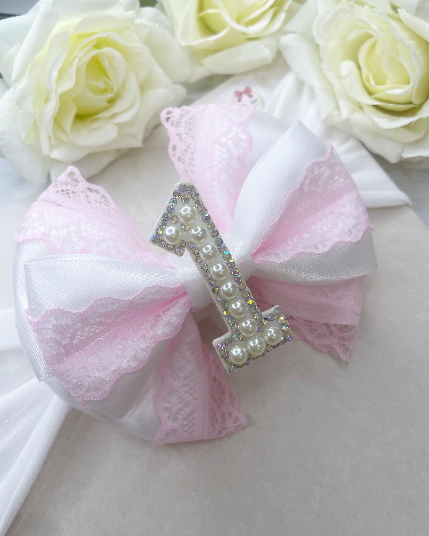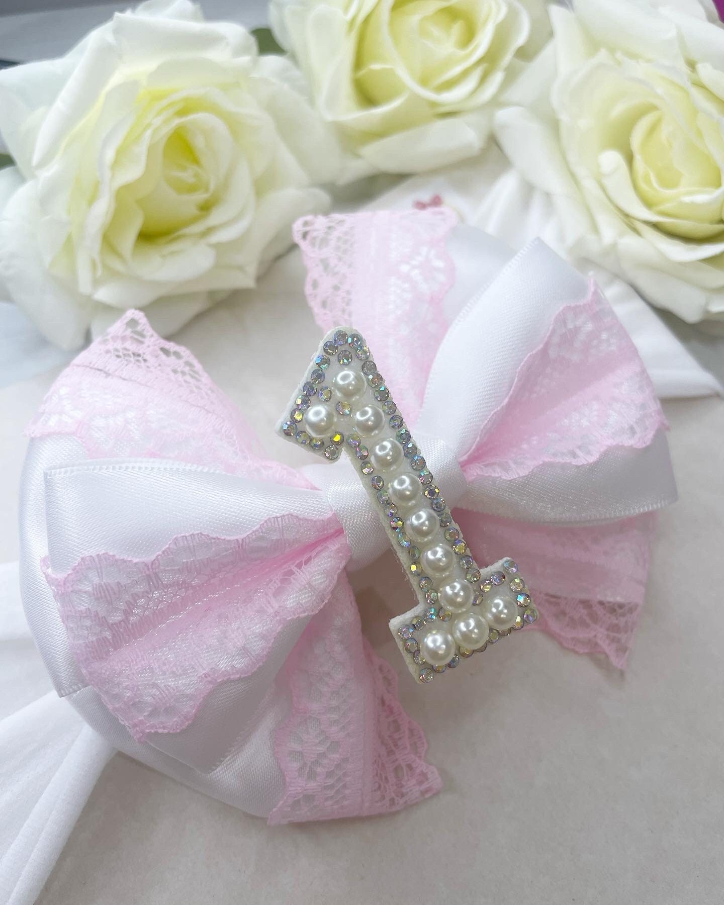 A stunning lace bow with a pearl number 1 centre on a thick white nylon headband. Perfect for birthdays.