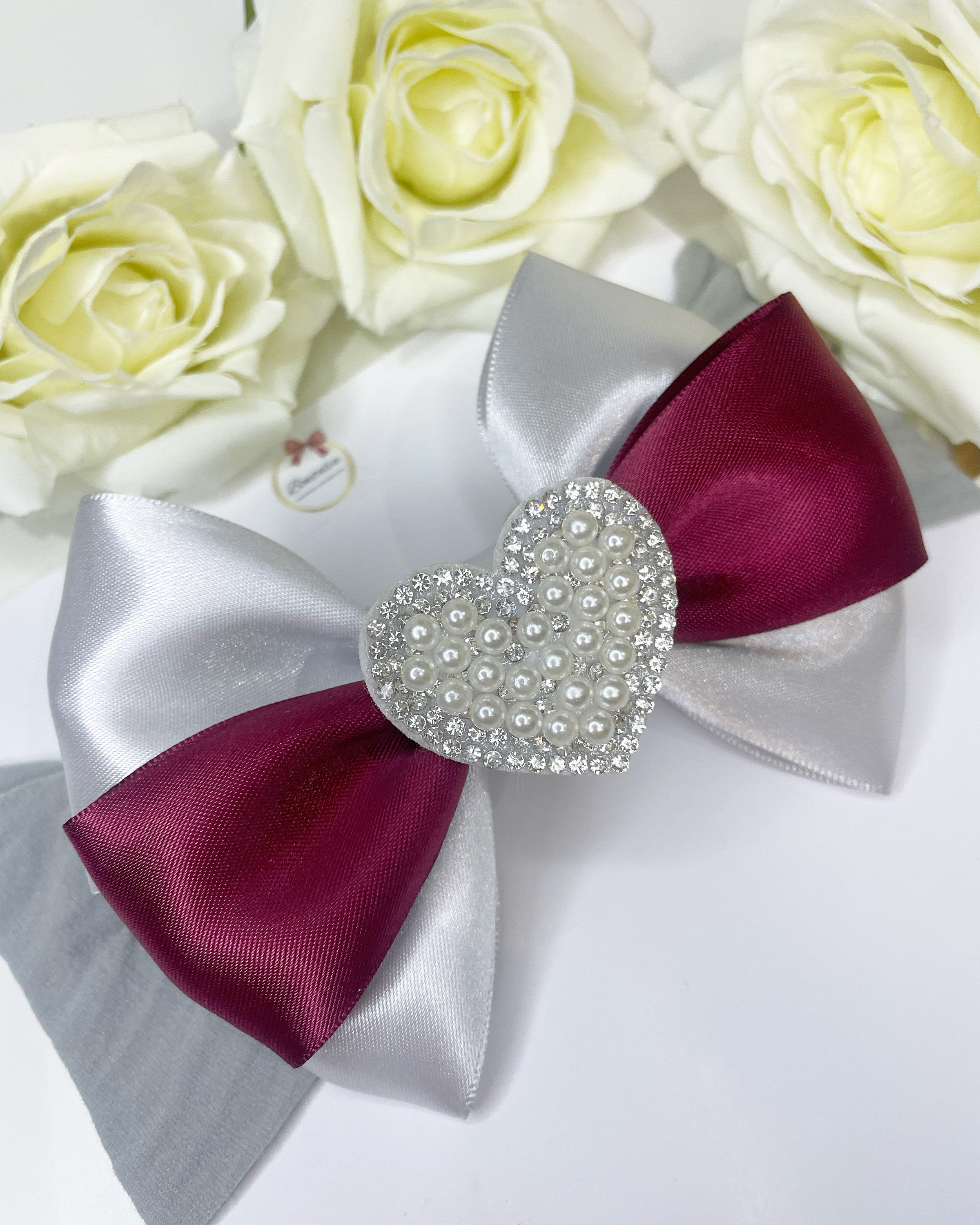 Beautiful silver and burgundy bow with a pearl heart centre on a thick nylon headband.