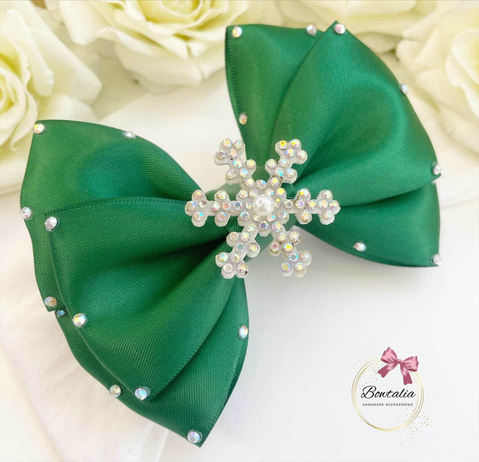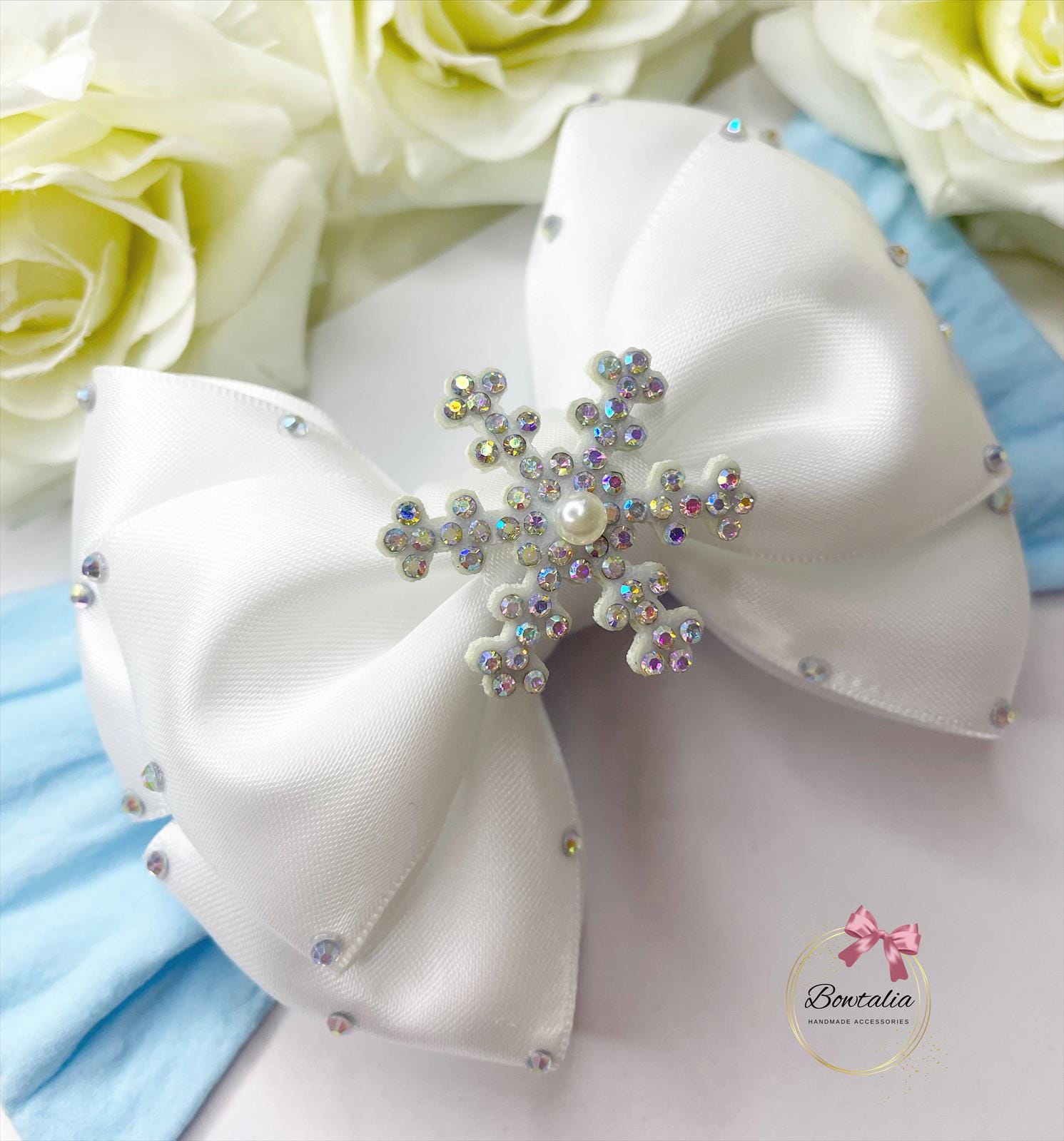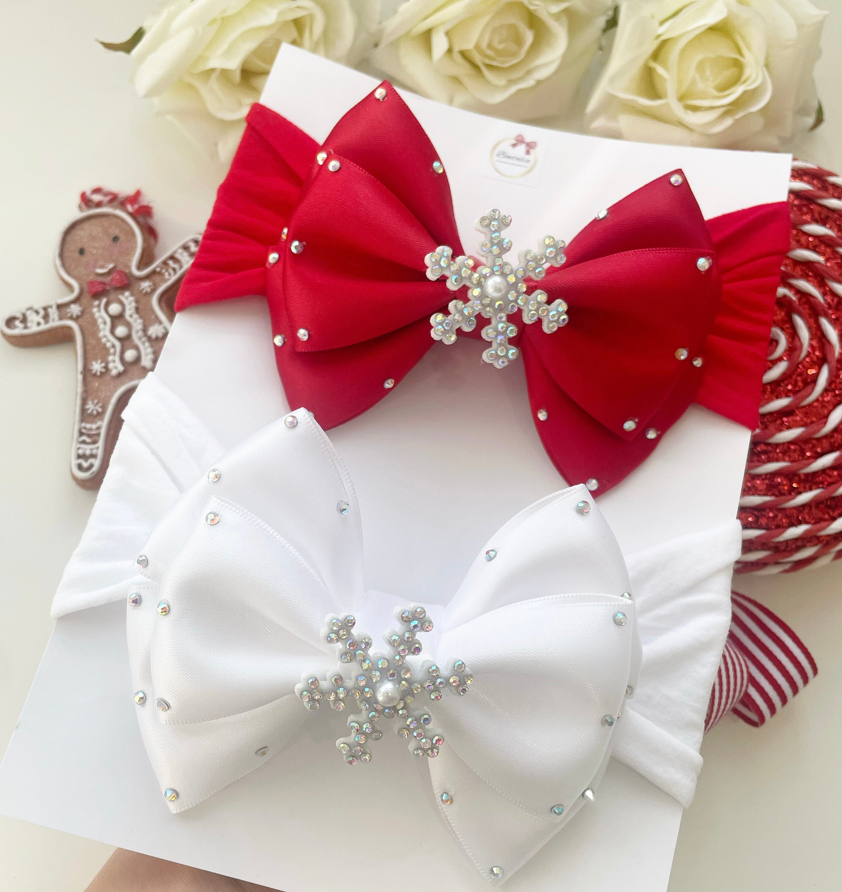 Handmade layered bow with gem details and a snowflake centre on a thick nylon headband. Perfect to match Christmas outfits.