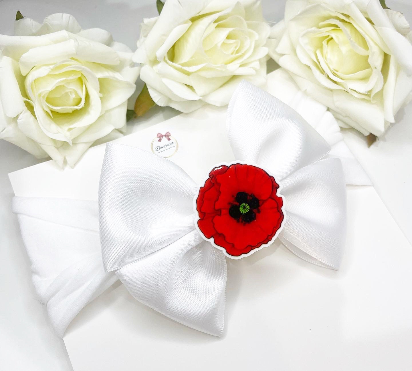 White bow with a poppy centre - perfect to celebrate Remembrance Day.
