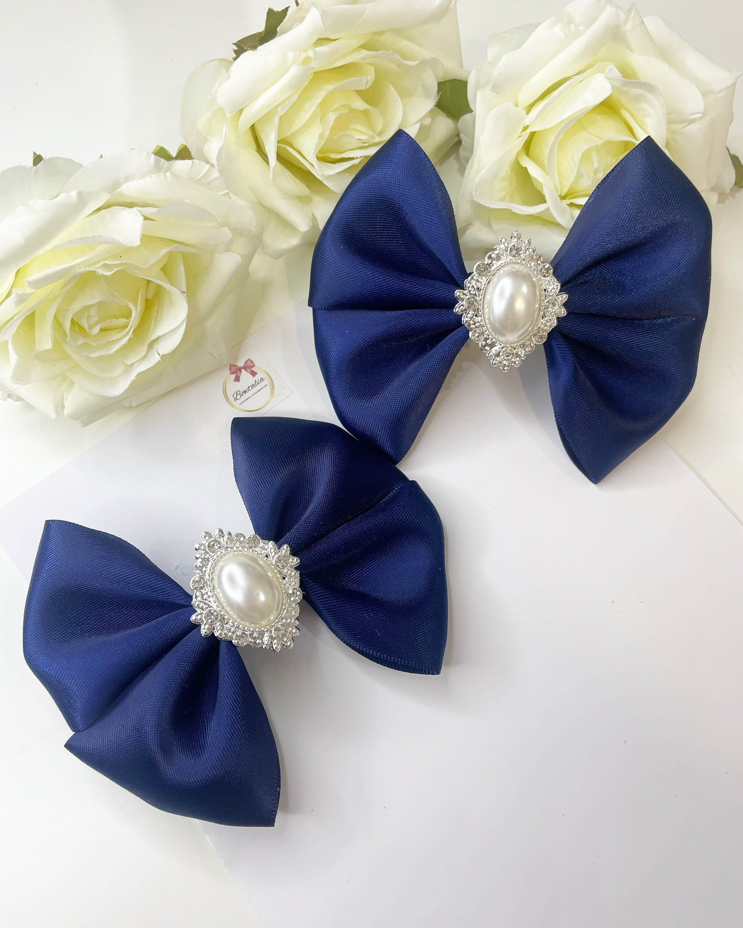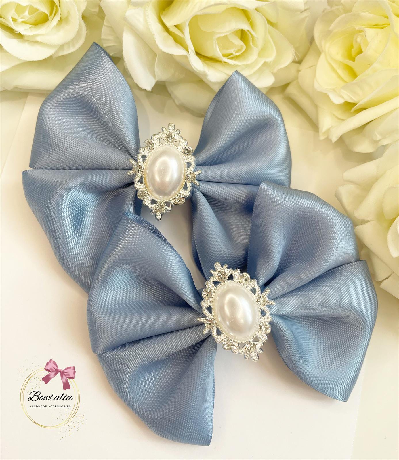 Matching pigtail bow clips with a pearly embellishment. This listing is for 2 matching pig tail clips - the bows are attached to a crocodile clip.