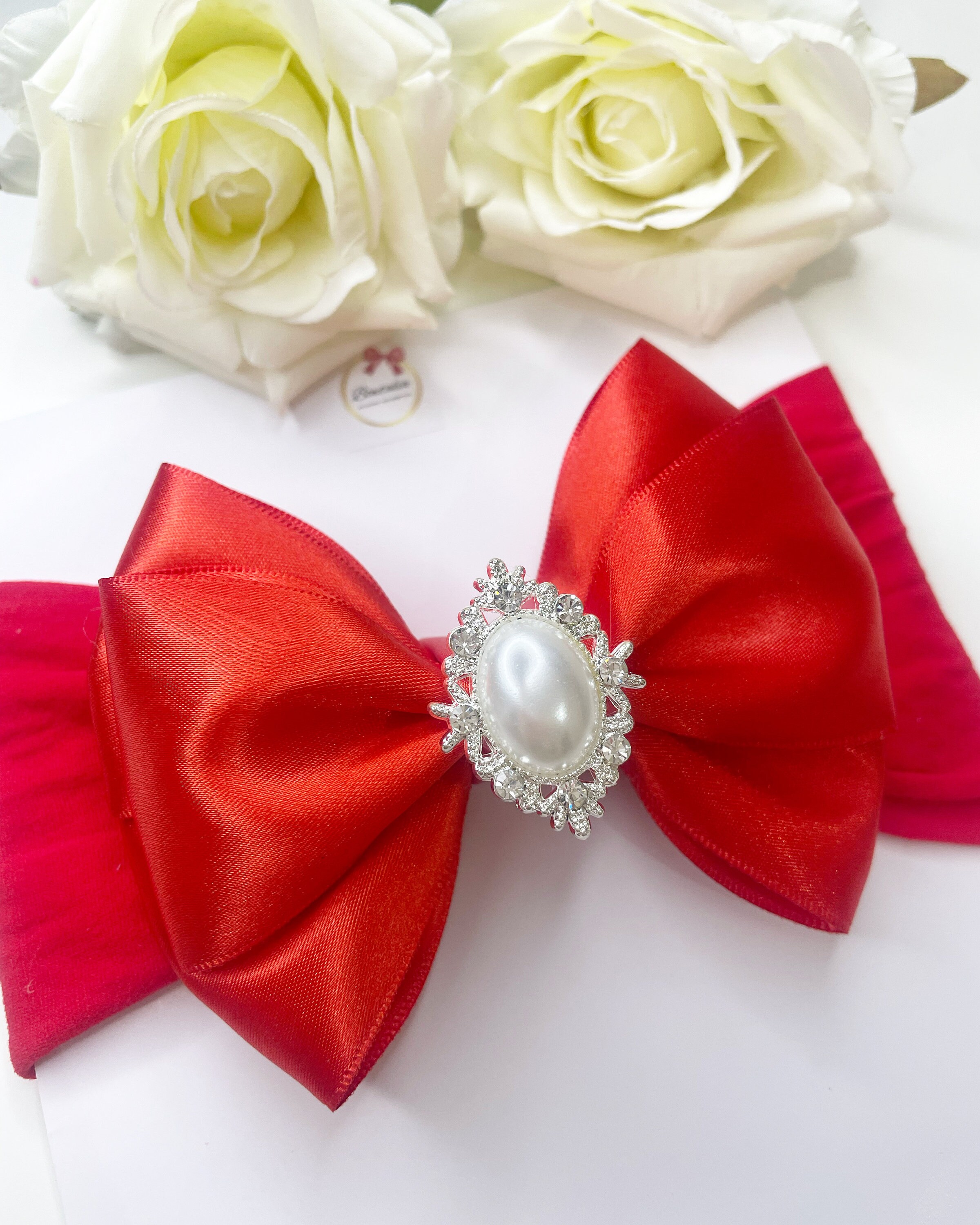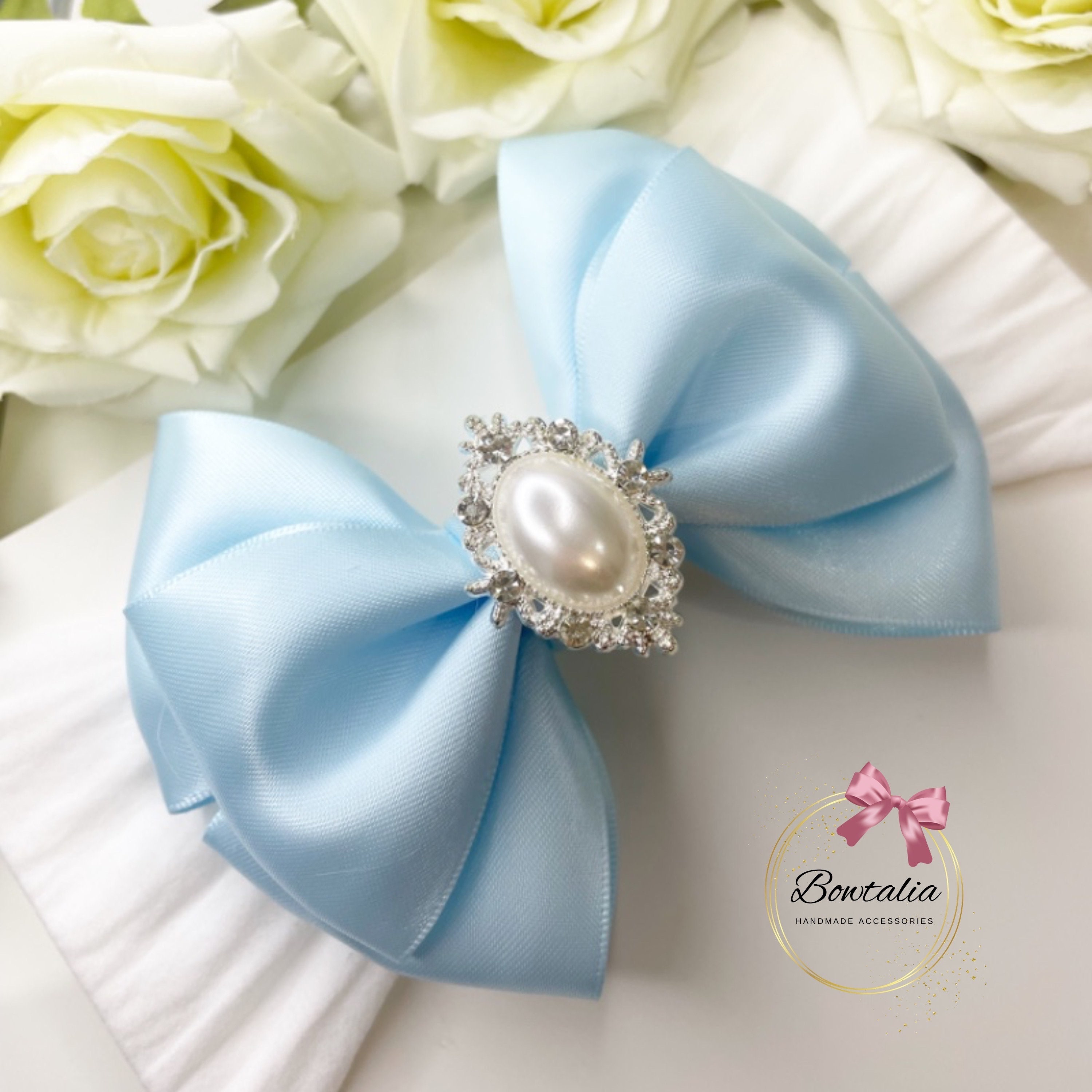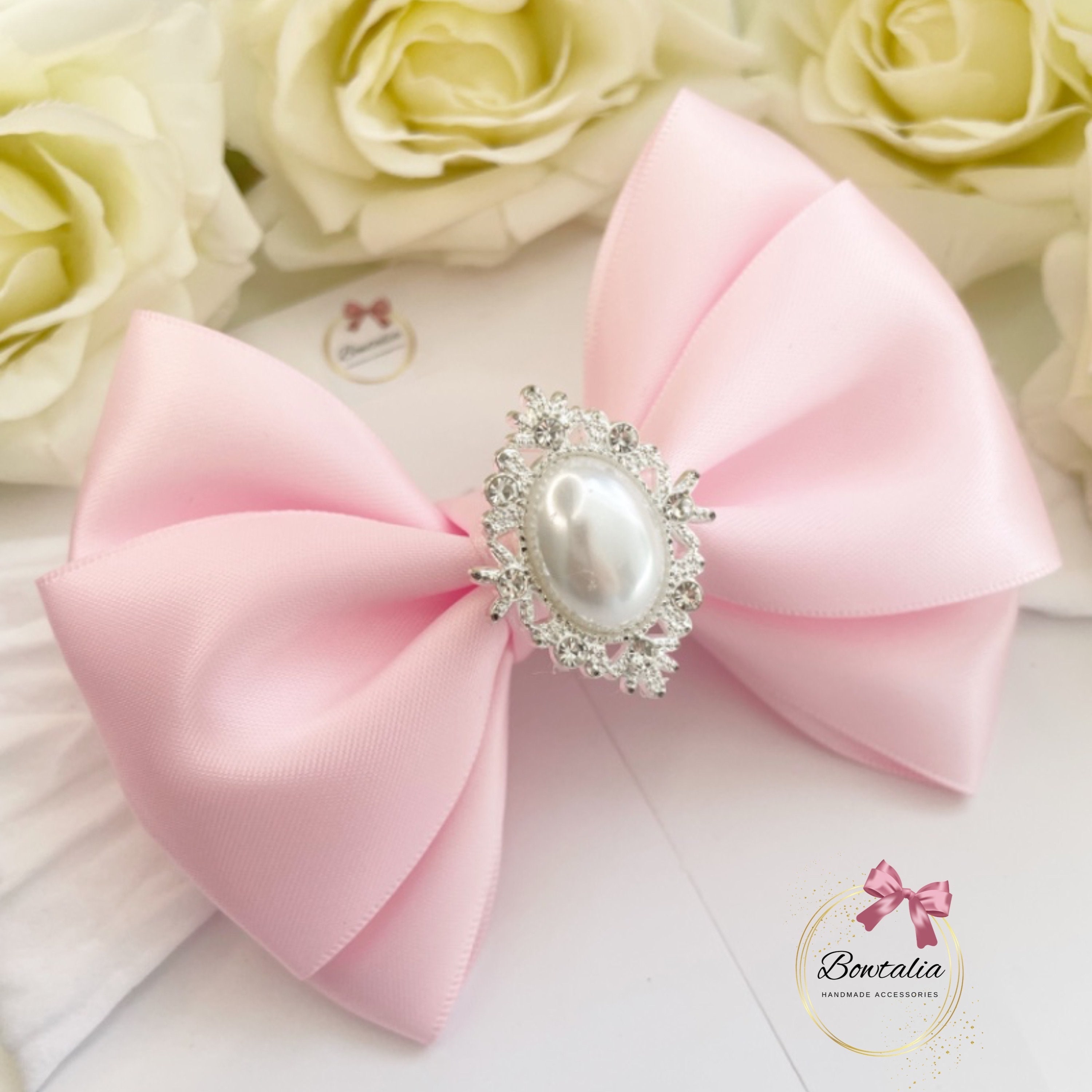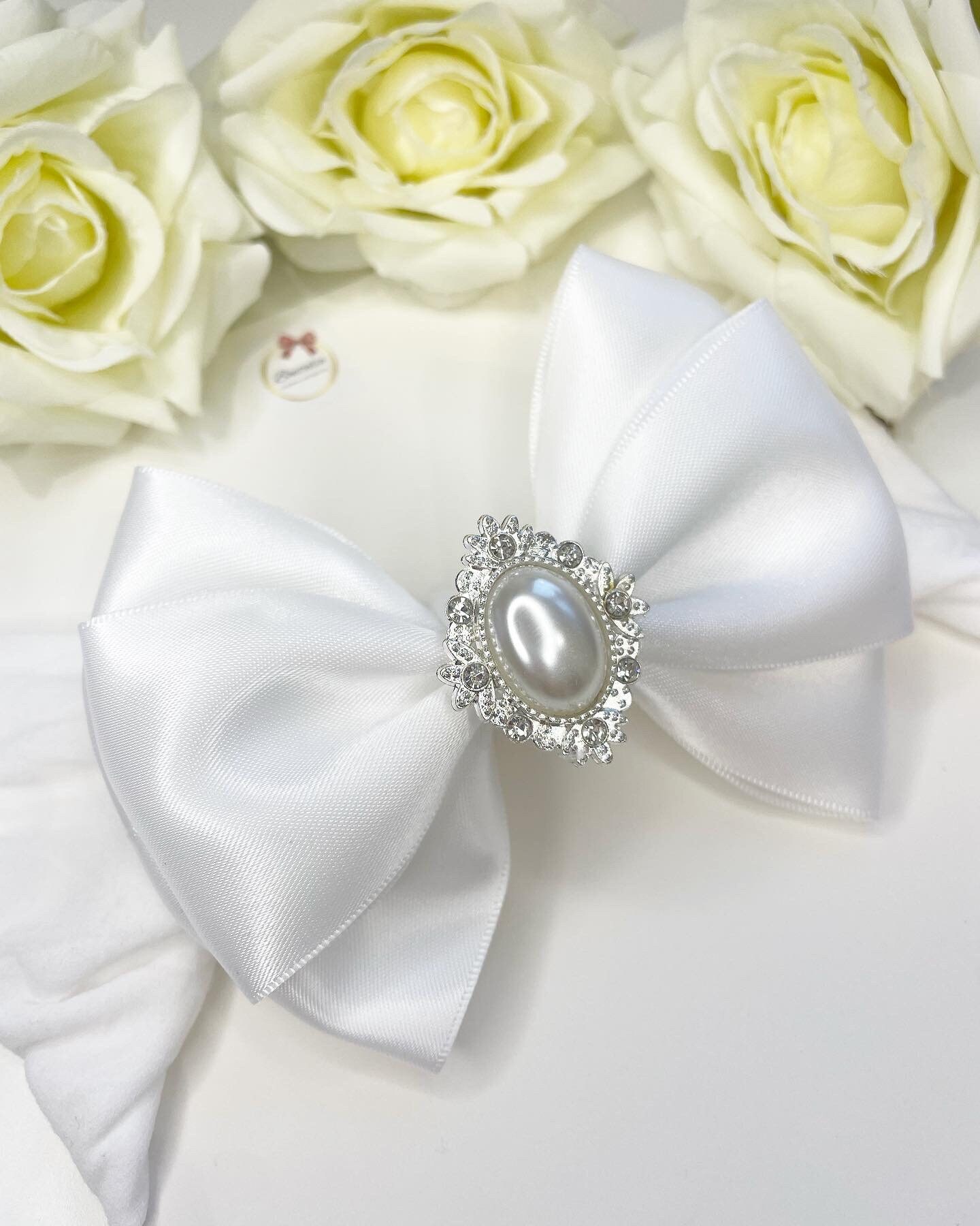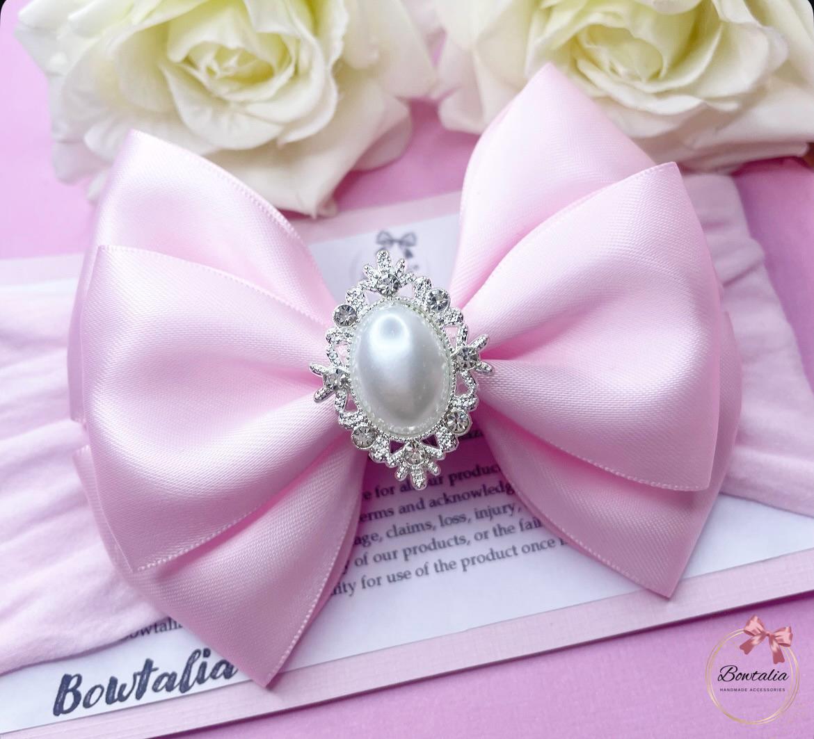 Our 'classic' bow with a pearl centre on a thick nylon headband. Simple but pretty to accessorise an outfit.