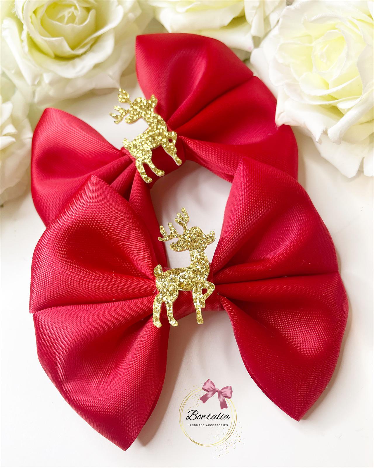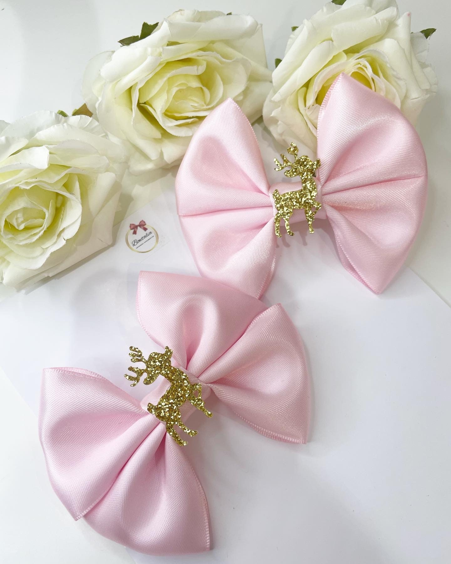 Light pink matching pigtail bow clips with a sparkly gold reindeer centre. This listing is for 2 matching pig tail clips - the bows are attached to a crocodile clip.