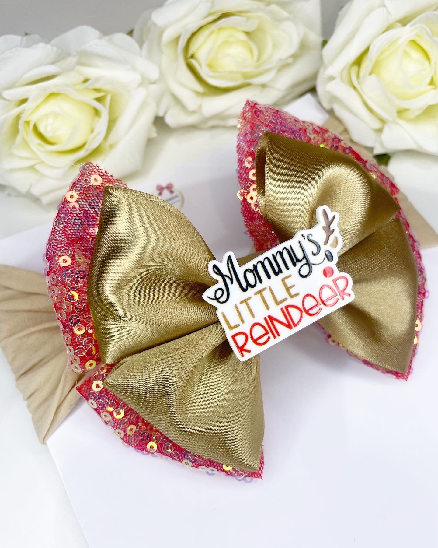 The 'mummies little reindeer' bow attached to a thick nylon headband. Perfect to match Christmas outfits.