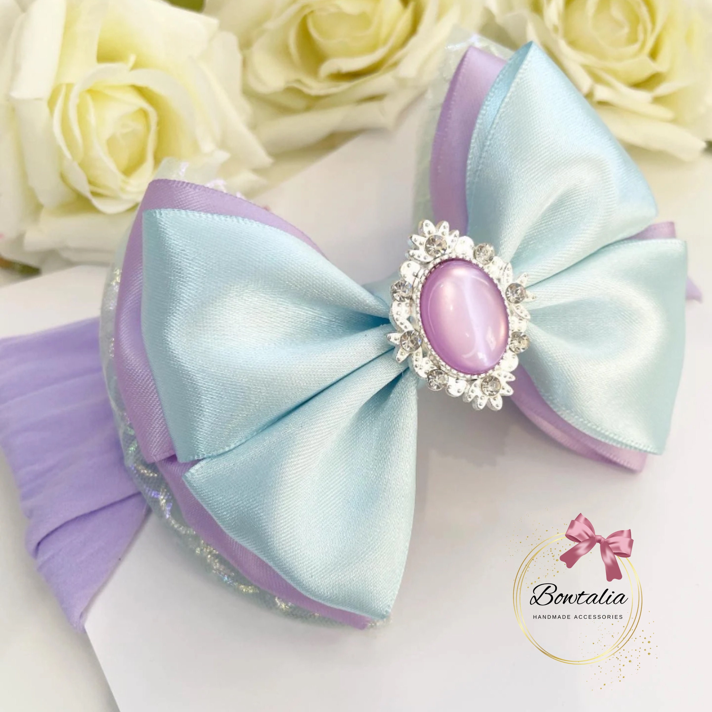 Mermaid inspired bow with a purple embellishment on a thick nylon headband. So pretty and sparkly for a birthday party.