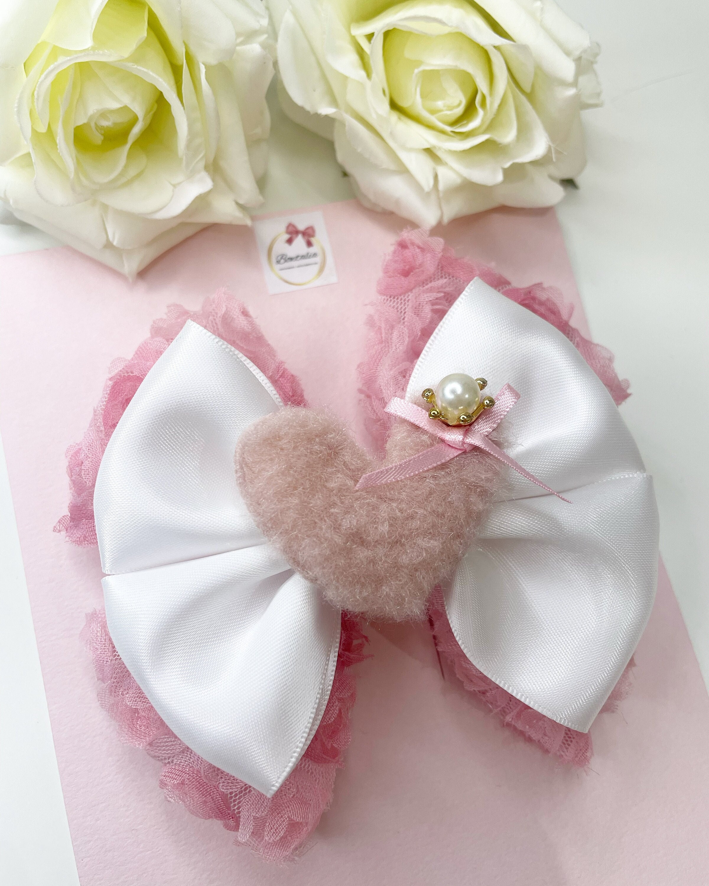 Beautiful handmade valentines hair bow. Made from dusty pink rose tulle and white ribbon with a fluffy heart centre. So pretty to accessorise an outfit.