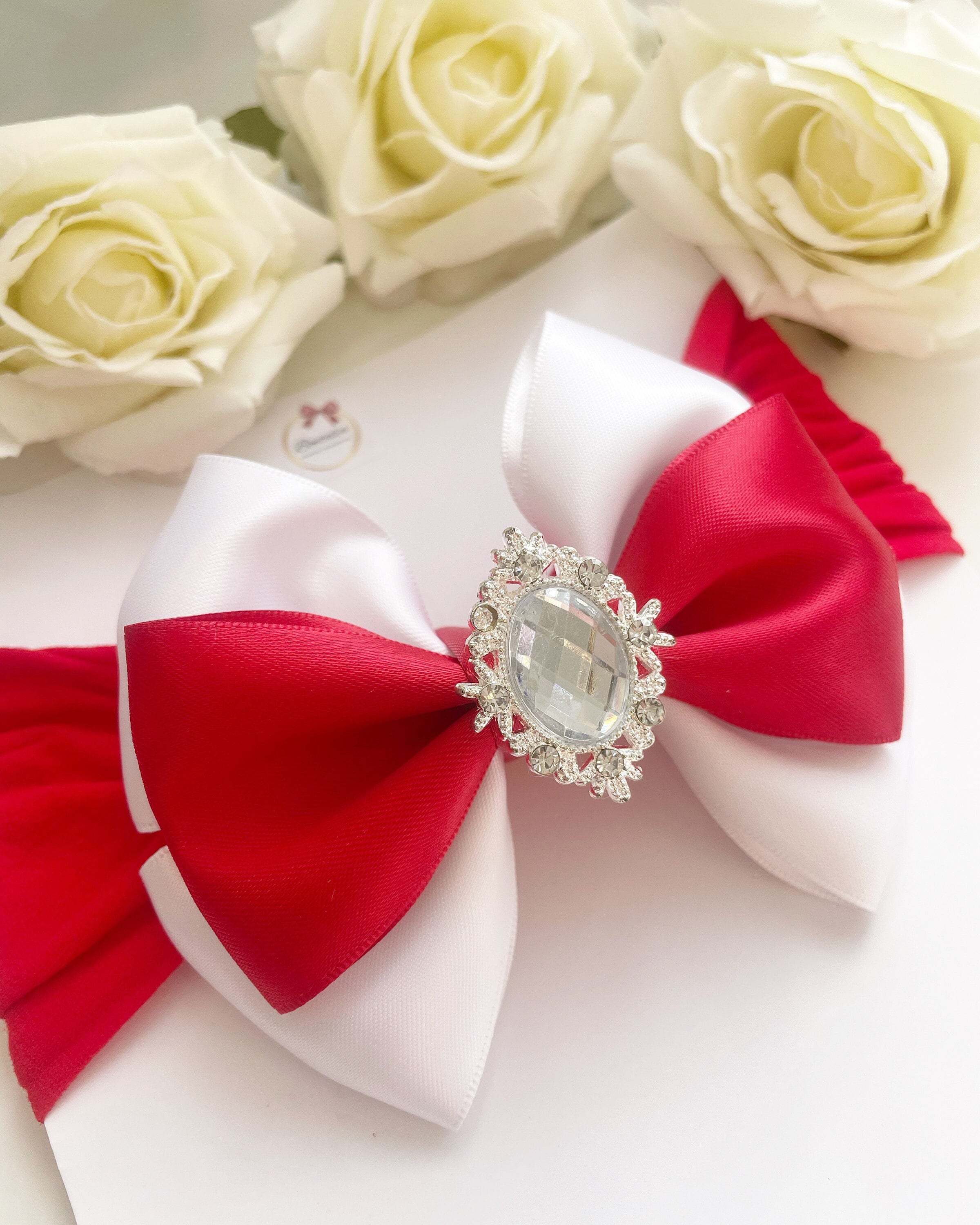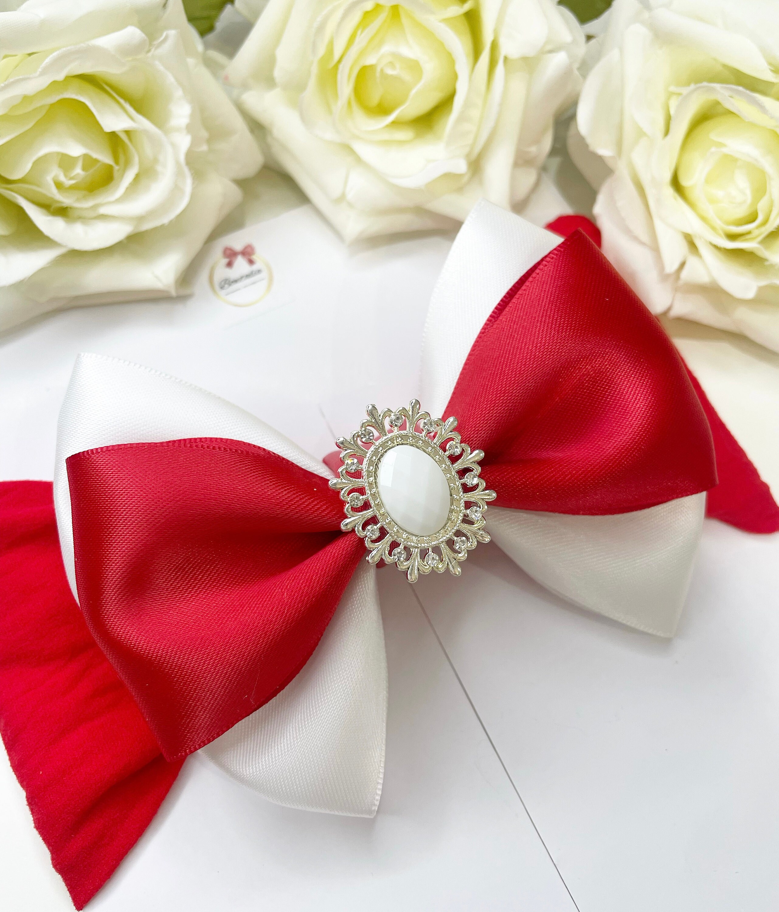 White and red layered bow with a silver centre on a thick nylon headband. Simple but pretty to accessorise an outfit.