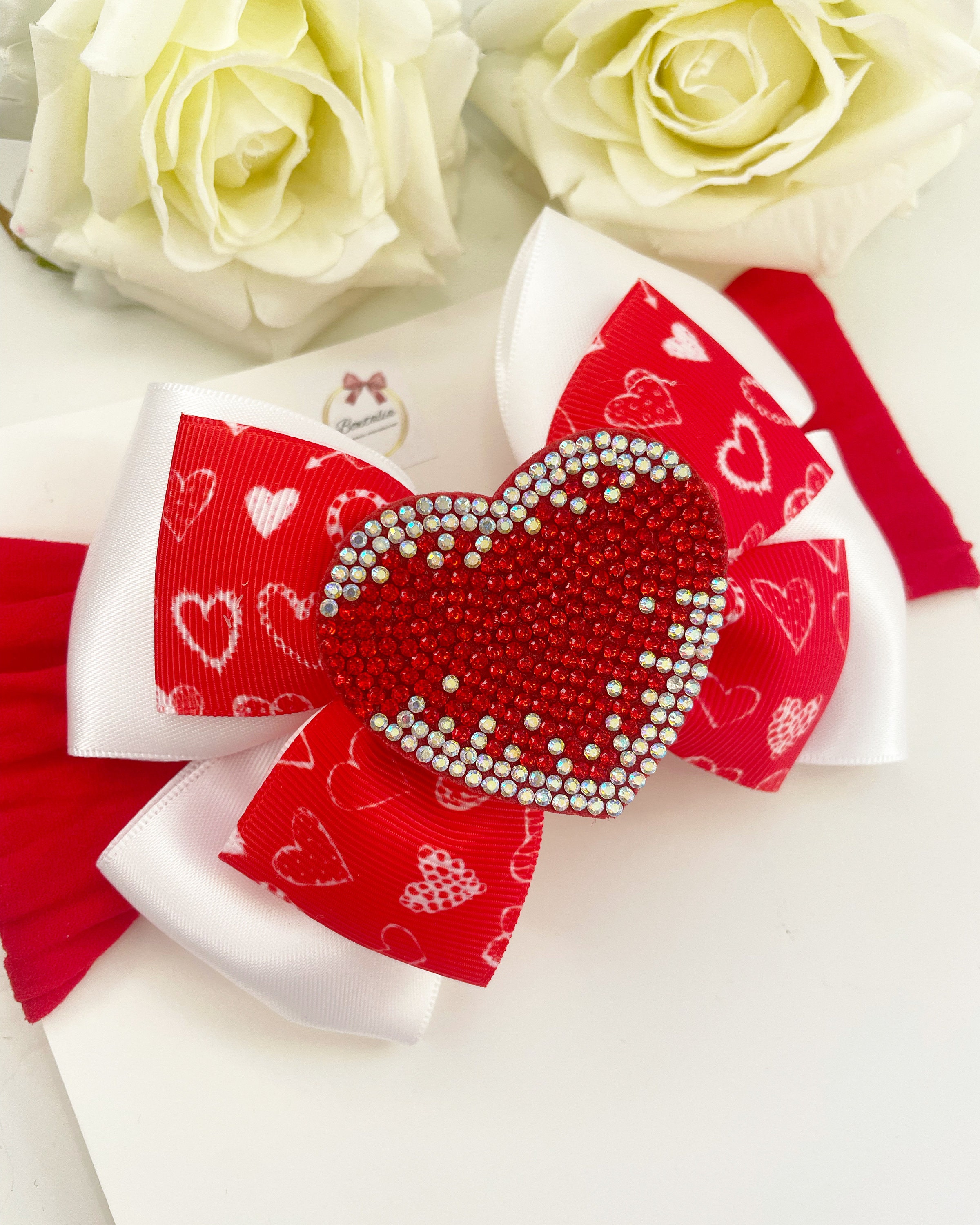 Beautiful white and red bow with a sparkly heart centre. Perfect for valentines day.