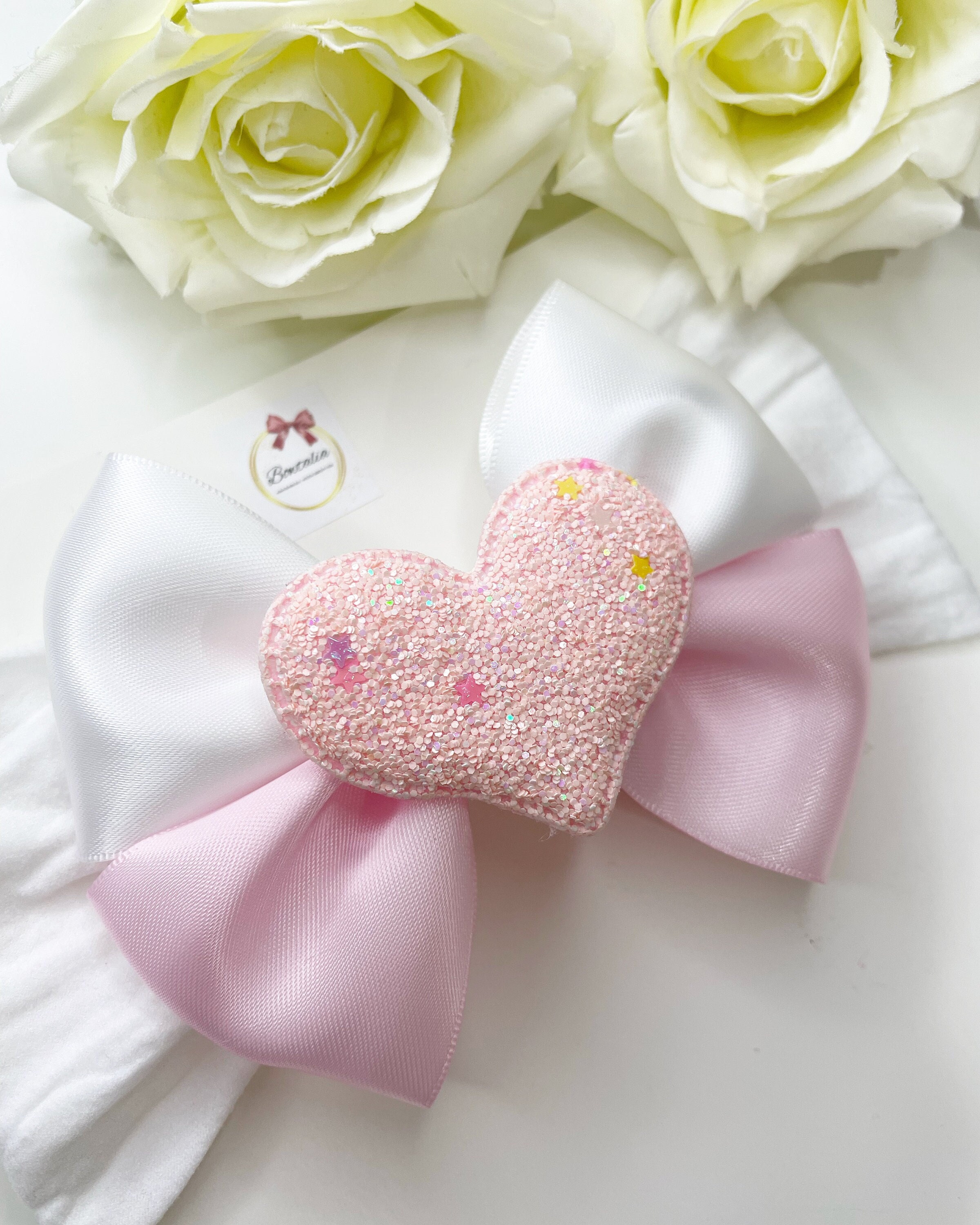Beautiful split colour pink and white bow with a sparkly heart centre. Perfect for valentines day.