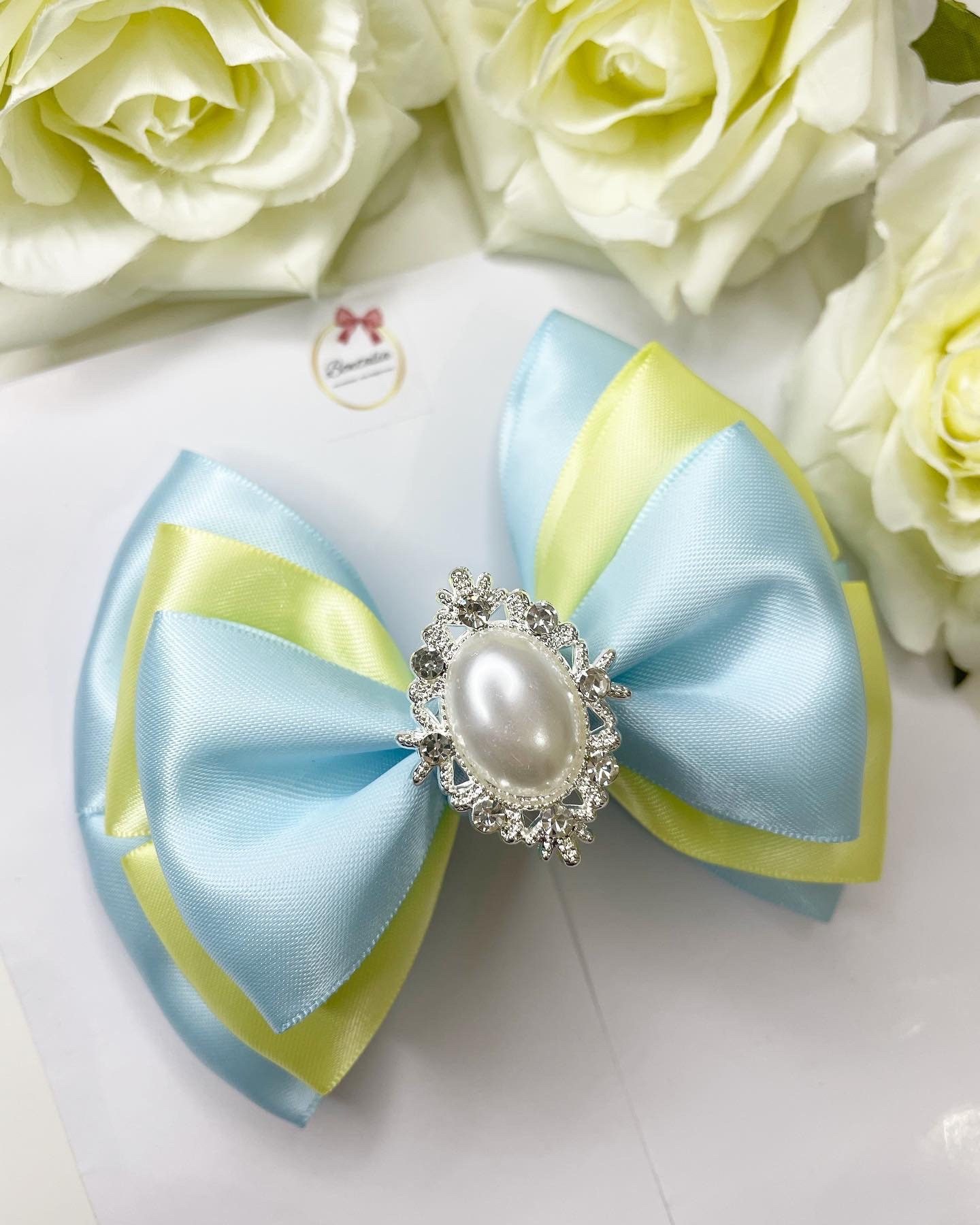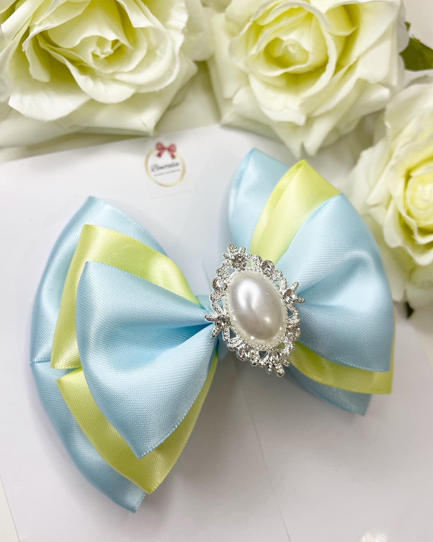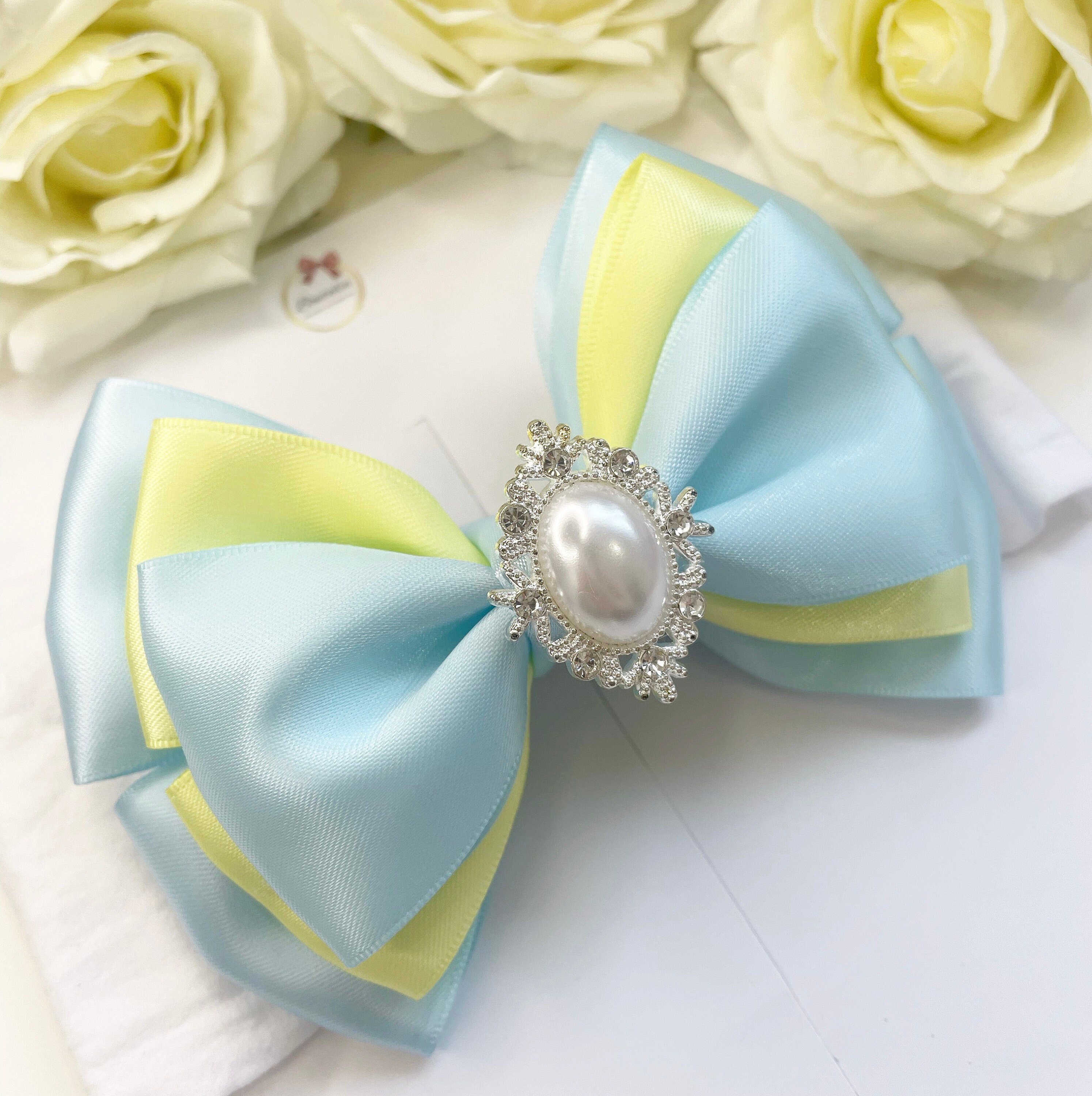 Beautiful light blue and lemon layered bow with a pearl embellishment centre.