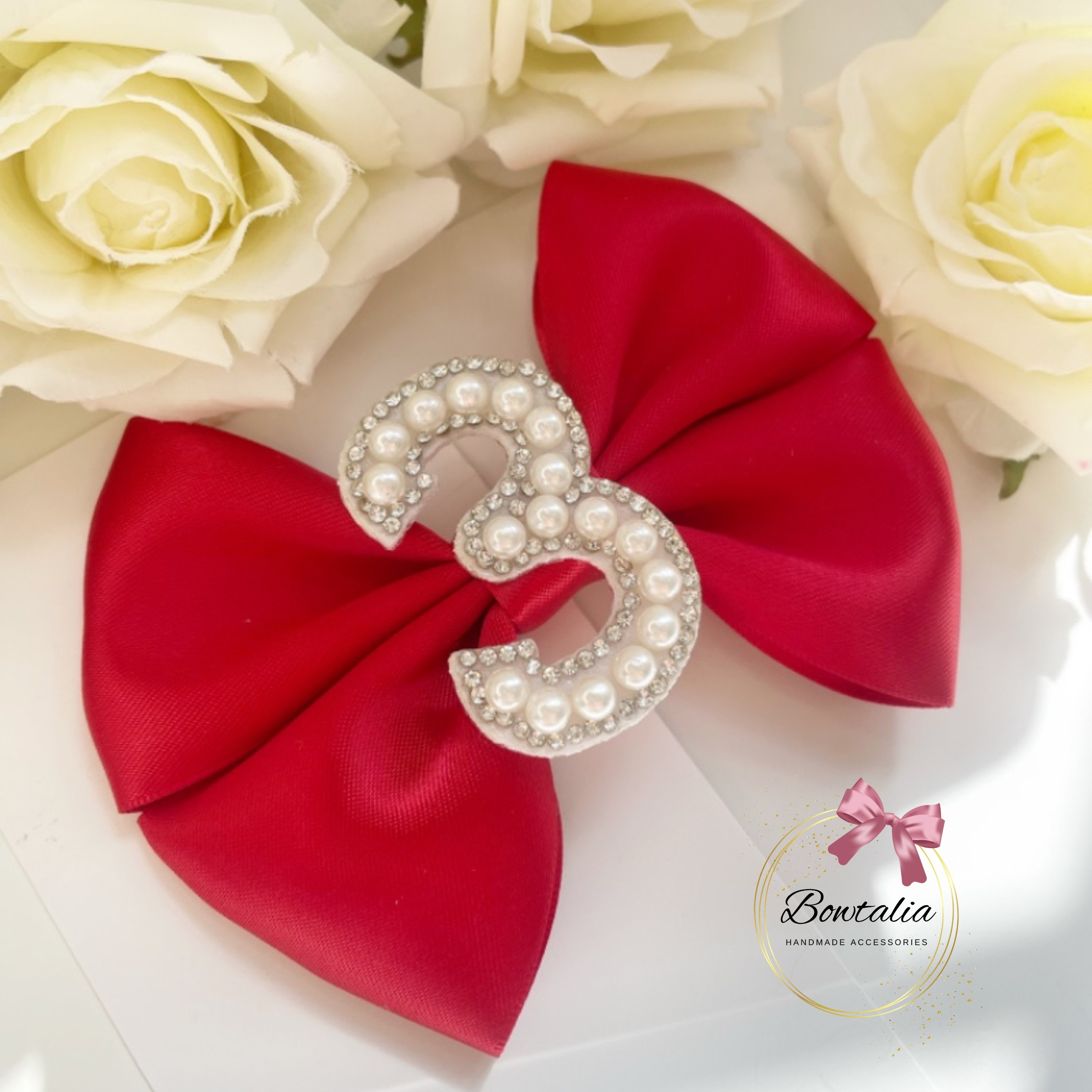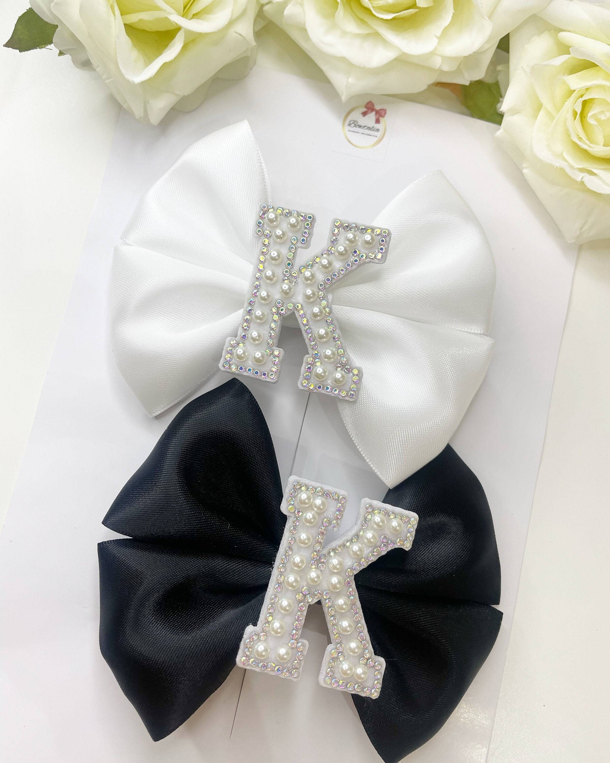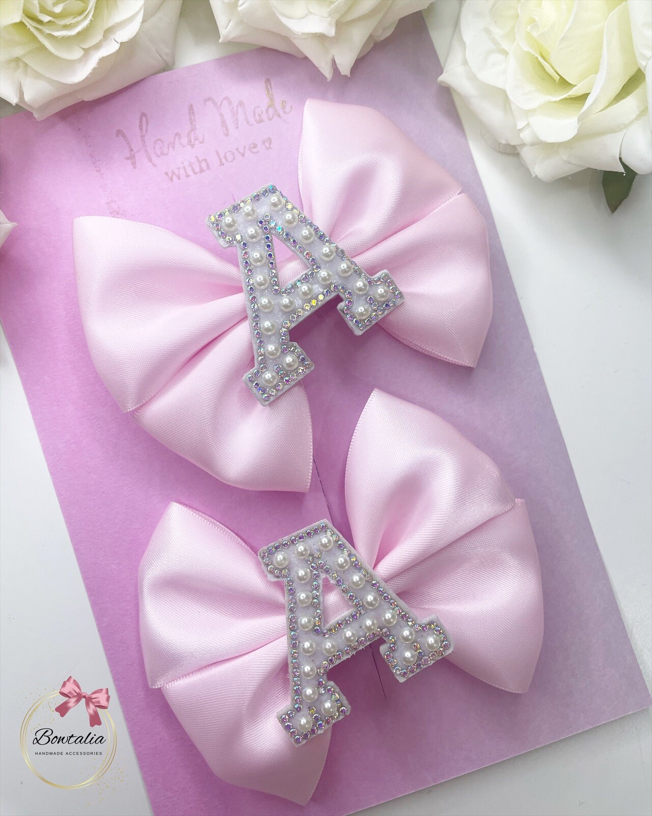 A beautiful handmade bow with a Pearl initial centre attached to a crocodile clip. So pretty to accessorise an outfit.