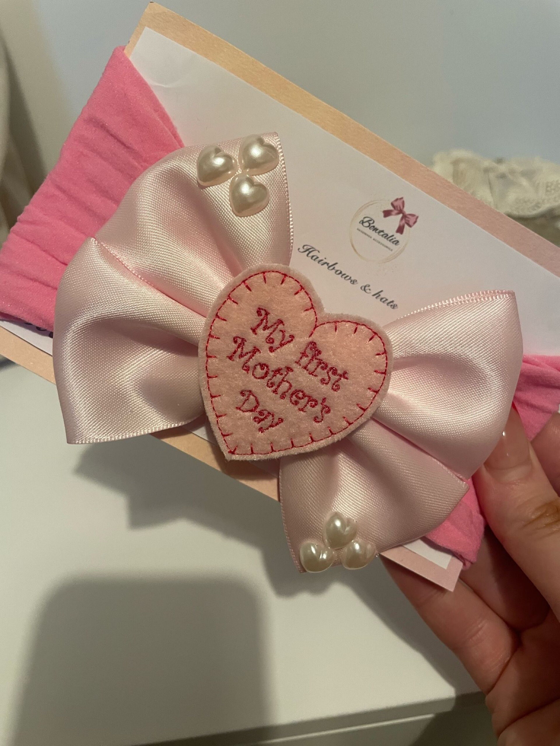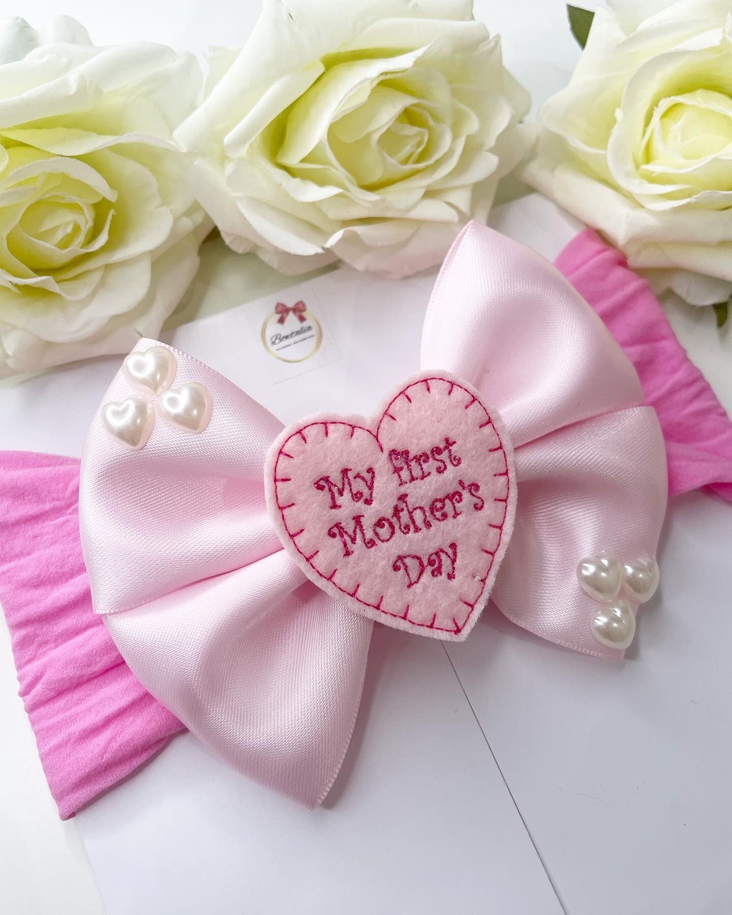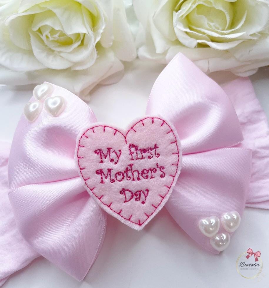 Beautiful pink bow with an embroider patch 'my first mothers day' on a thick nylon headband. Perfect for celebrating Mothers Day.