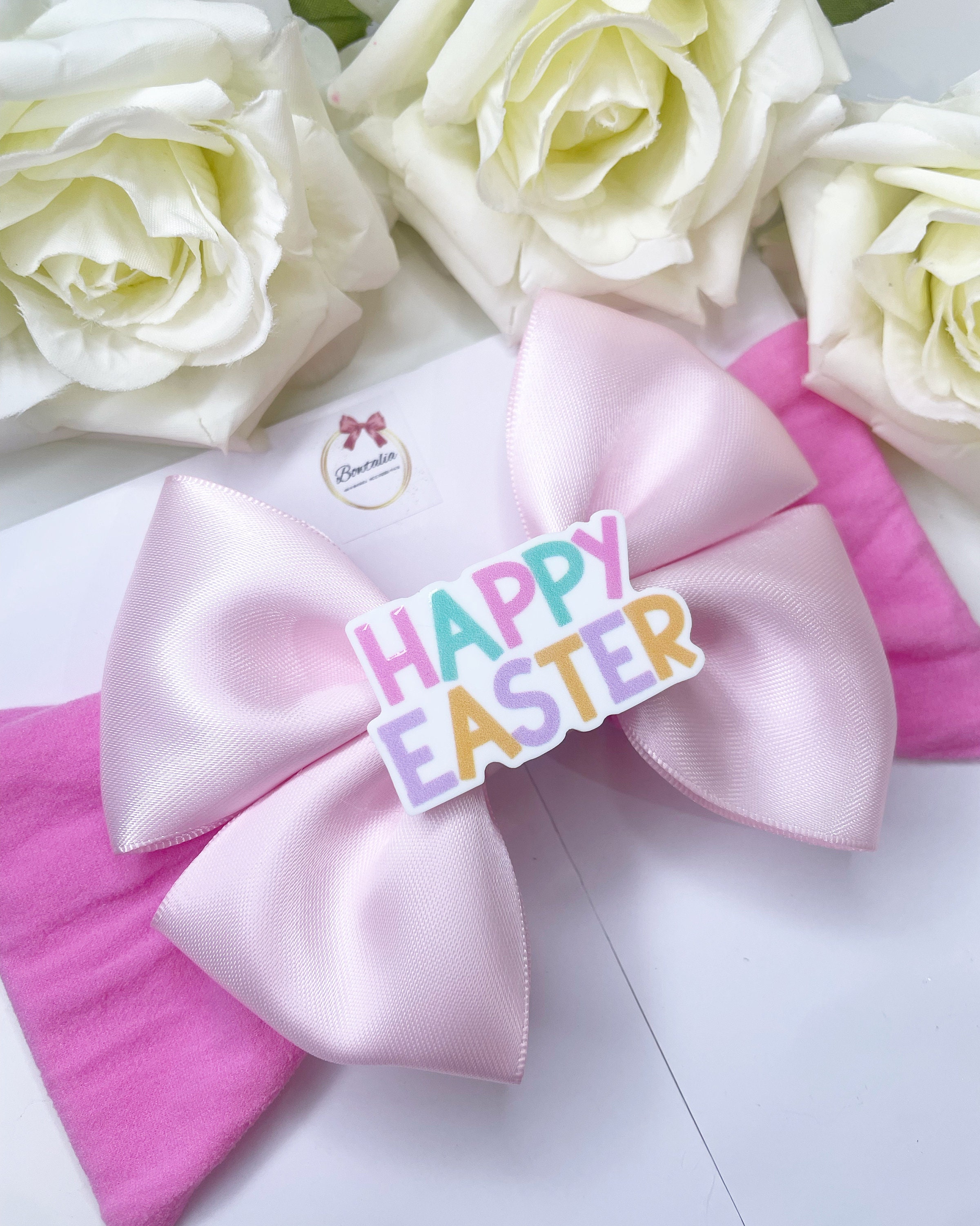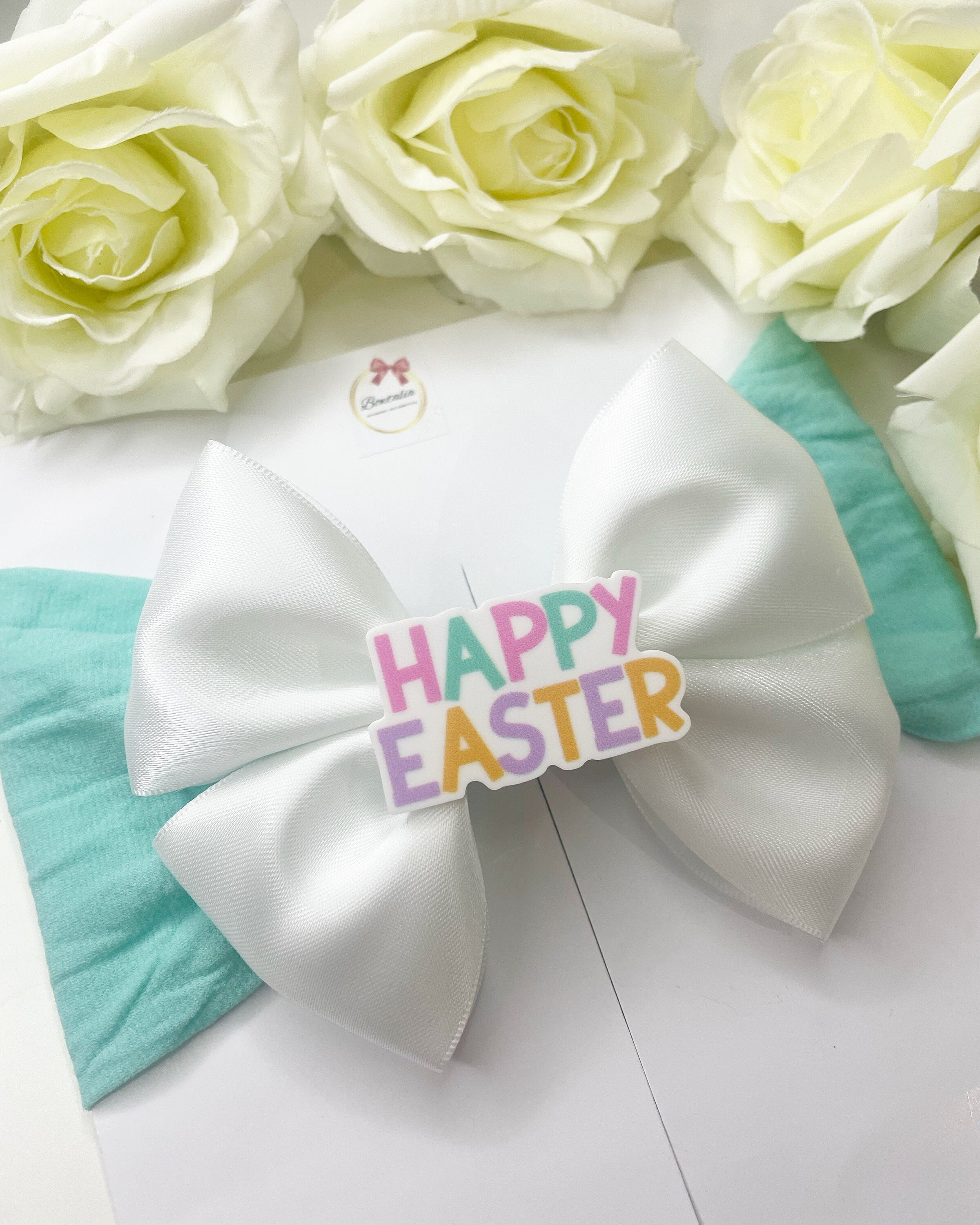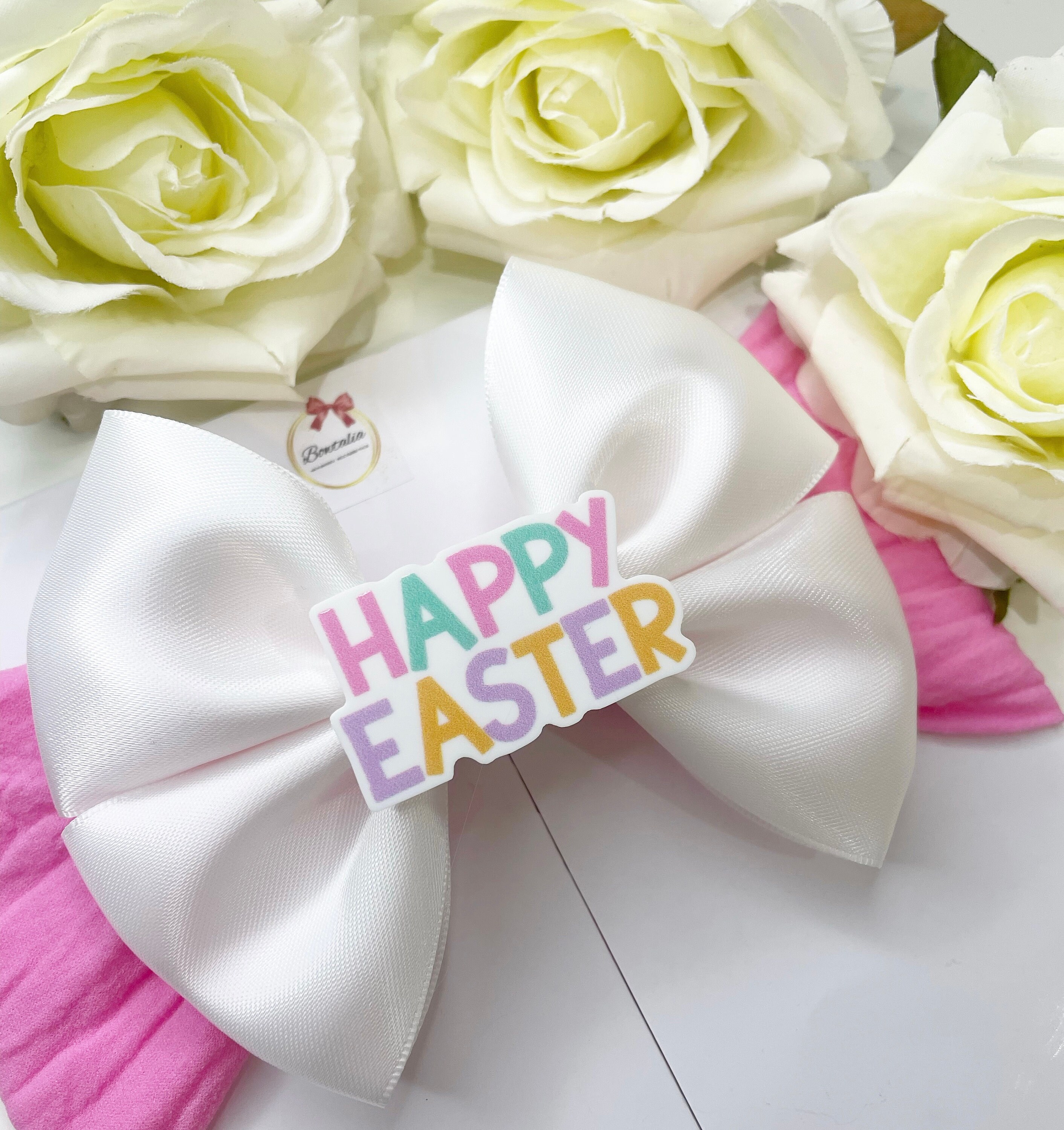 Beautiful white bow on a thick nylon headband with an 'happy easter' centre.