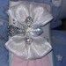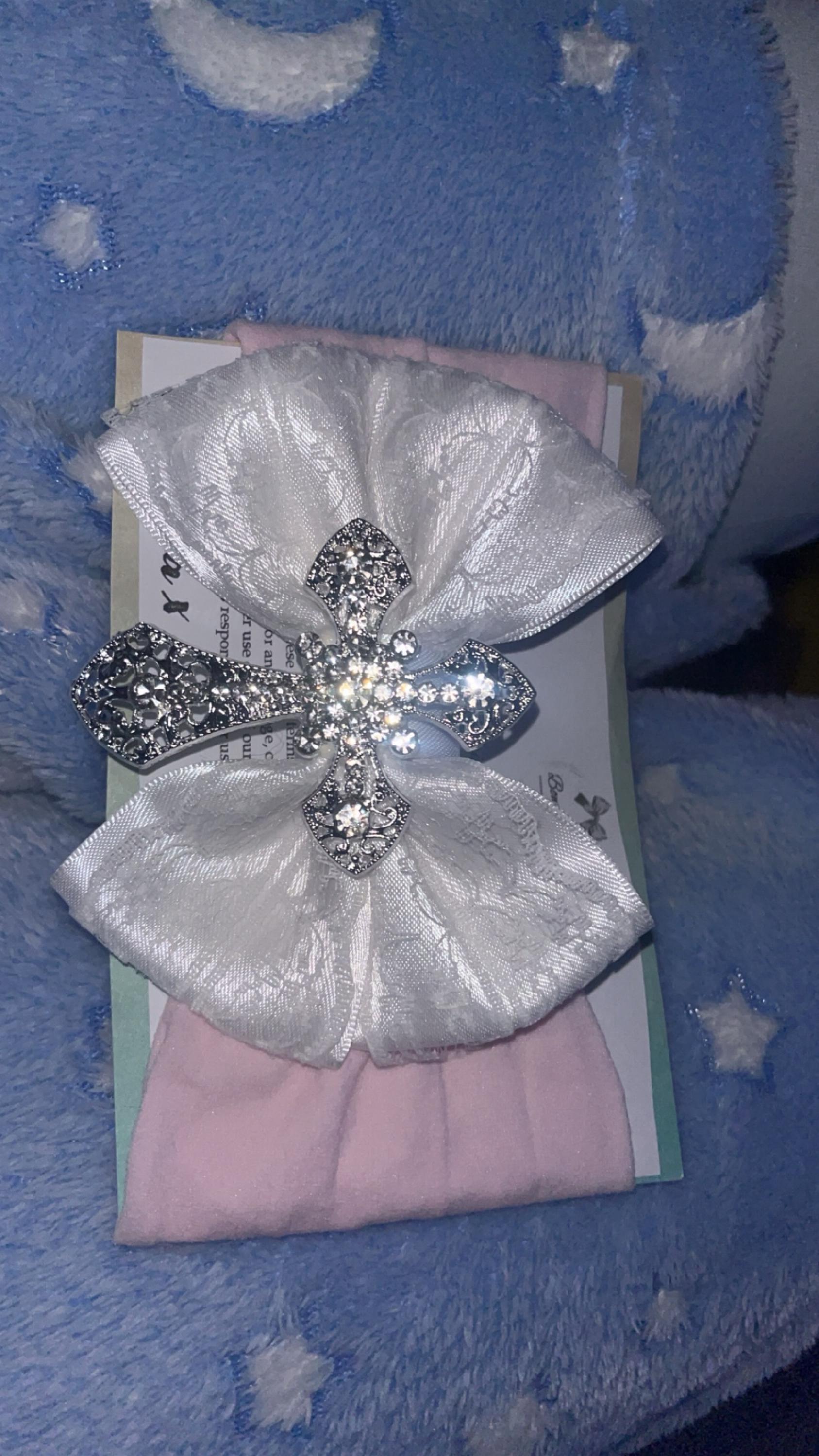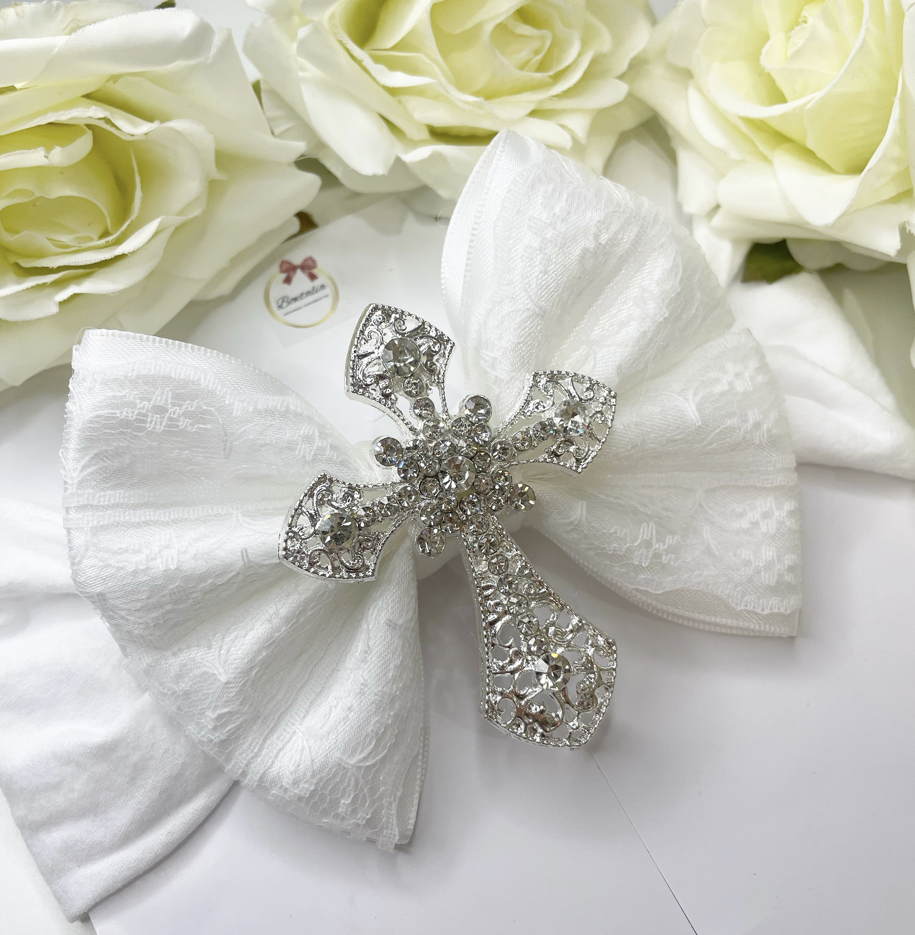 A beautiful white satin and lace bow with a large silver cross - perfect for a christening/holy communion.
