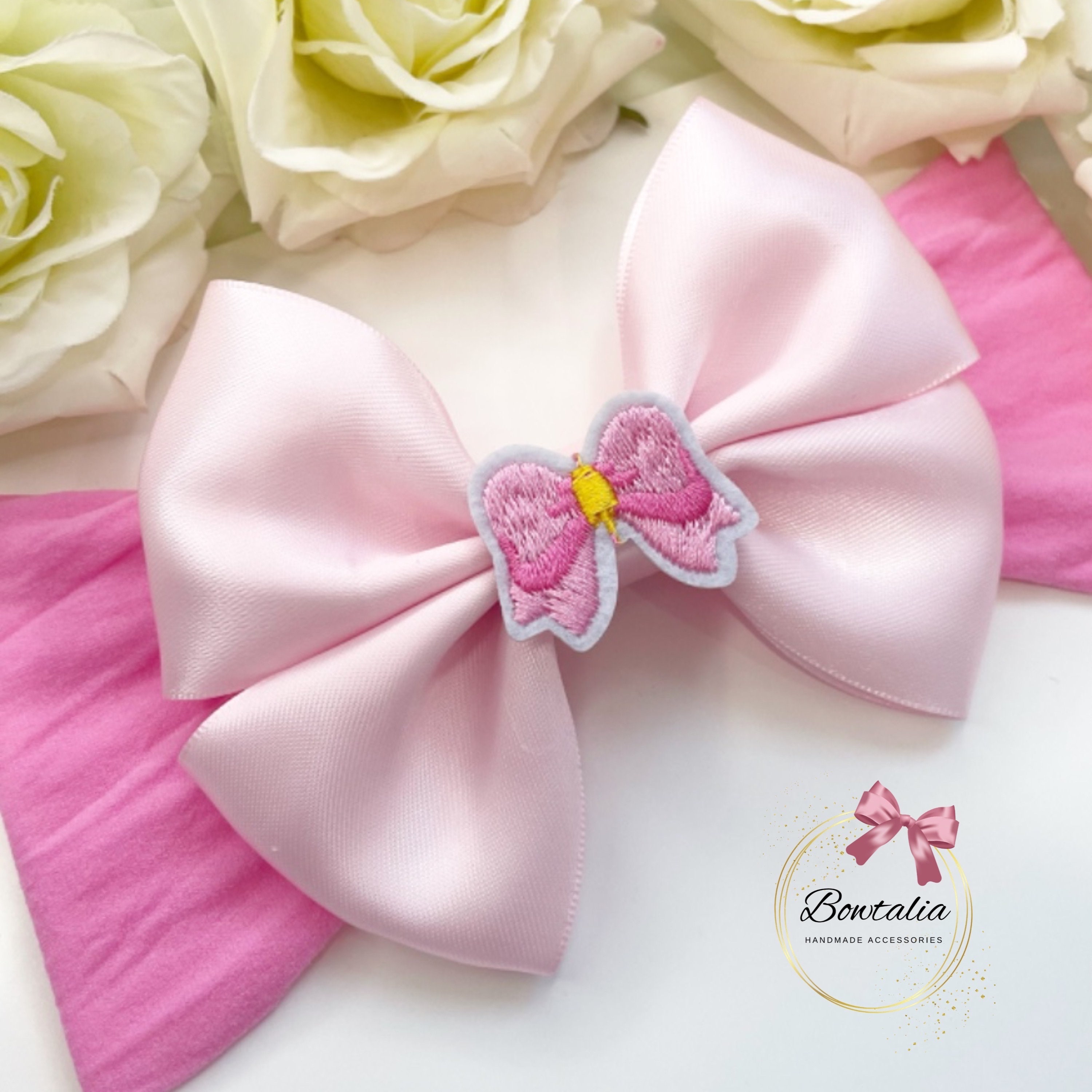 Beautiful pink bow on a thick bright pink headband headband with a bow embroider centre. So pretty to accessorise an outfit.