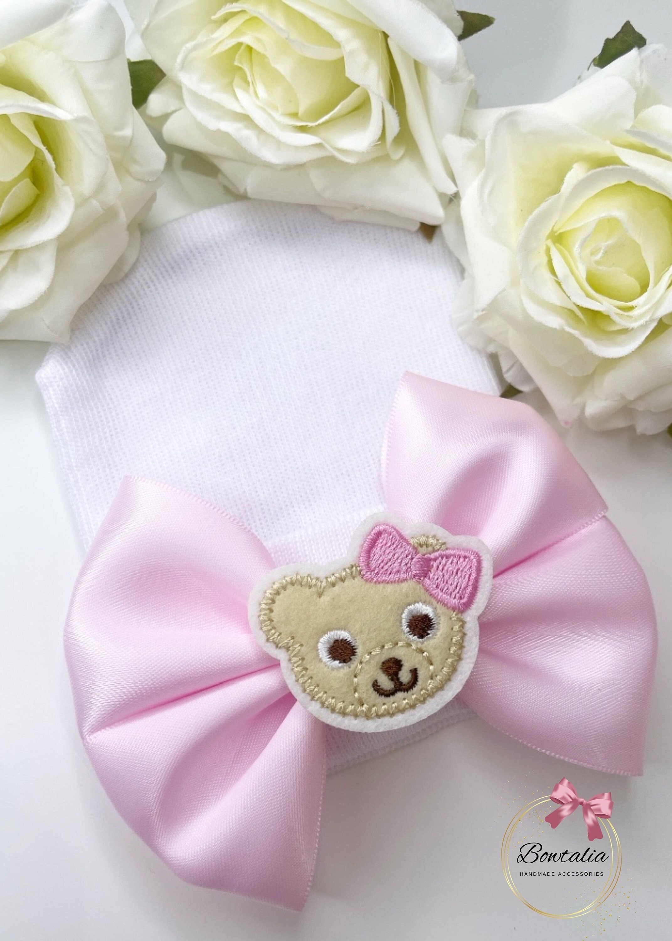 Beautiful unique newborn baby hat with an embroider bear for detail.