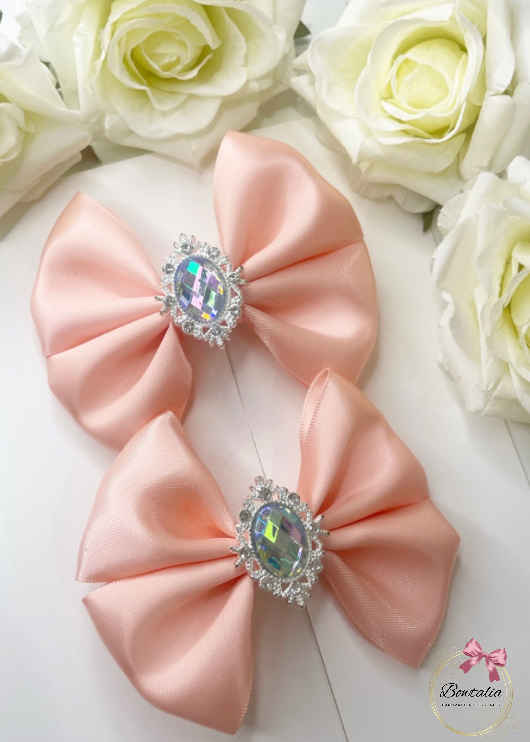 Matching pigtail bow clips with a hologram embellishment. This listing is for 2 matching pig tail clips - the bows are attached to a crocodile clip.