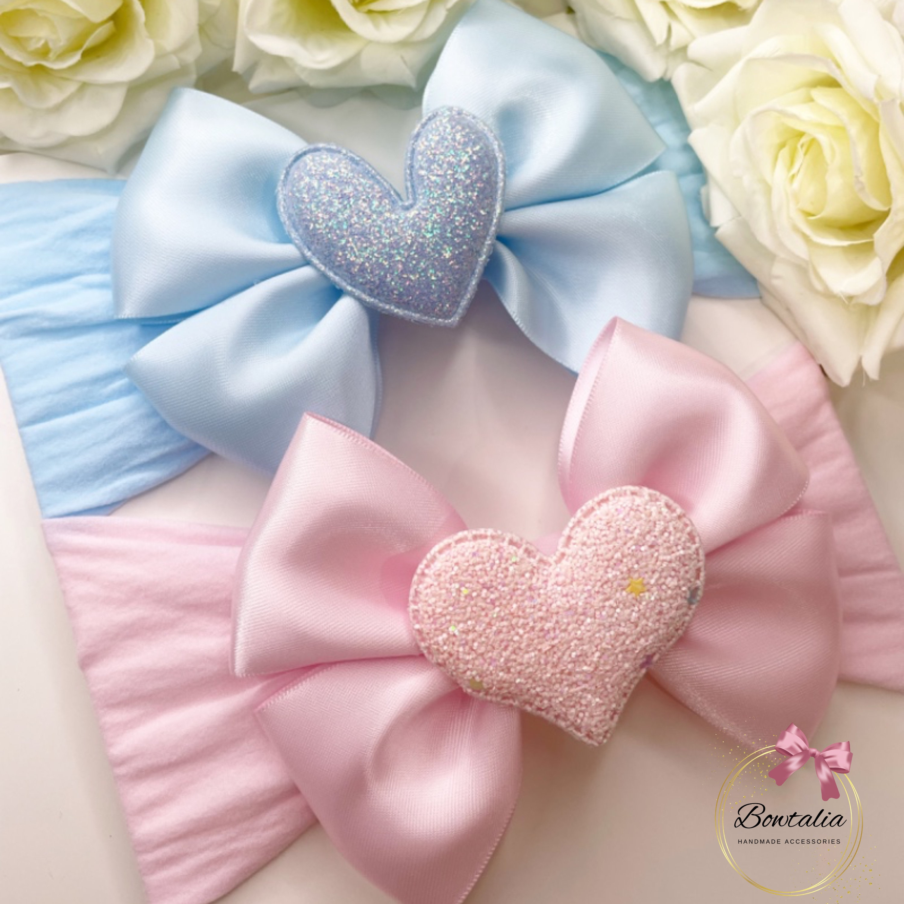 Beautiful light blue and light pink bows with heart centres. So pretty to accessorise an outfit.