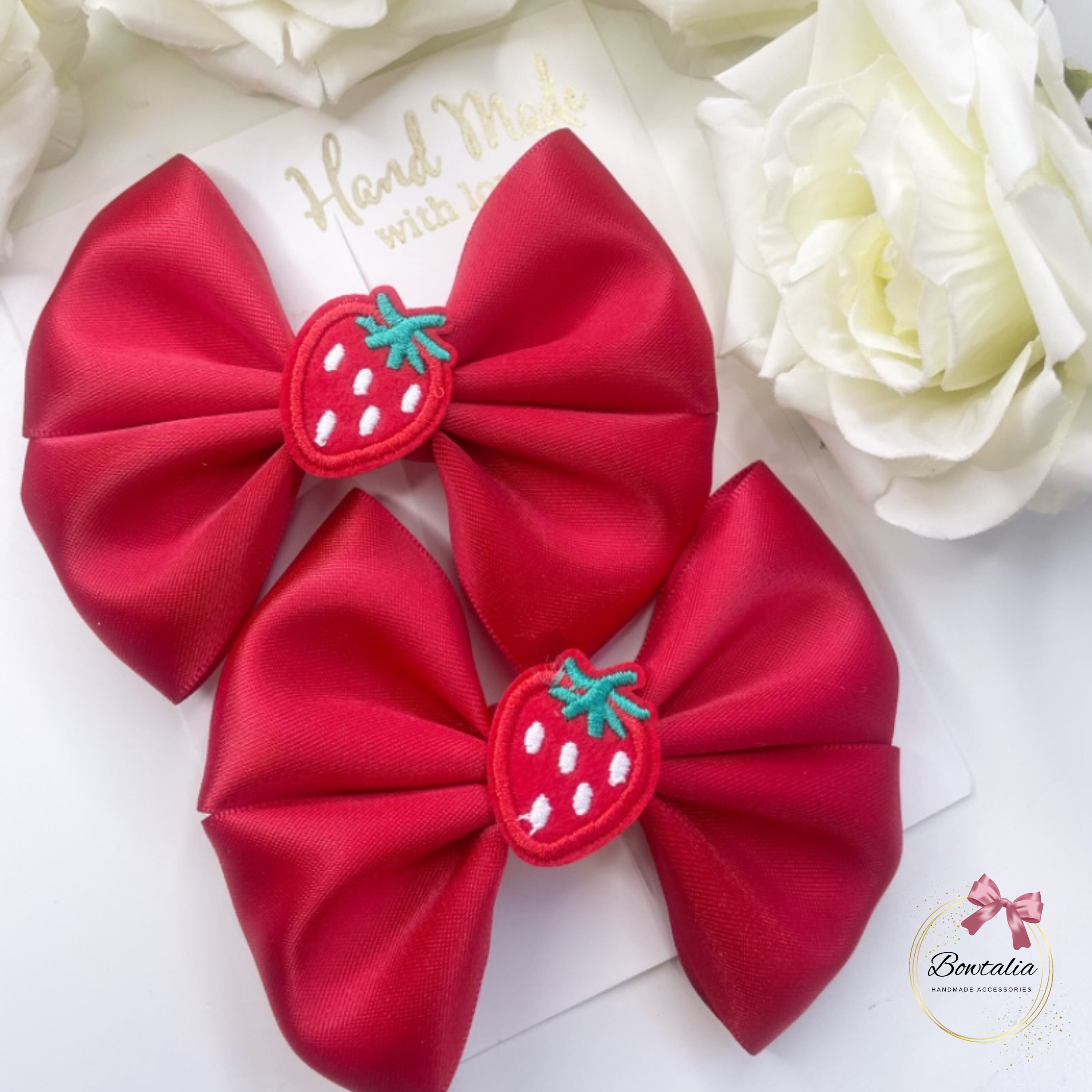 Beautiful handmade bow clips with a strawberry centre. This listing is for 2 x matching pigtail clips - attached to silver crocodile clips. So pretty to accessorise an outfit.