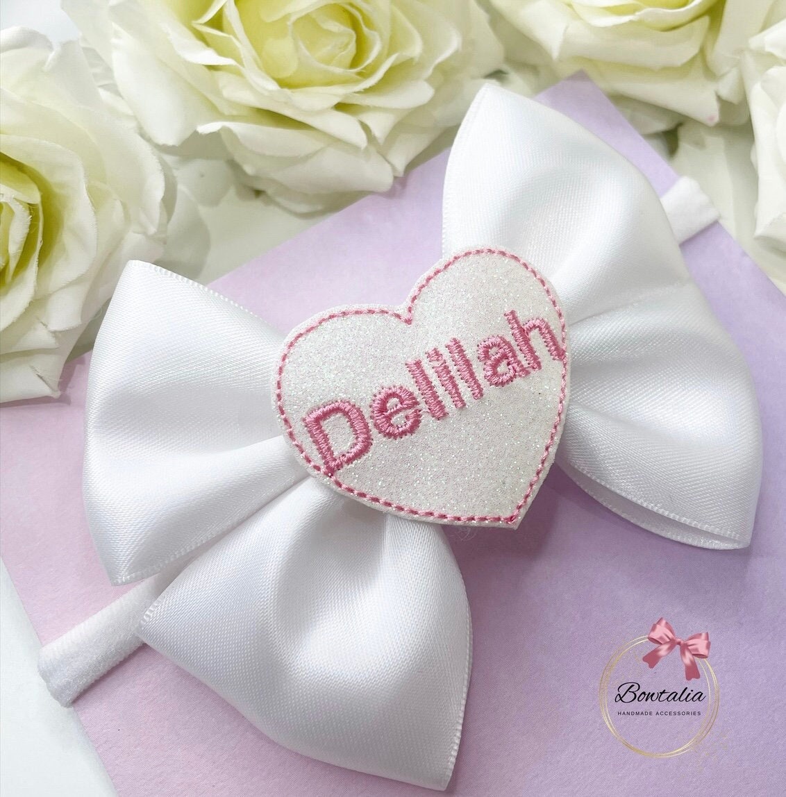 Beautiful handmade bow with a personalised glitter felt centre on a thin nylon headband. The text colour is light pink as shown in the example photo.