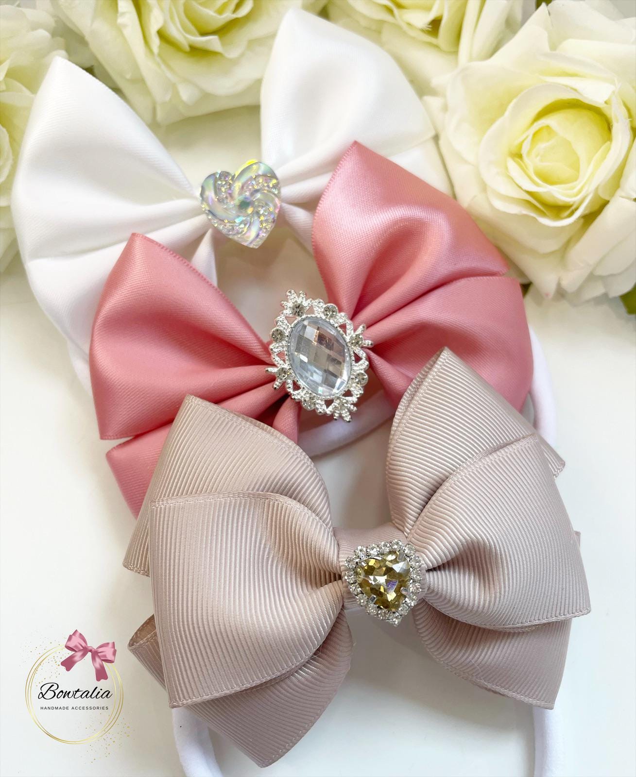 Beautiful handmade bow bundle - each bow is attached to a thin soft white nylon headband. So pretty to accessorise a summer outfit.