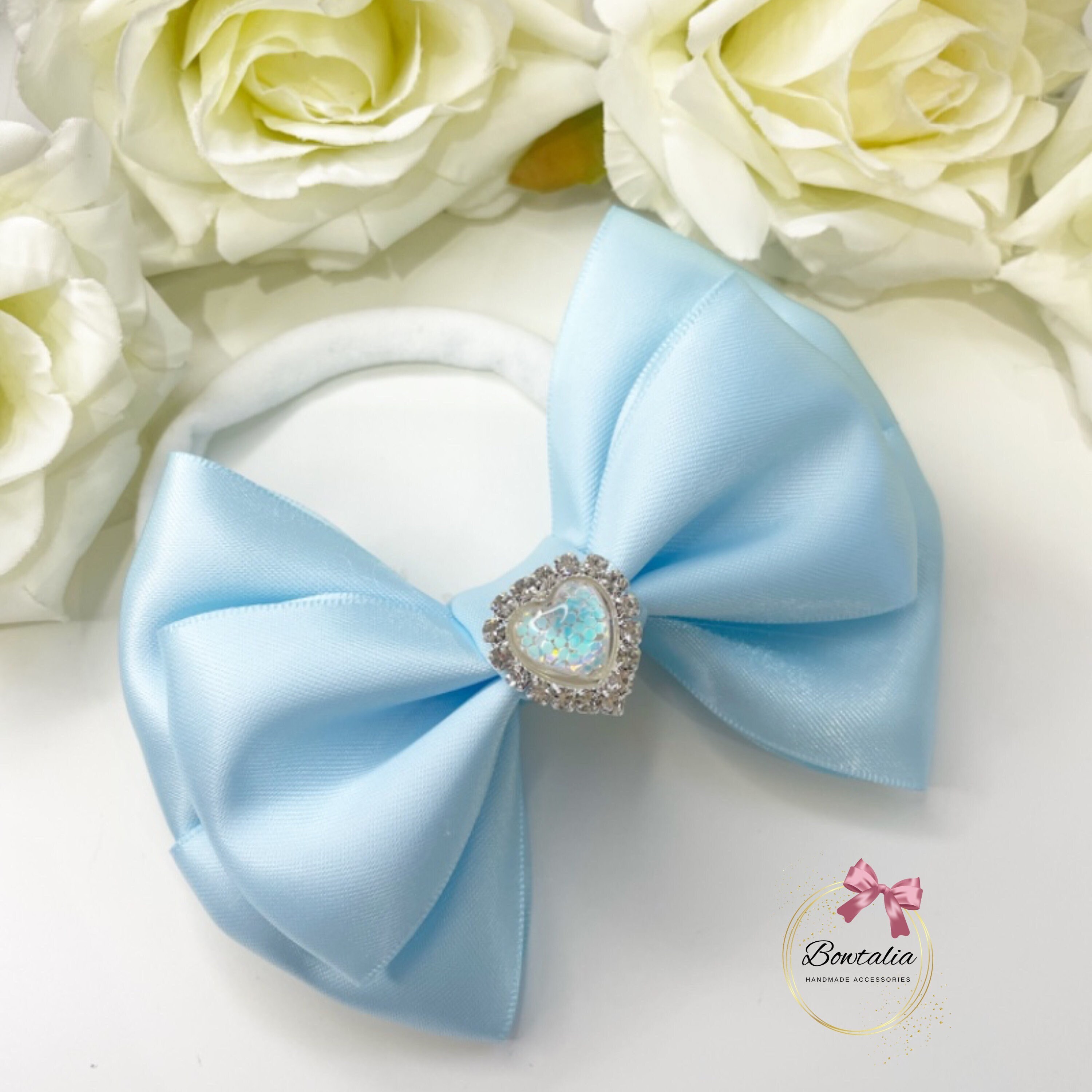 A beautiful light blue bow with a confetti heart centre on a thin white nylon headband.