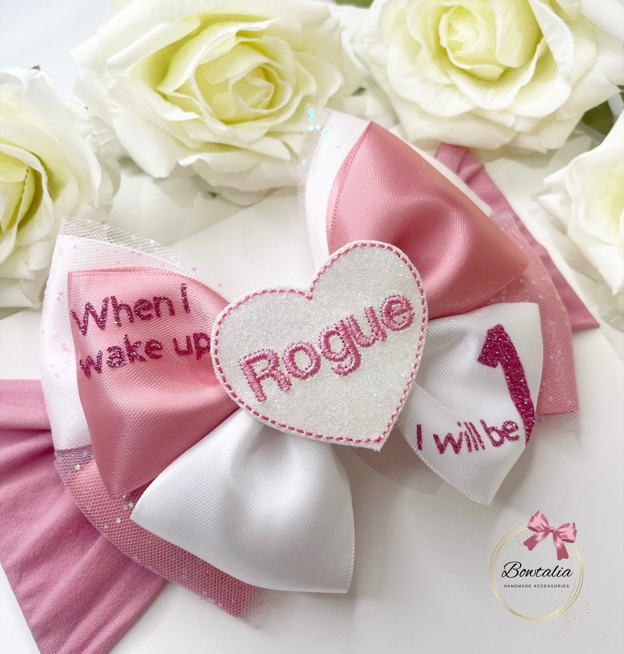 A stunning dusty pink and white birthday bow with a personalised glitter felt centre and vinyl text 'when I wake up I will be 1'. Perfect for birthdays.
