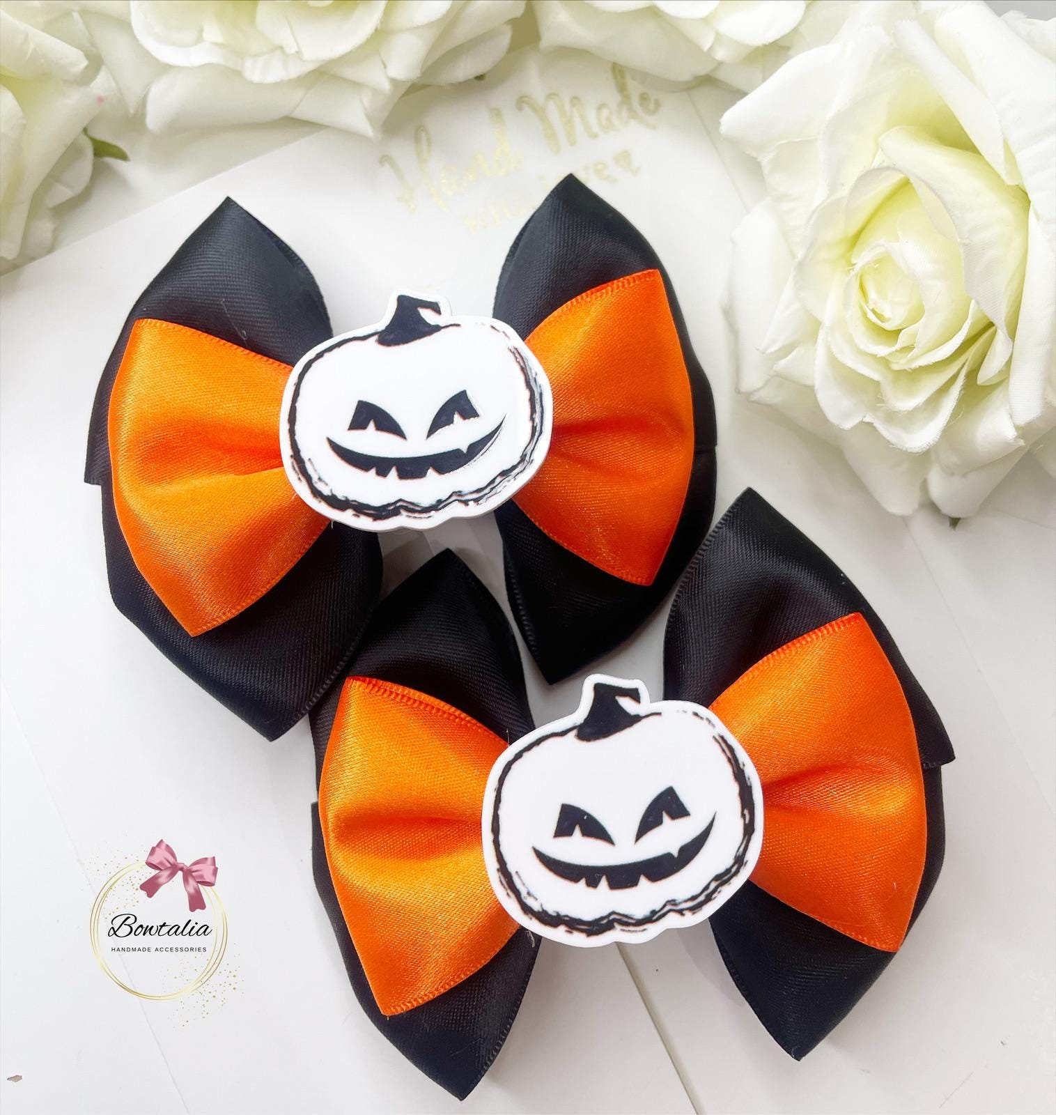 Black and orange bow clips with a pumpkin centre. Perfect to match with a halloween outfit.