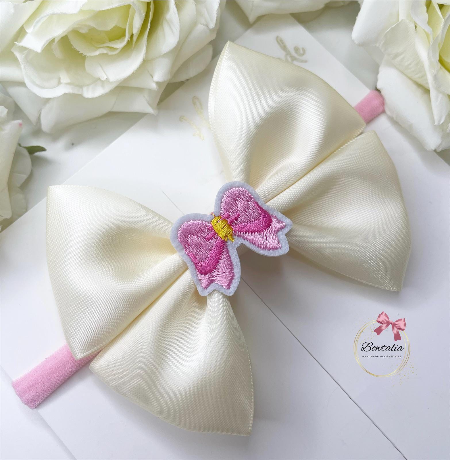 Beautiful cream bow with an embroider centre attached to a thin pink nylon headband. Perfect for birthdays and events.