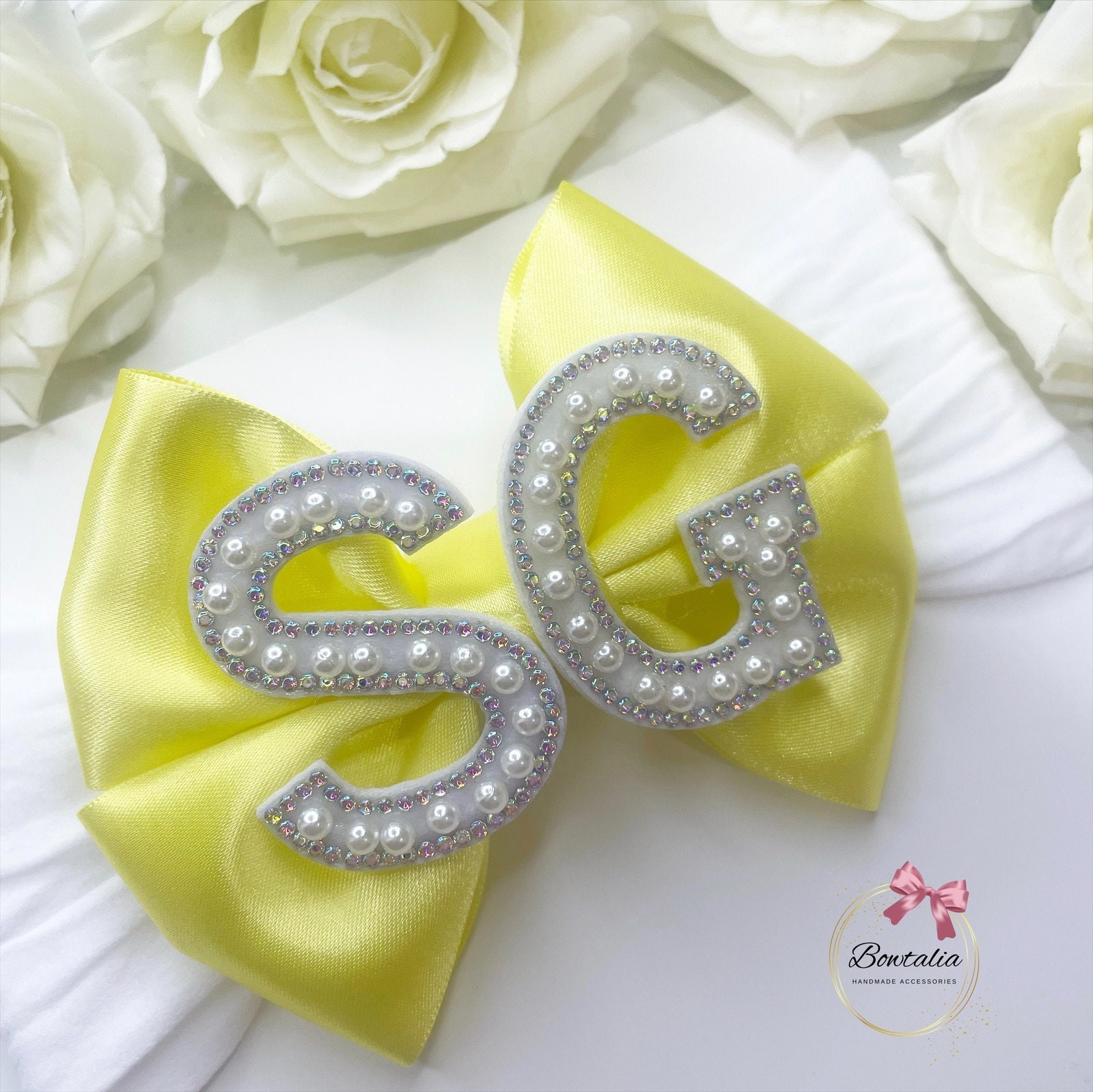 A beautiful handmade bow with a double Pearl initial centre on a thick white nylon headband. So pretty to accessorise an outfit.