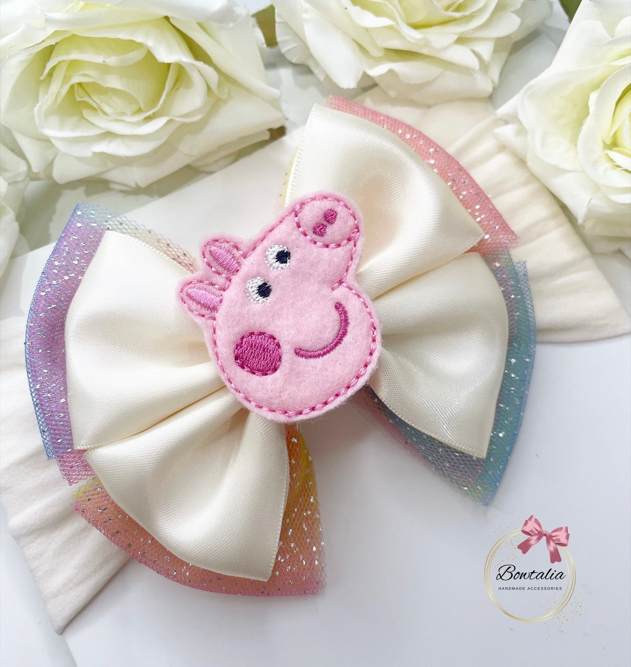 Stunning bow with a pig felt centre on a thick nylon headband. Perfect for birthdays.