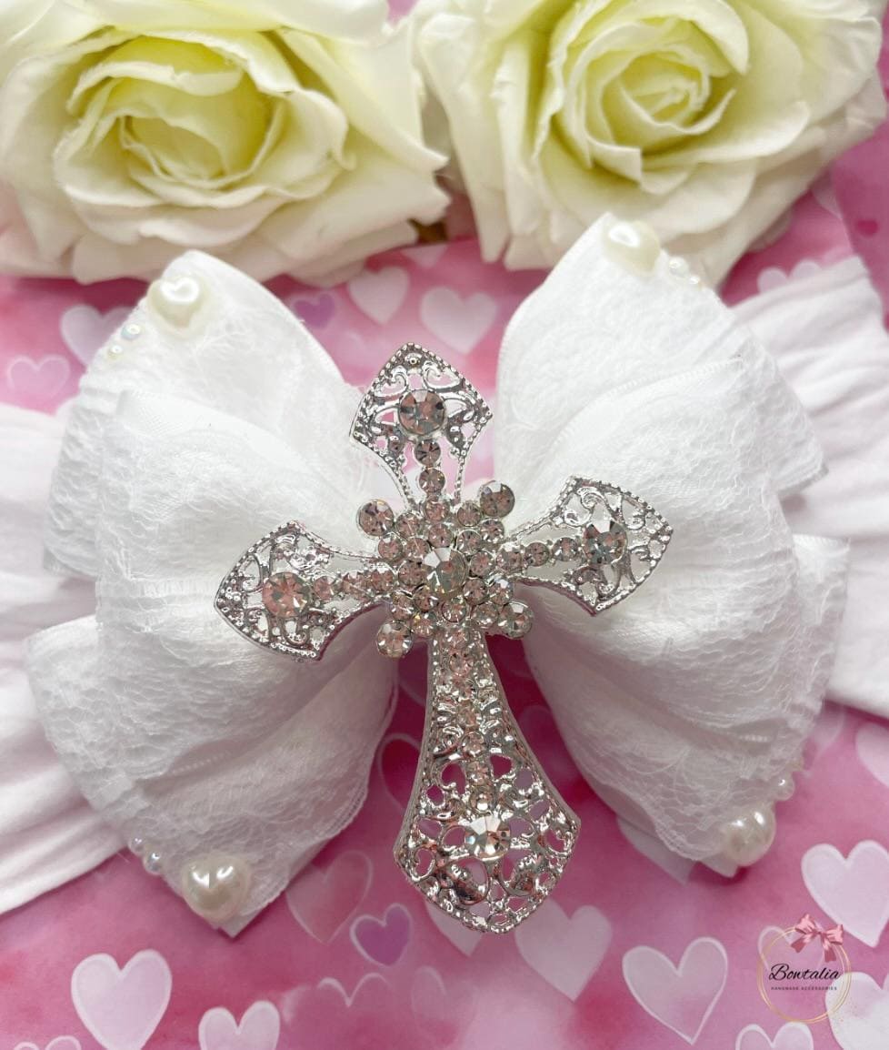 A beautiful white layered bow with a large silver cross on a white nylon headband - perfect for a christening/holy communion.