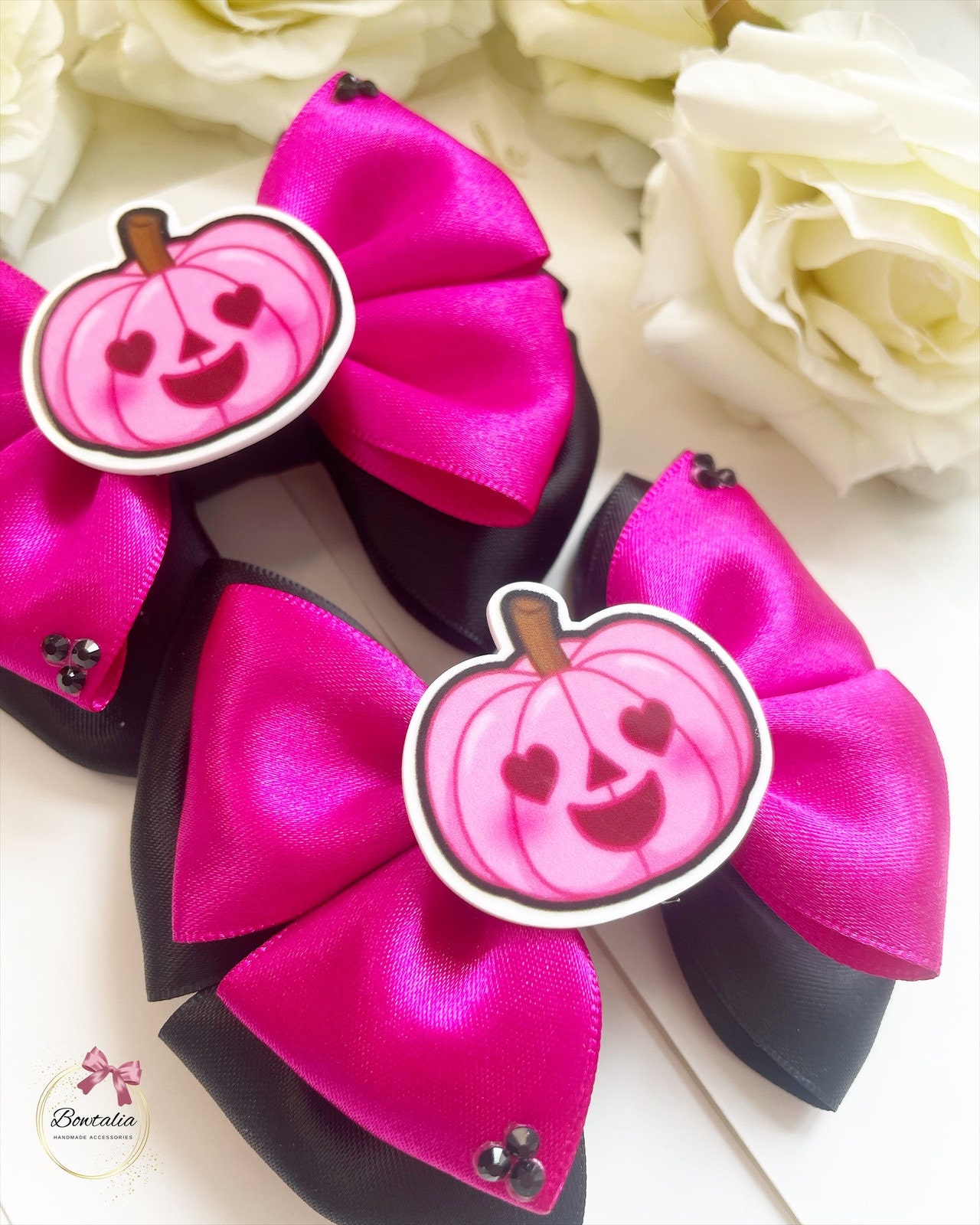Black and pink Halloween bow with a pink pumpkin centre and black gem details. Perfect to match with a halloween outfit.