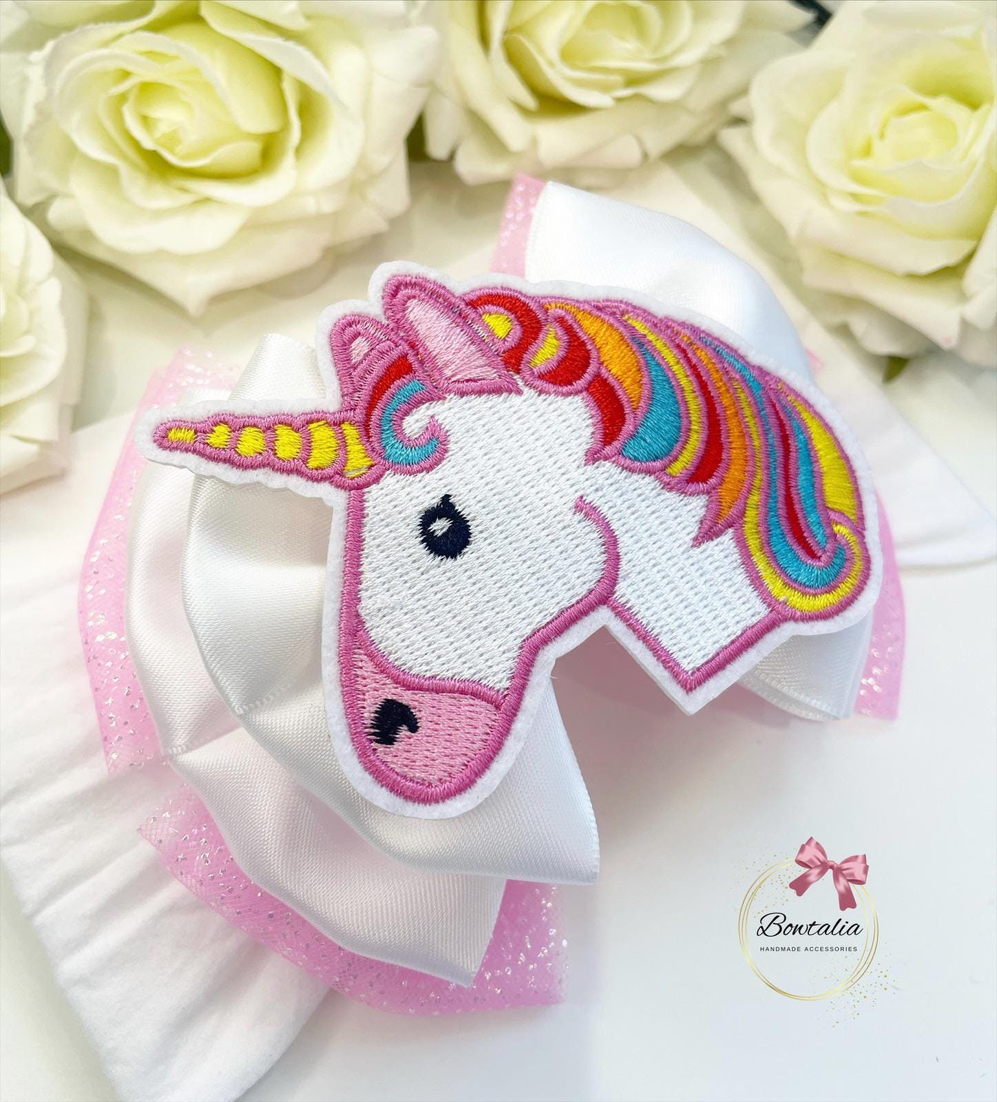 Beautiful handmade 3 layer bow with a unicorn embroider patch - attached to a thick white nylon headband. Perfect for birthdays and events.